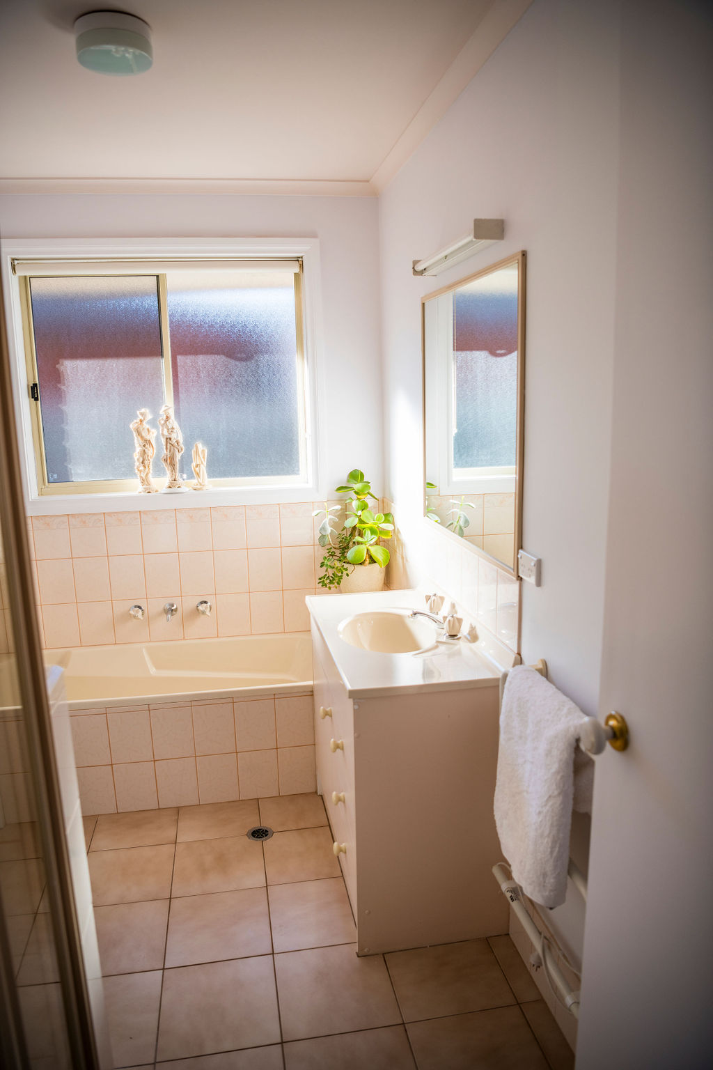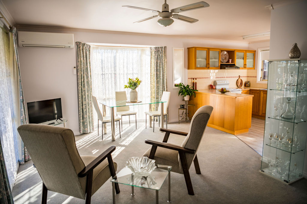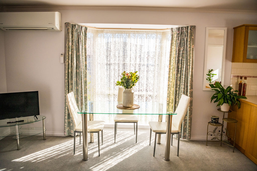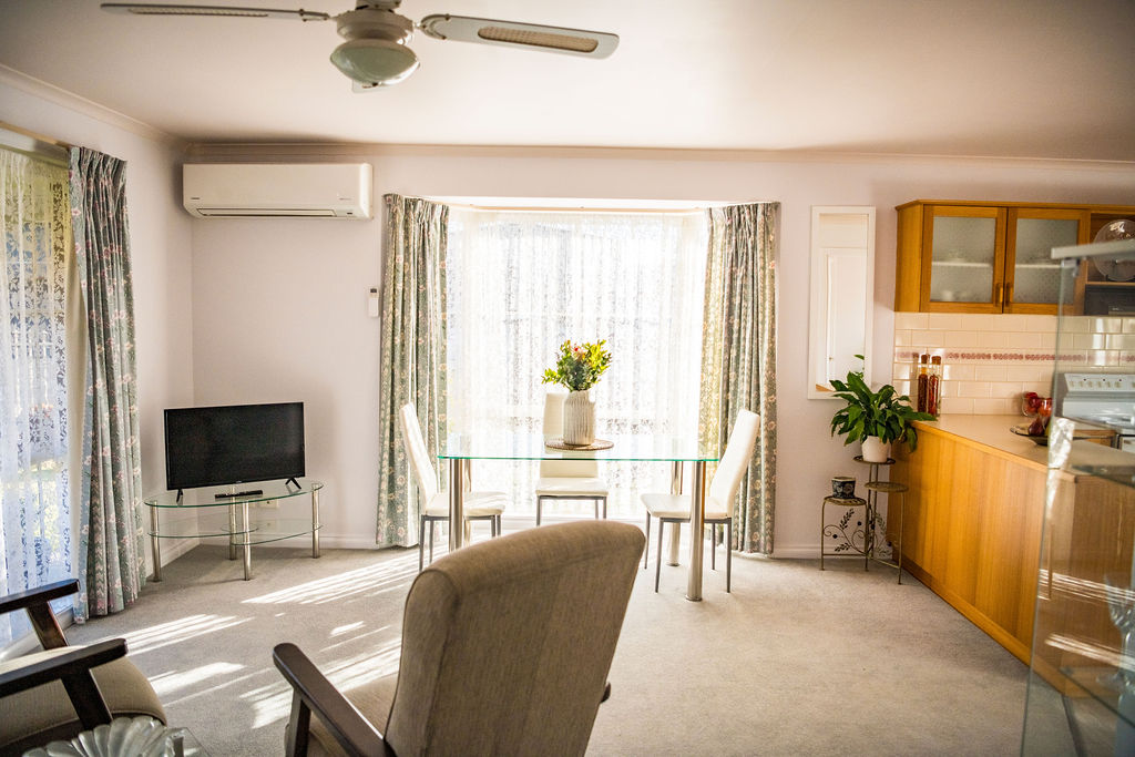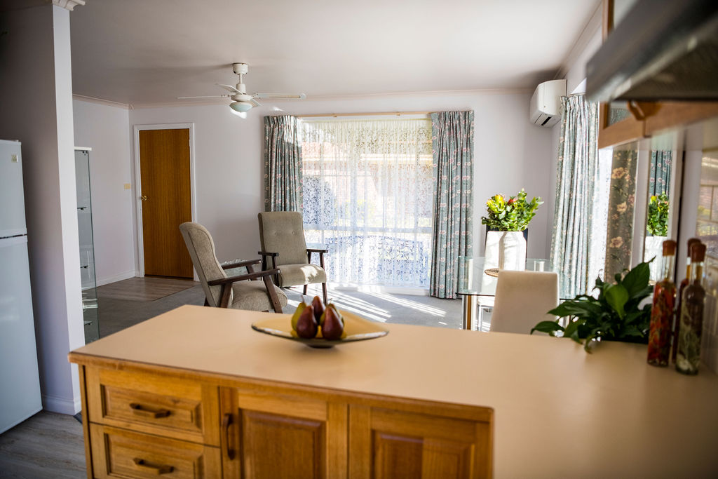 A spacious open plan living area boasts an appealing bay window which allows sunlight to stream in, a split system reverse cycle air conditioner, natural gas heater & ceiling fan