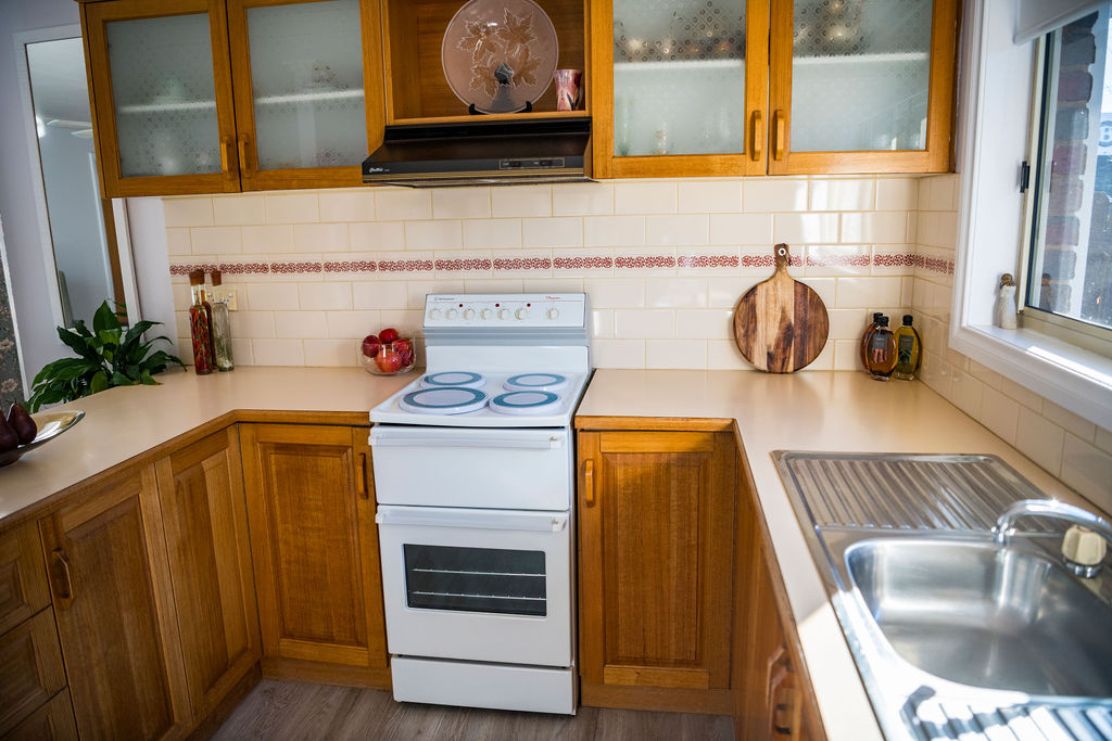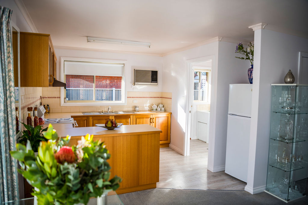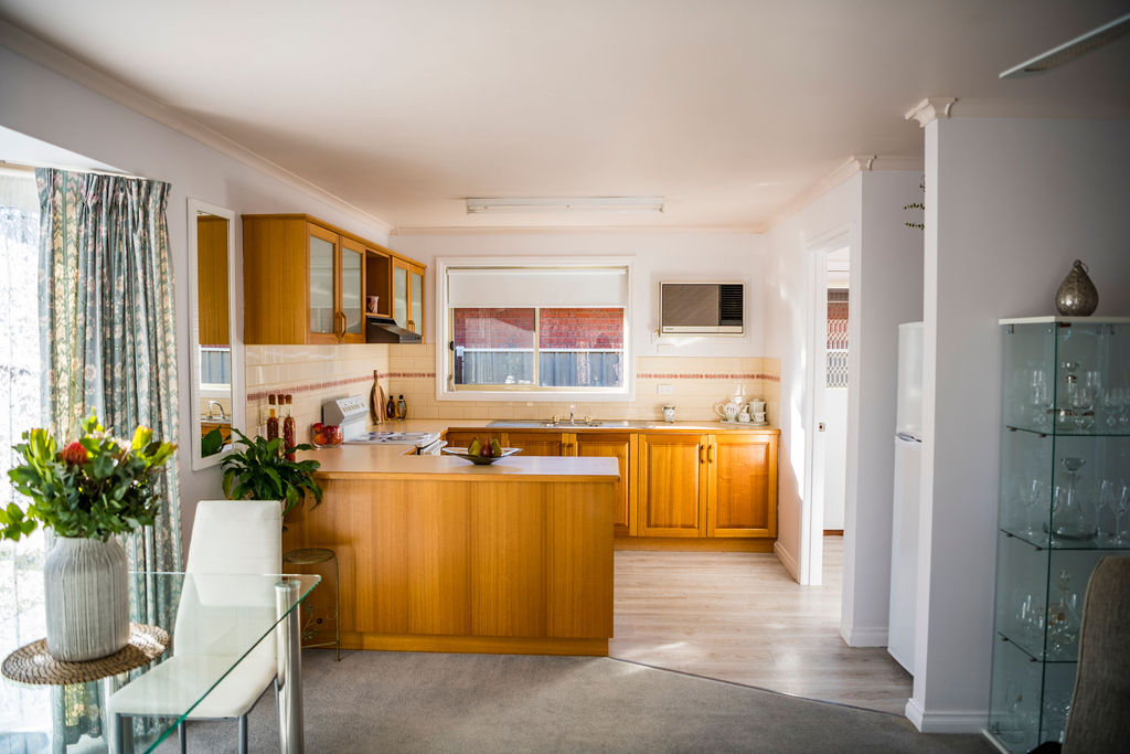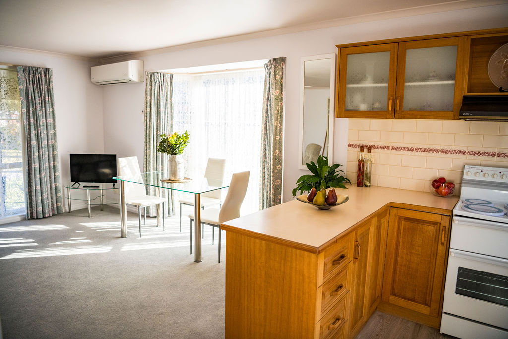 The timber kitchen offers electric cooking and an air conditioner