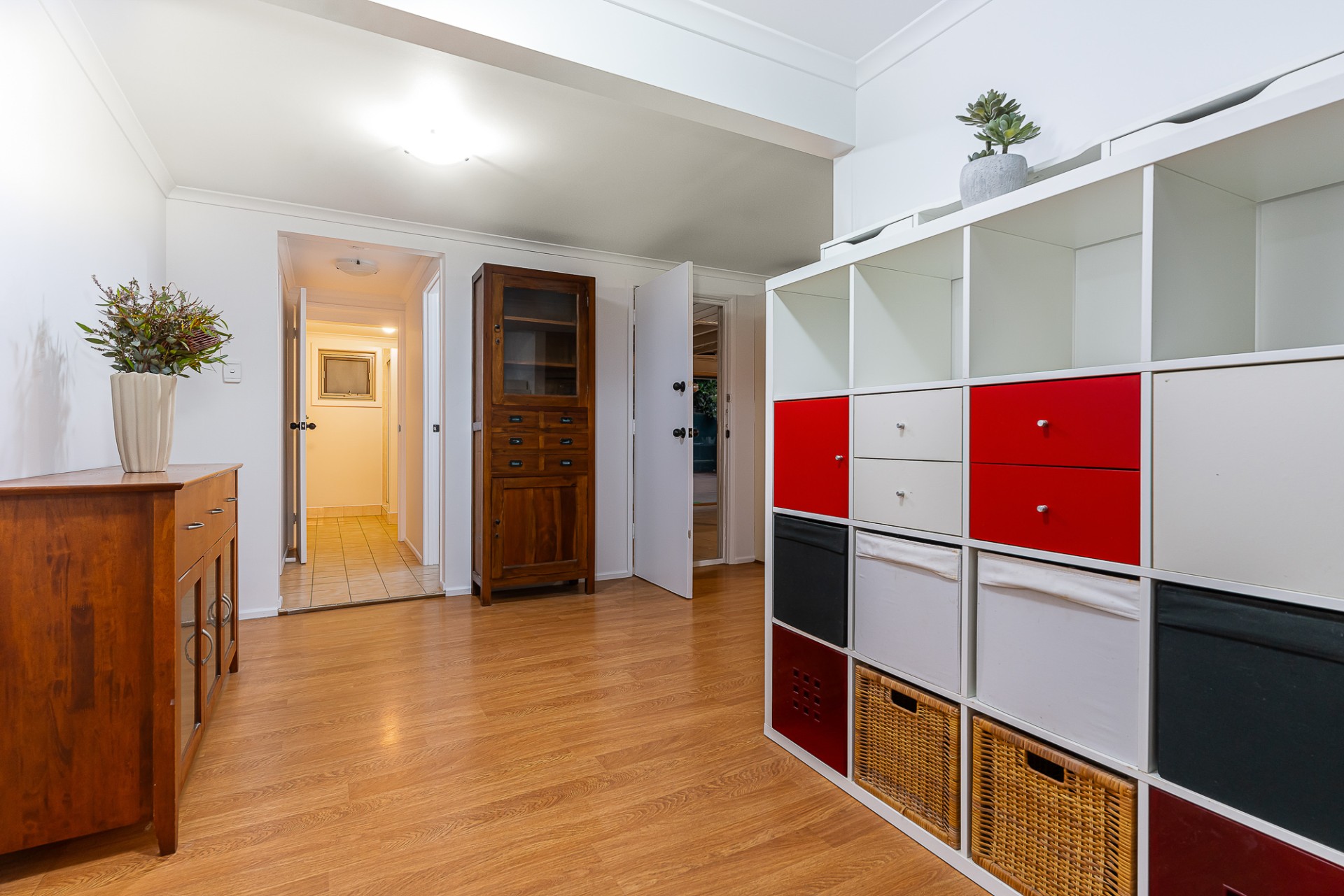 Downstairs can be accessed from the main entry or through the separate entrance at the front. It has a large rumpus room, full sized kitchen with gas cooktop, three multipurpose rooms, all with built-in storage cupboards and a separate bathroom and toilet offering dual living potential. Timber floorboards installed throughout makes it easy to maintain.