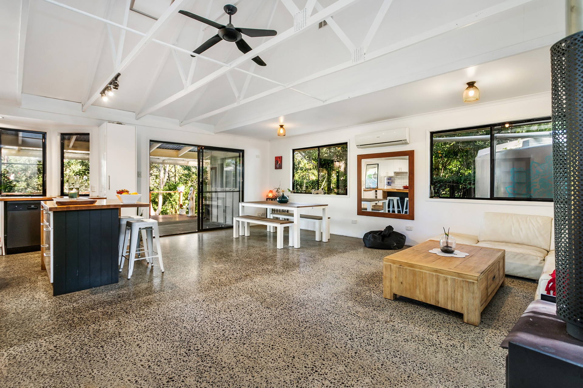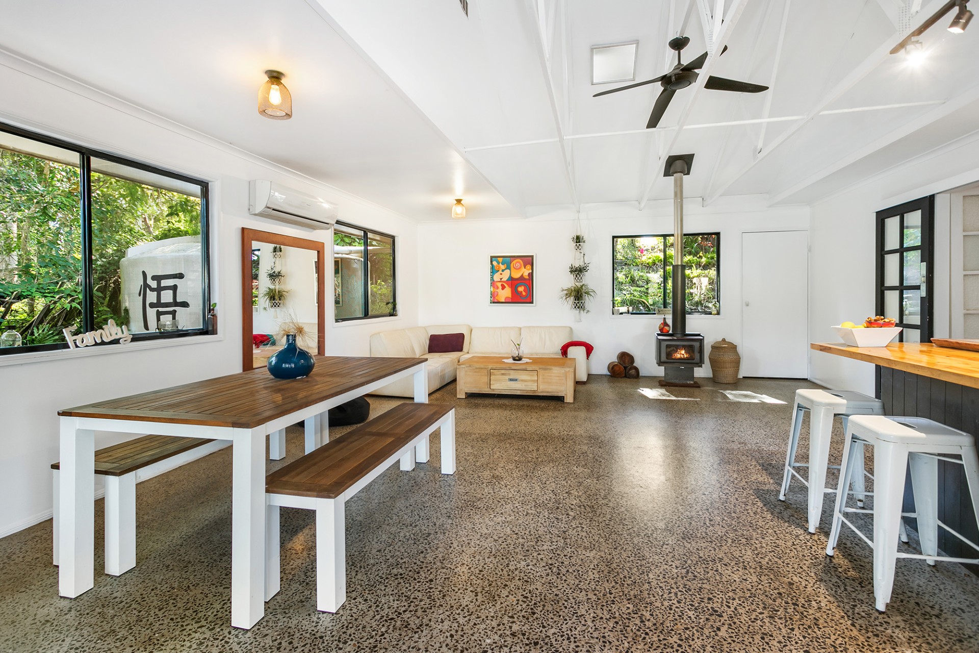 The home has been done with taste and it boasts polished concrete floors for easy maintenance, a chefs kitchen, wood heater, reverse cycle aircon, an office with built-in shelving, a second toilet and a modern bathroom with a fantastic water friendly bath and shower.