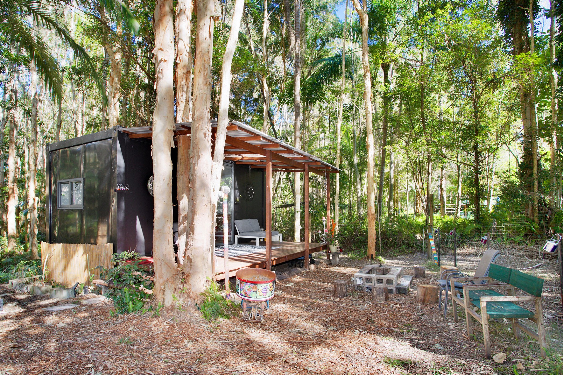 At the bottom of your property you have your own Melalueca Forest and nestled amongst the forest is a secluded 6m x 3m off grid Depot. It is complete with a 2.4m x 6m deck along the front of it to kick back around the fire and look back up your property. This is a perfect glamping sanctuary without leaving home. Other purposes could be a teenage space, man-cave, home-based business(especially in the fields of holistic health) the opportunities are endless.