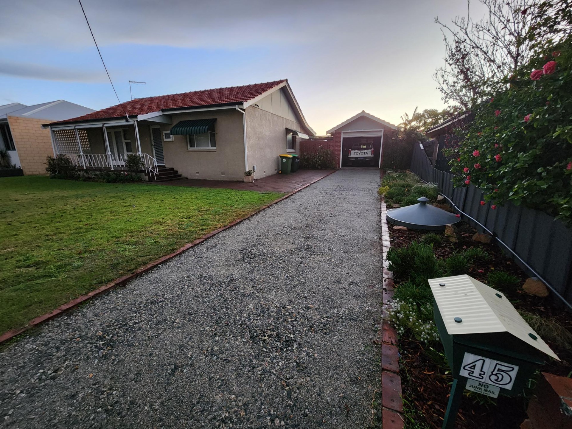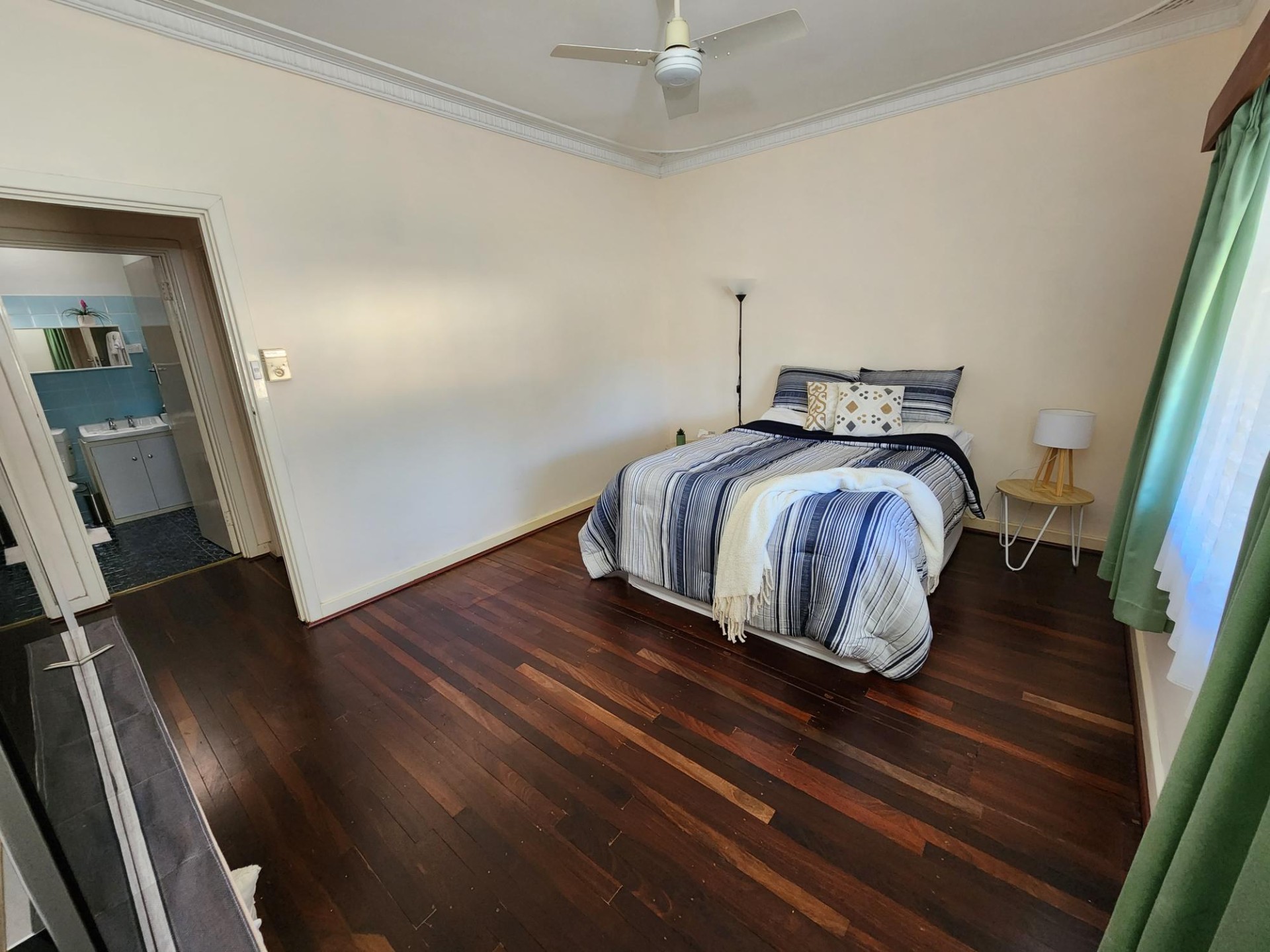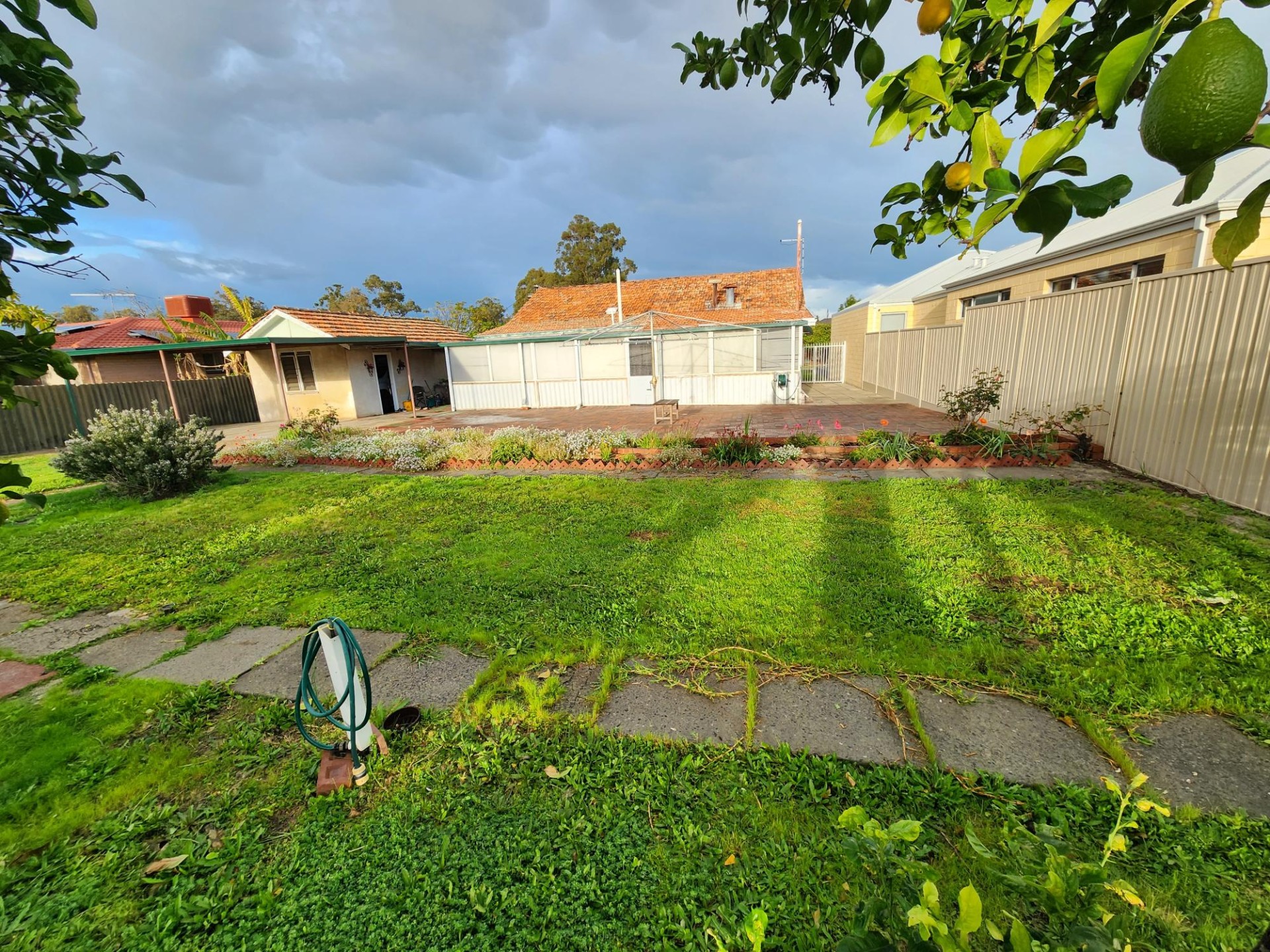 The house is brick and tile construction with polished jarrah floors and high ceilings and is of very solid construction. It has two large bedrooms and a smaller sleep out bedroom or study. 1 bathroom which has a toilet and there is another separate toilet.