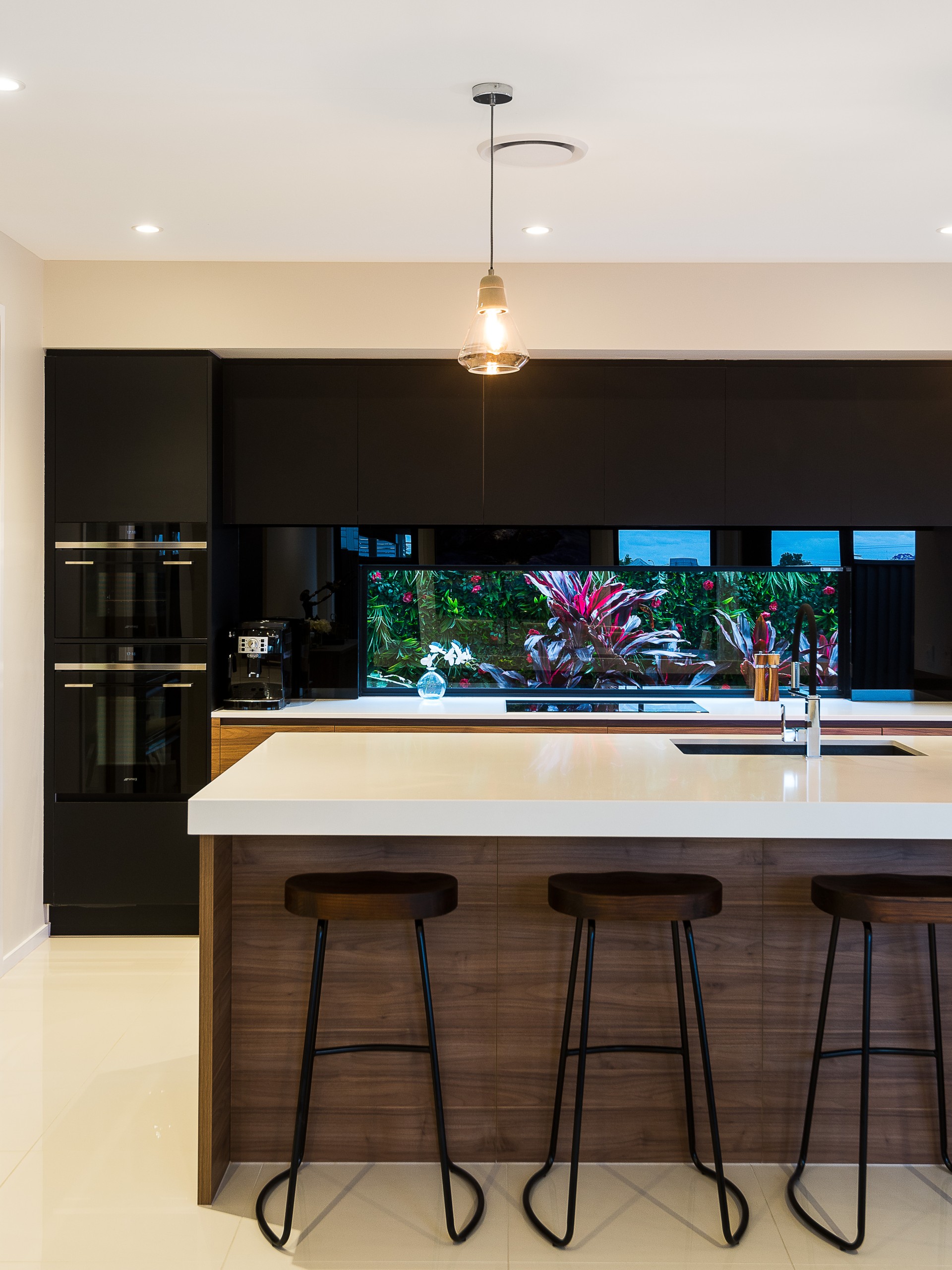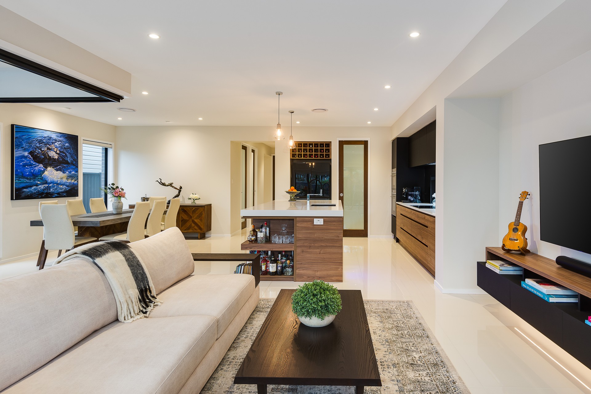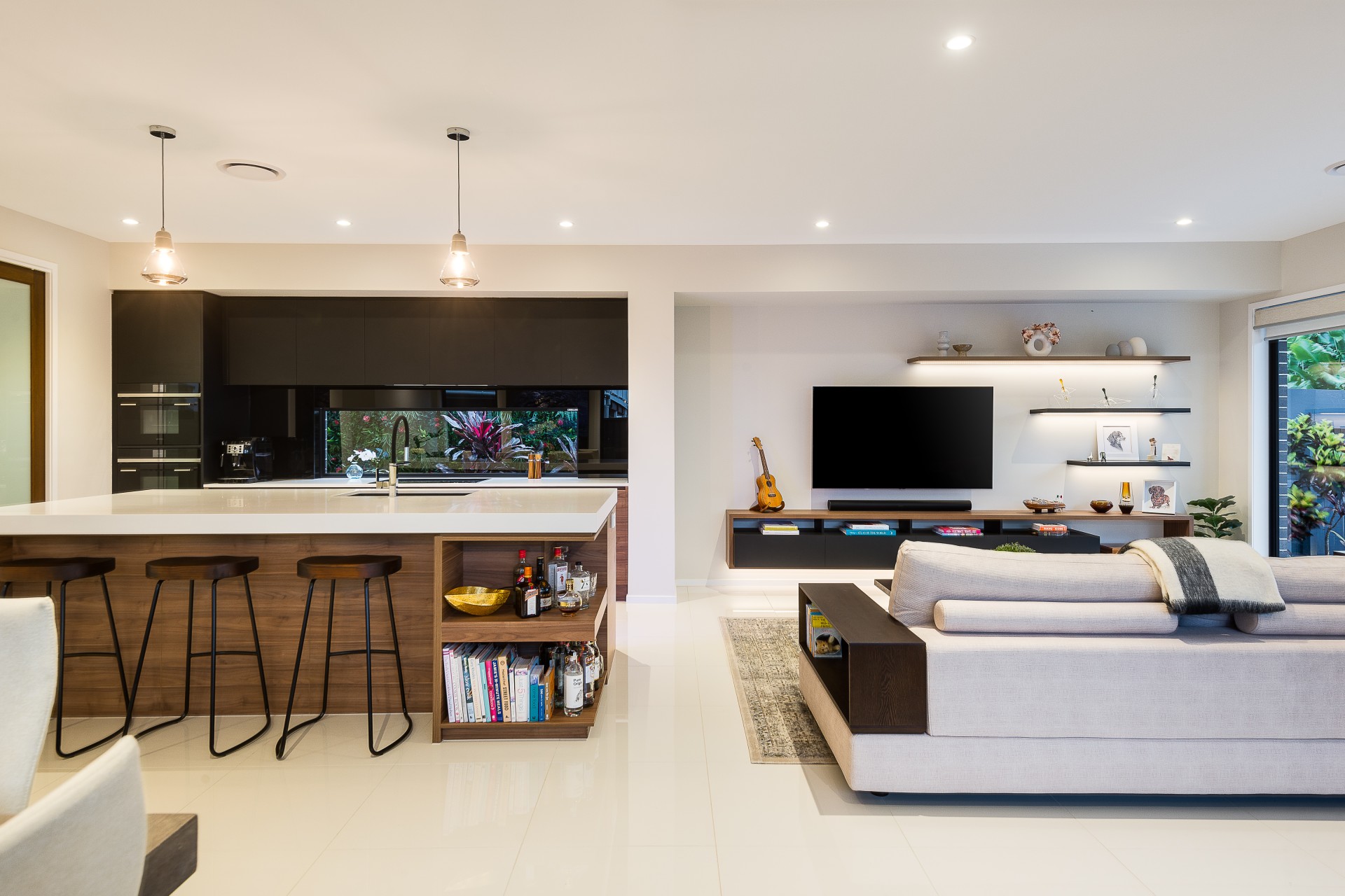 Crisp detailed styling merges flawlessly with natural materials to provide an air of luxury throughout the expansive layout. Flowing from the entrance and throughout the lower level, pristine oversized porcelain-tiled floors and high ceilings amplify the space and natural light with zoned and ducted air-conditioning bringing year-round comfort.