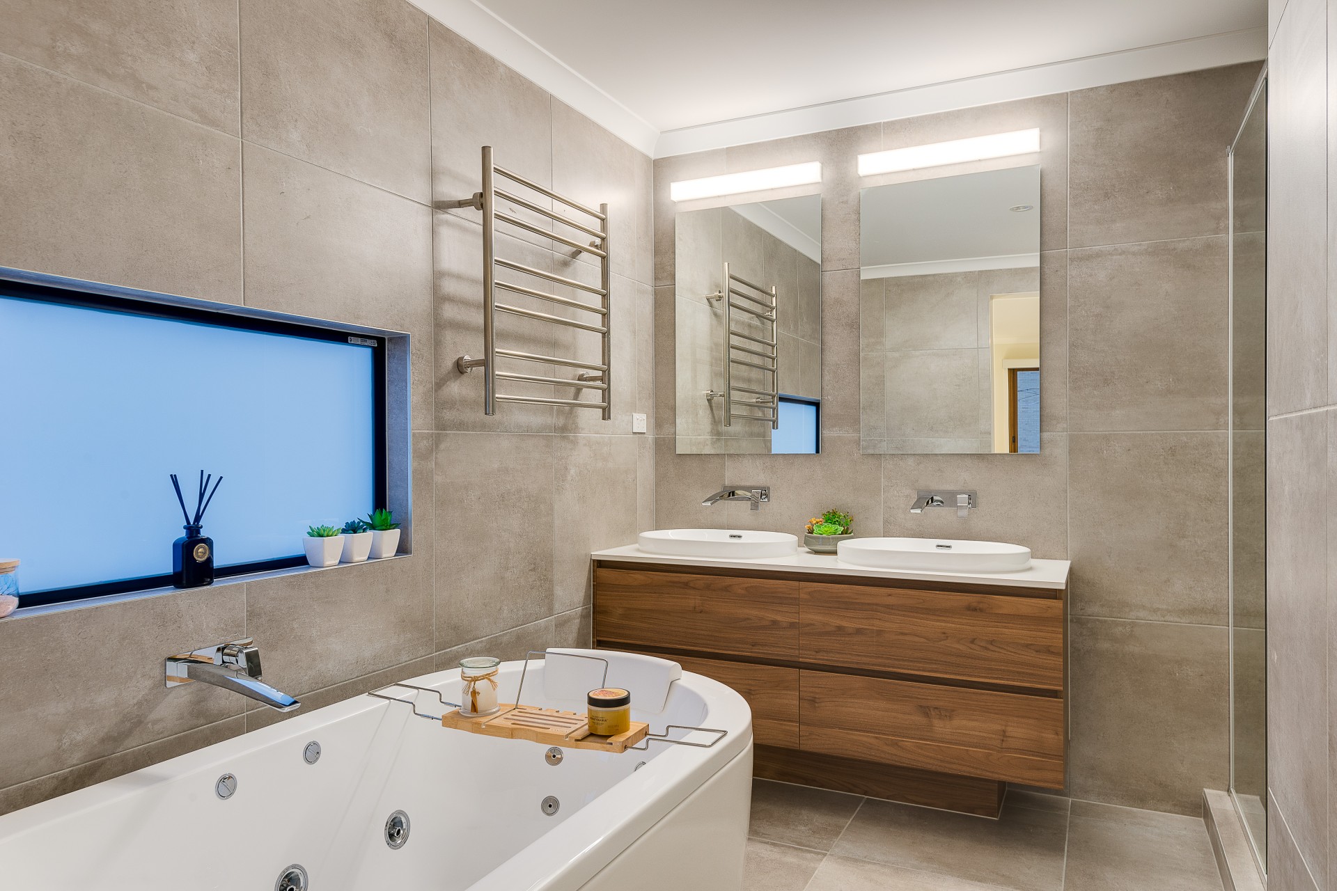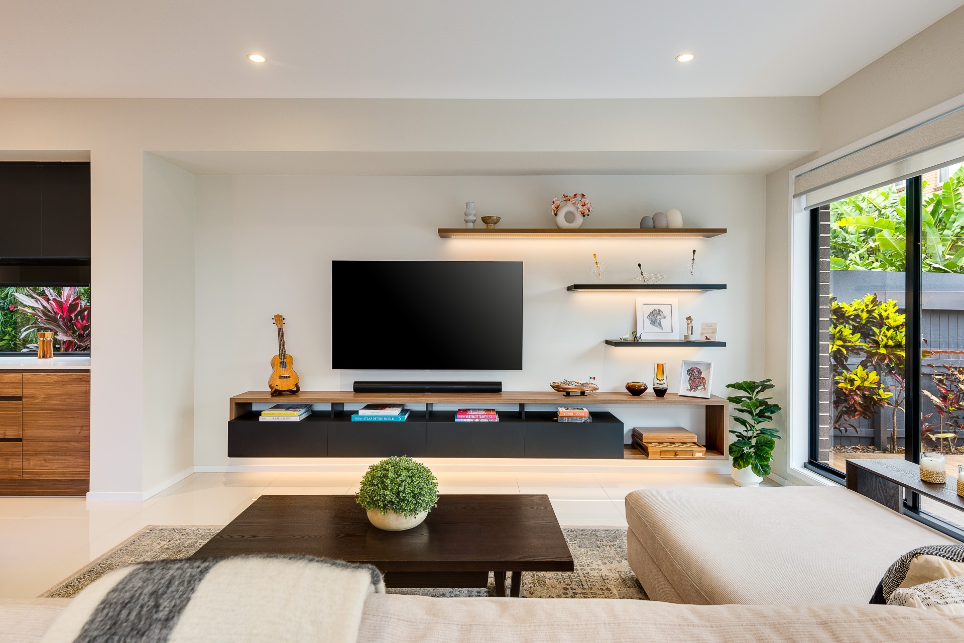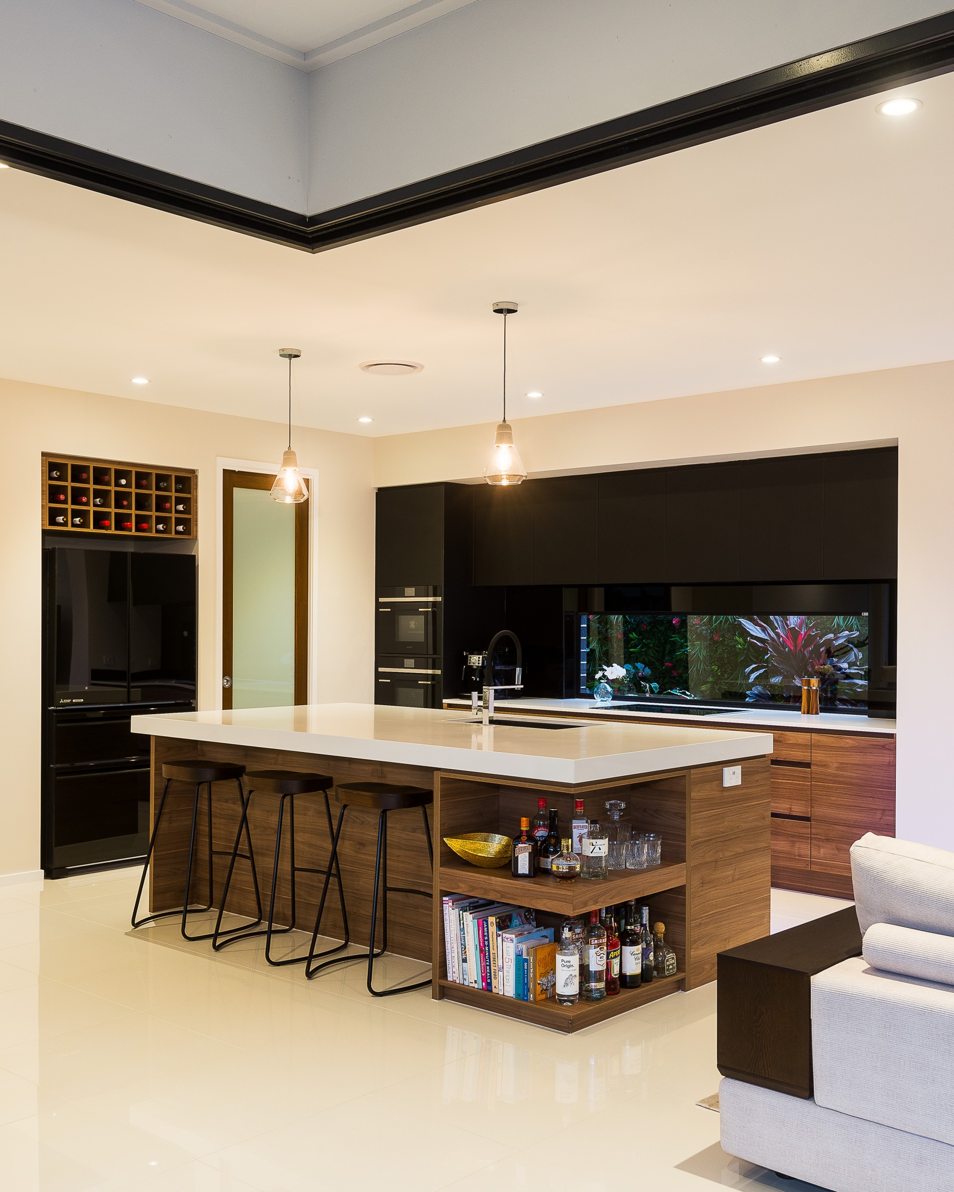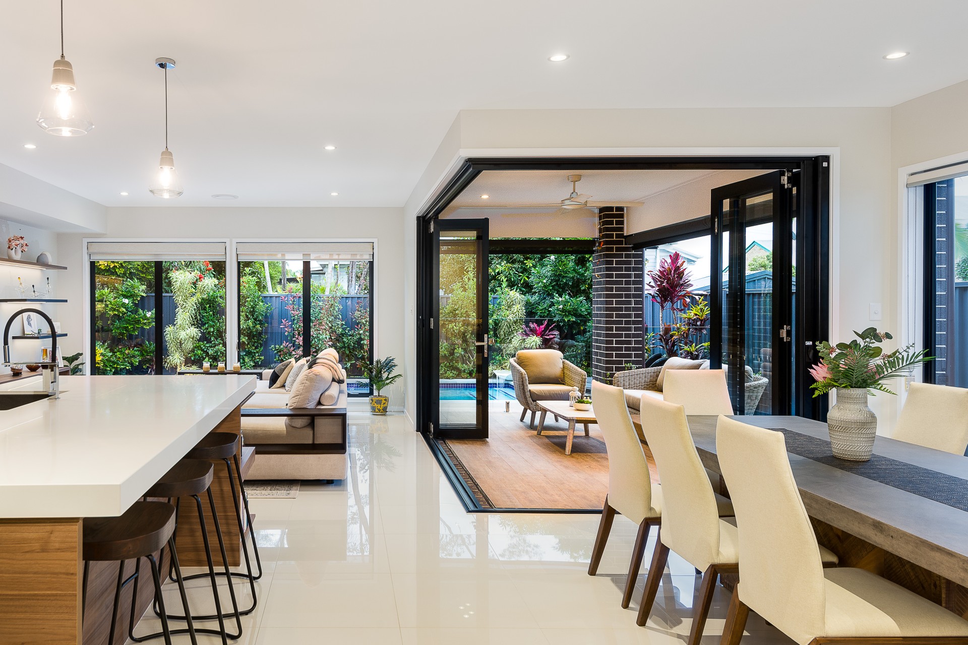 Crisp detailed styling merges flawlessly with natural materials to provide an air of luxury throughout the expansive layout. Flowing from the entrance and throughout the lower level, pristine oversized porcelain-tiled floors and high ceilings amplify the space and natural light with zoned and ducted air-conditioning bringing year-round comfort.