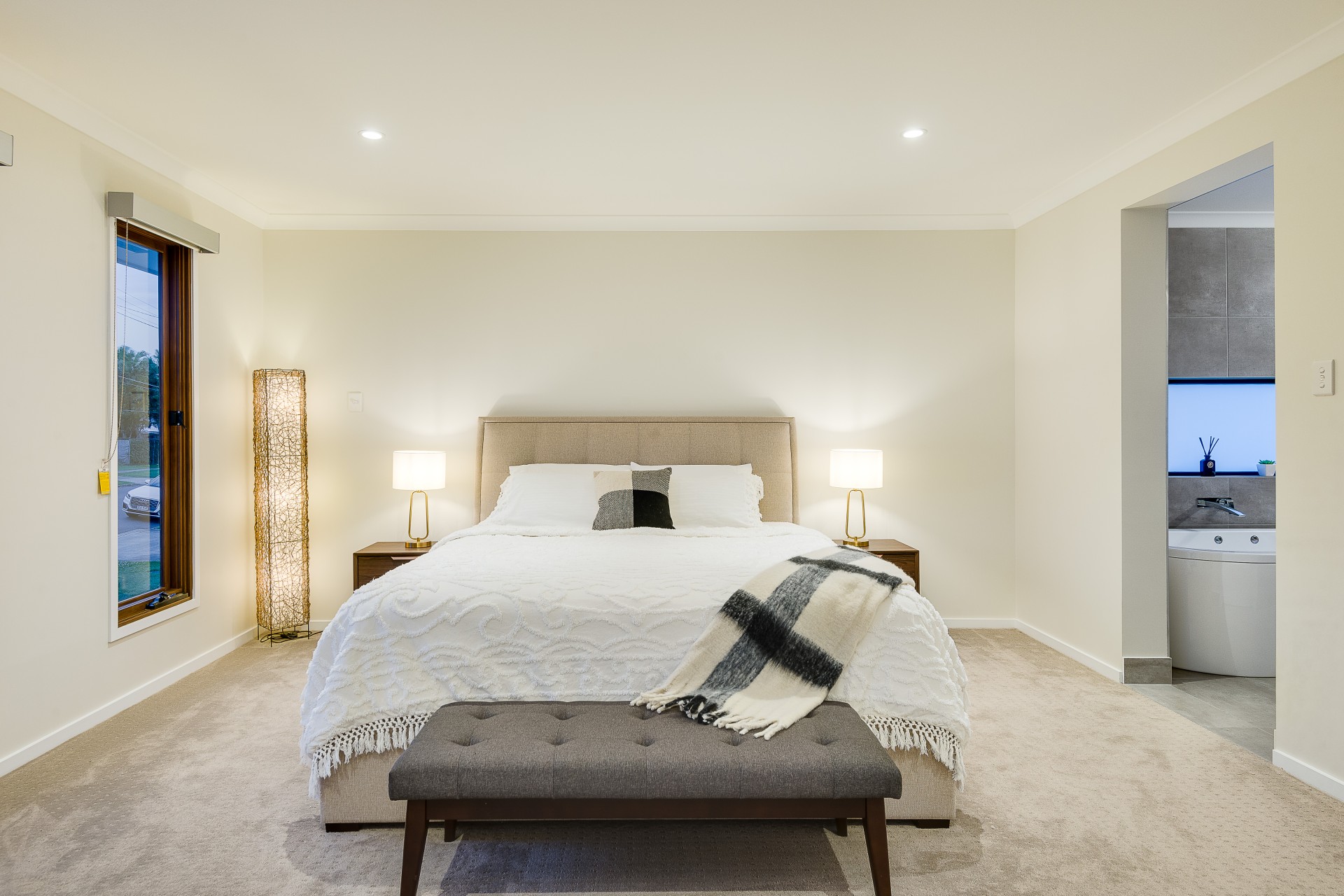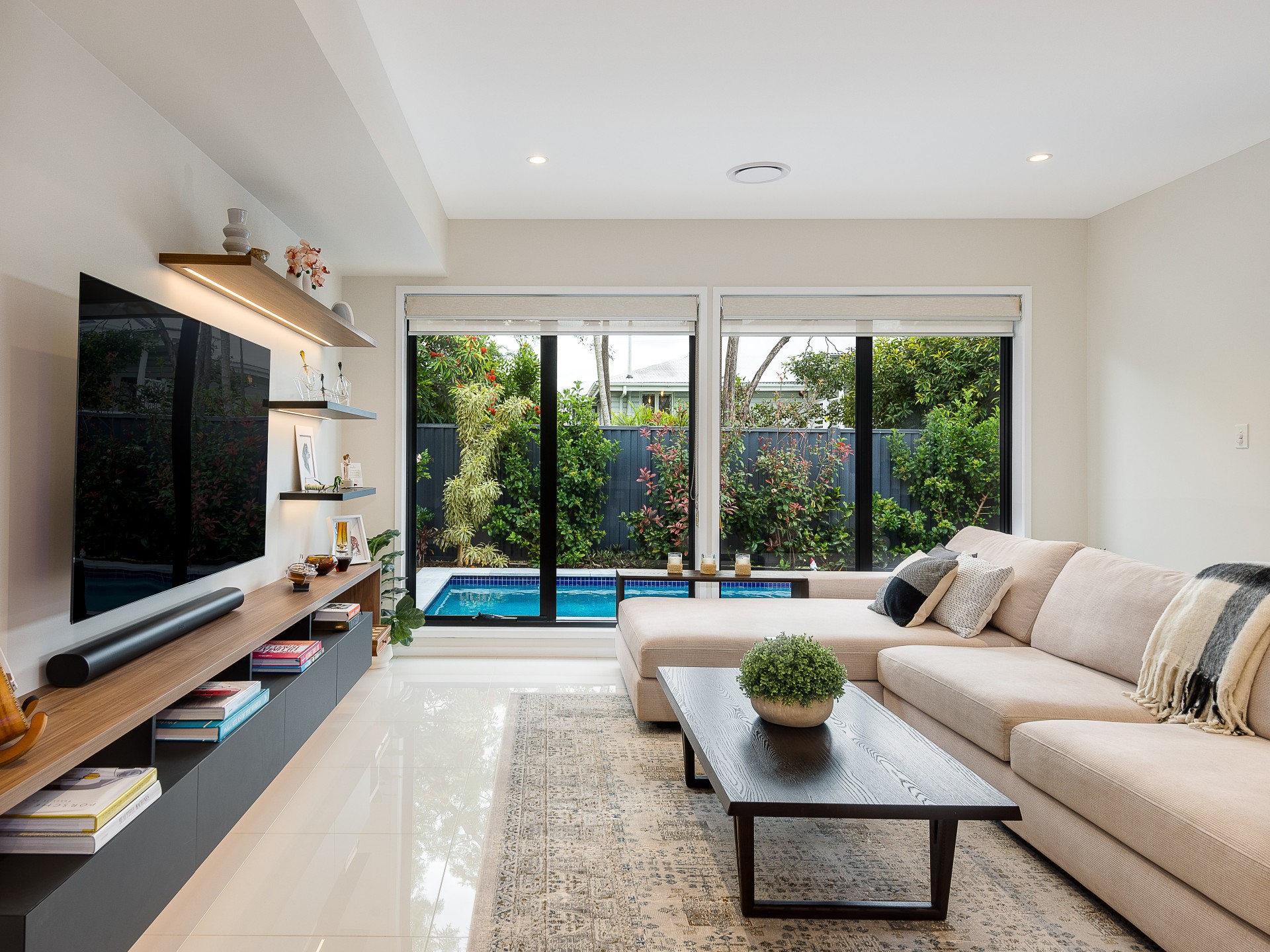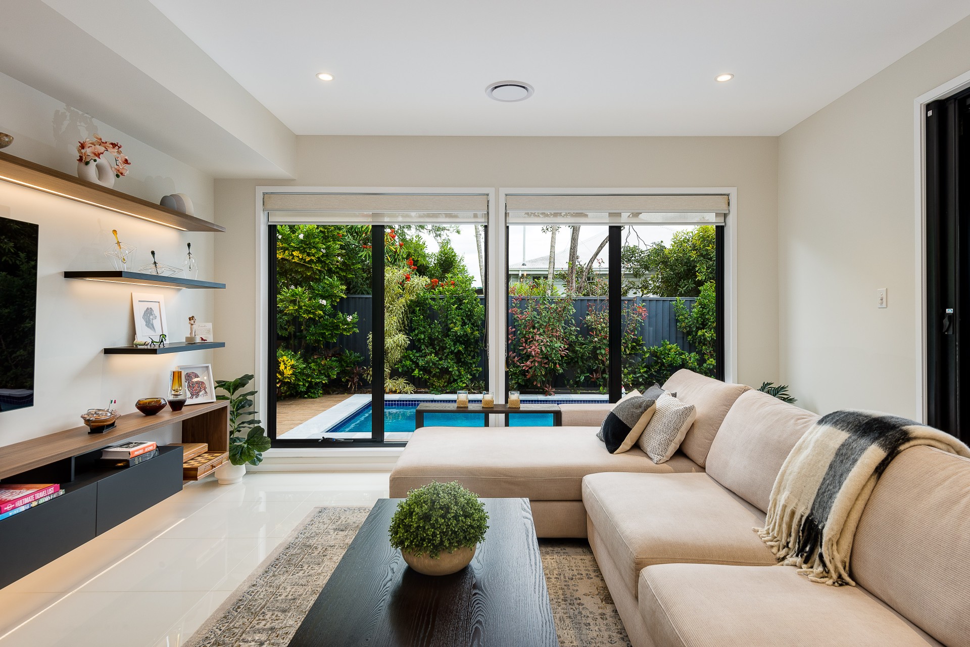 Corner-less bi-fold doors with retractable flyscreens open up the living space to premier outdoor entertaining. A covered patio stylishly tiled and includes pull-down blinds. Hugged by immaculate landscaping and including water features and LED lighting, the in-ground concrete swimming pool is a relaxing zone, with tropical greenery enhancing the resort vibes. The swimming pool is automated and equipped with Bluetooth connection, affording smartphone control.