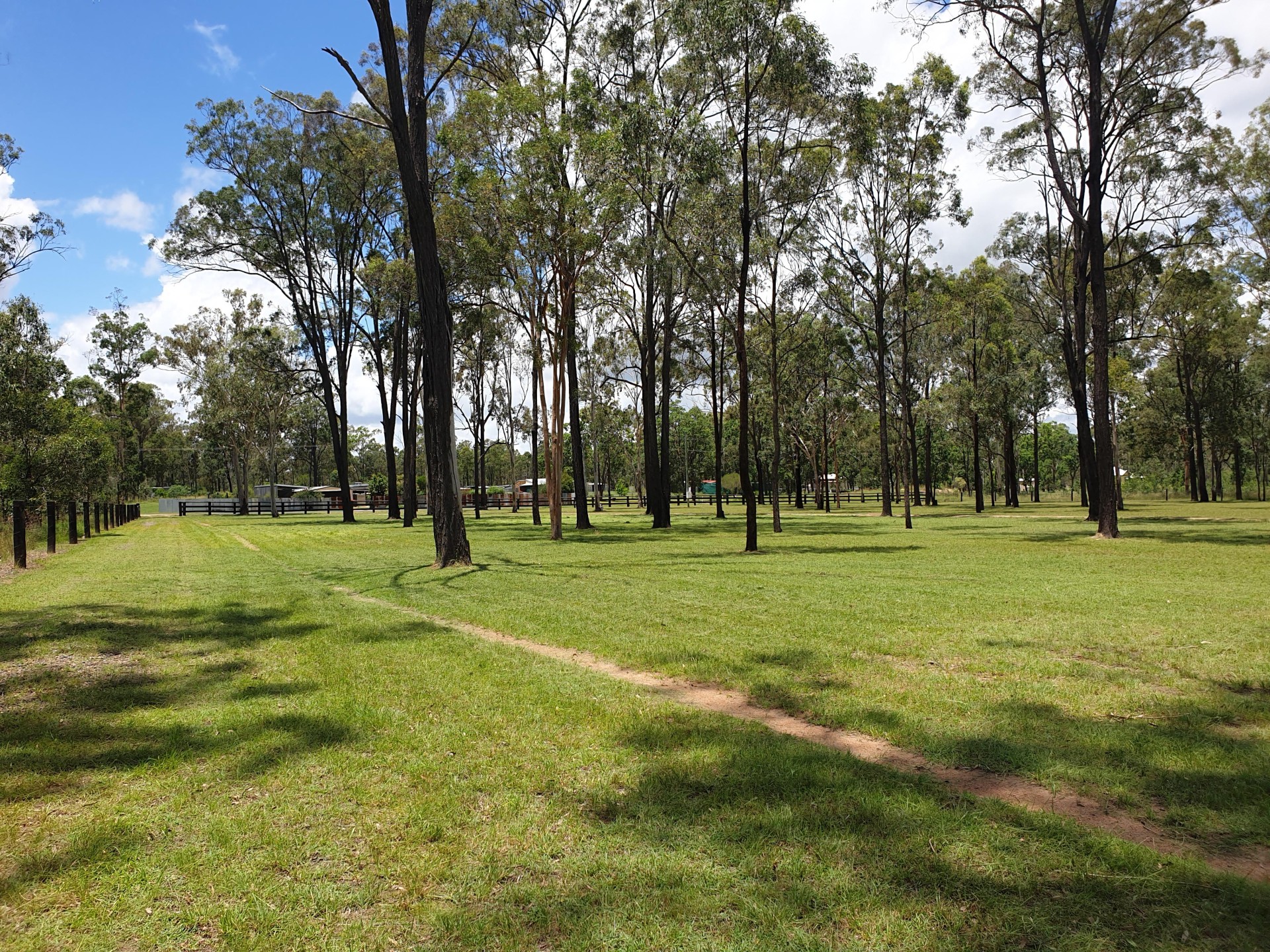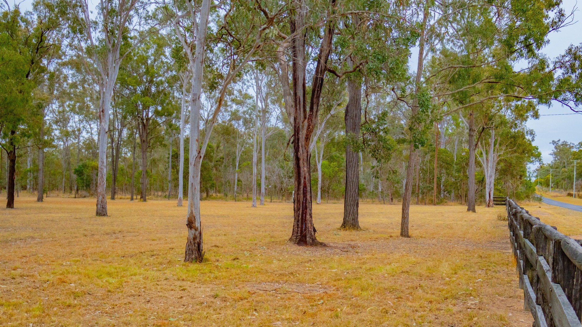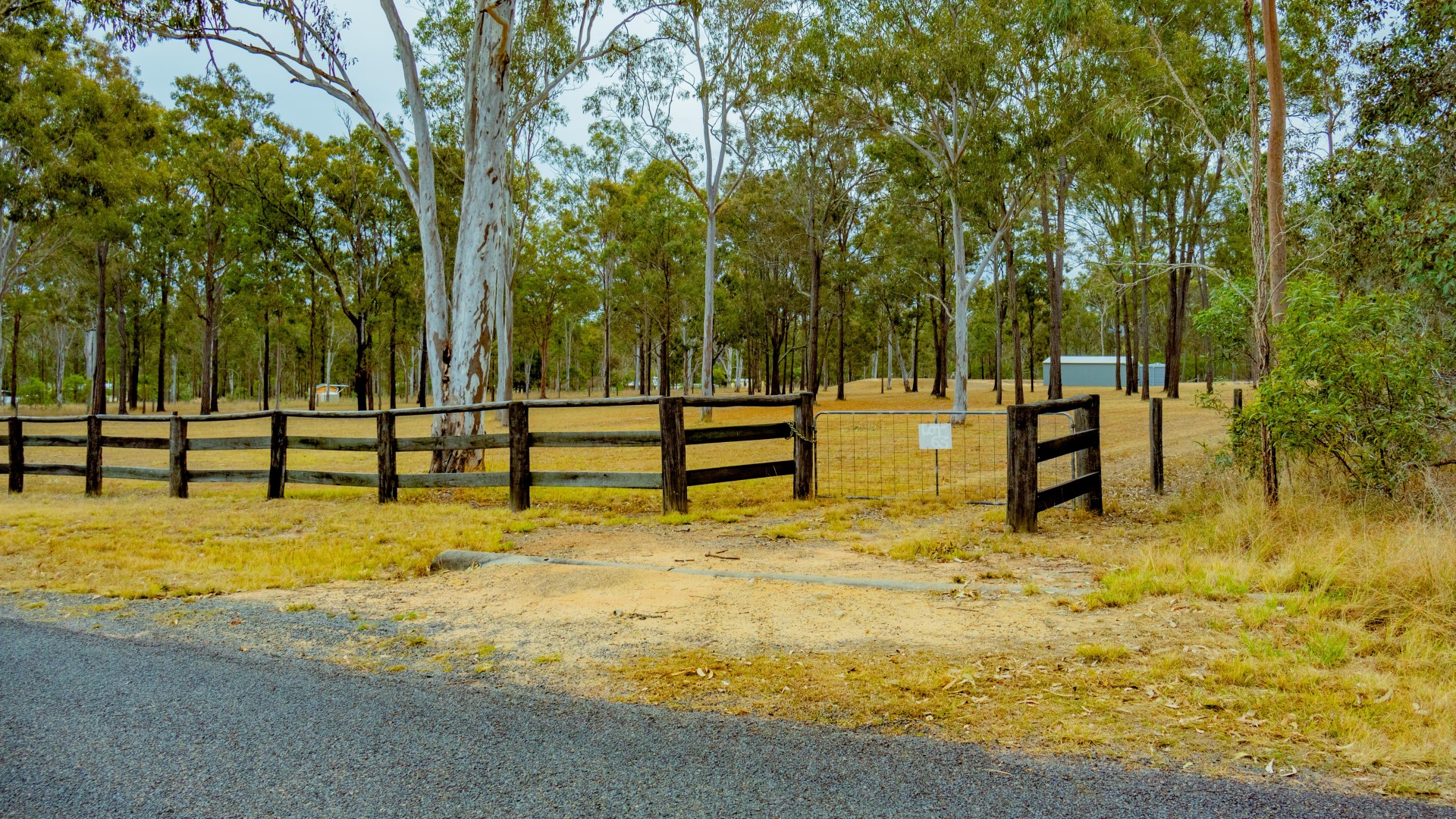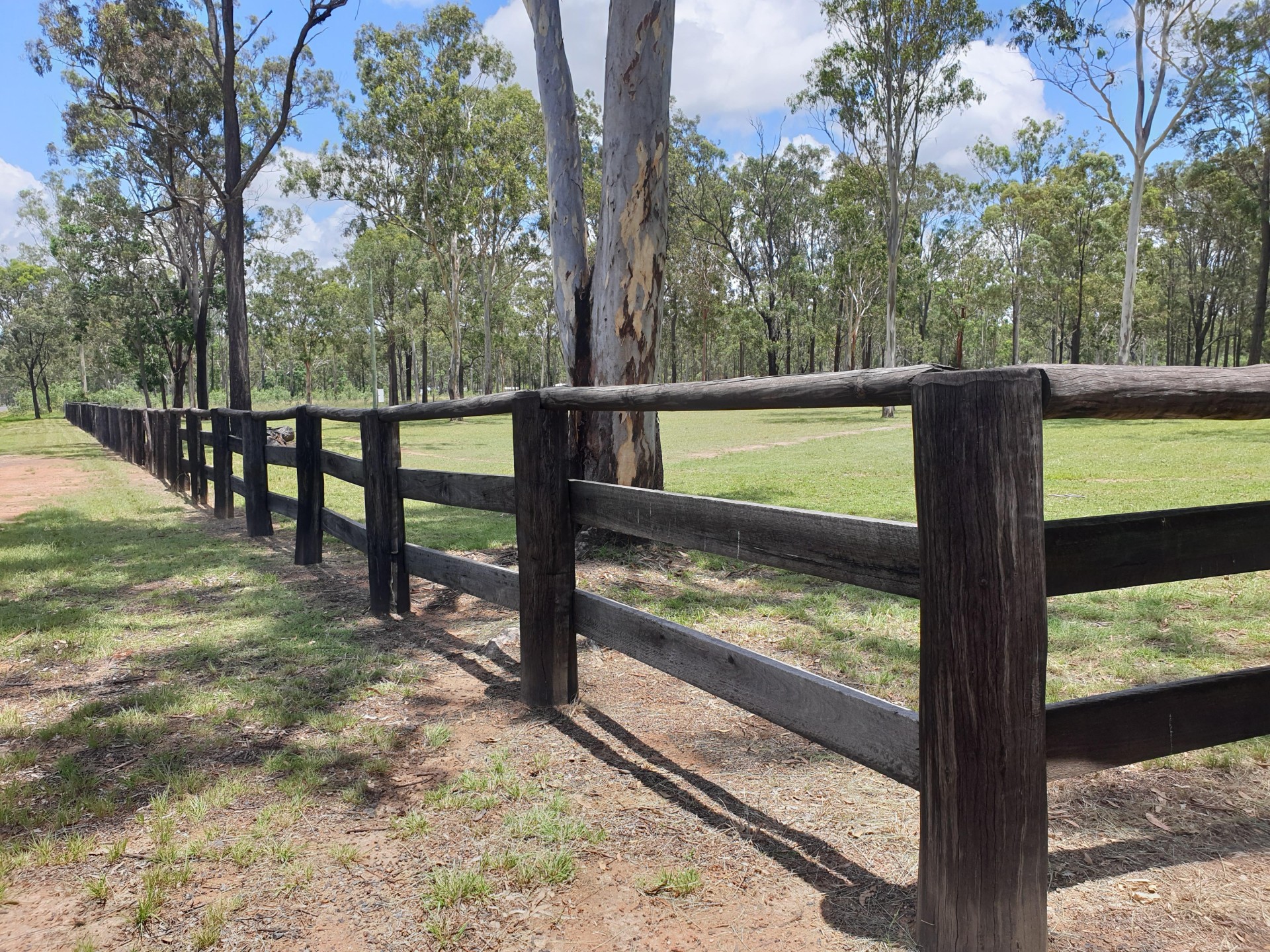 Post and rail fence on the front of the property, road side. The 3 other side boundaries are completed by hardwood posts and 5 strand plain wire.