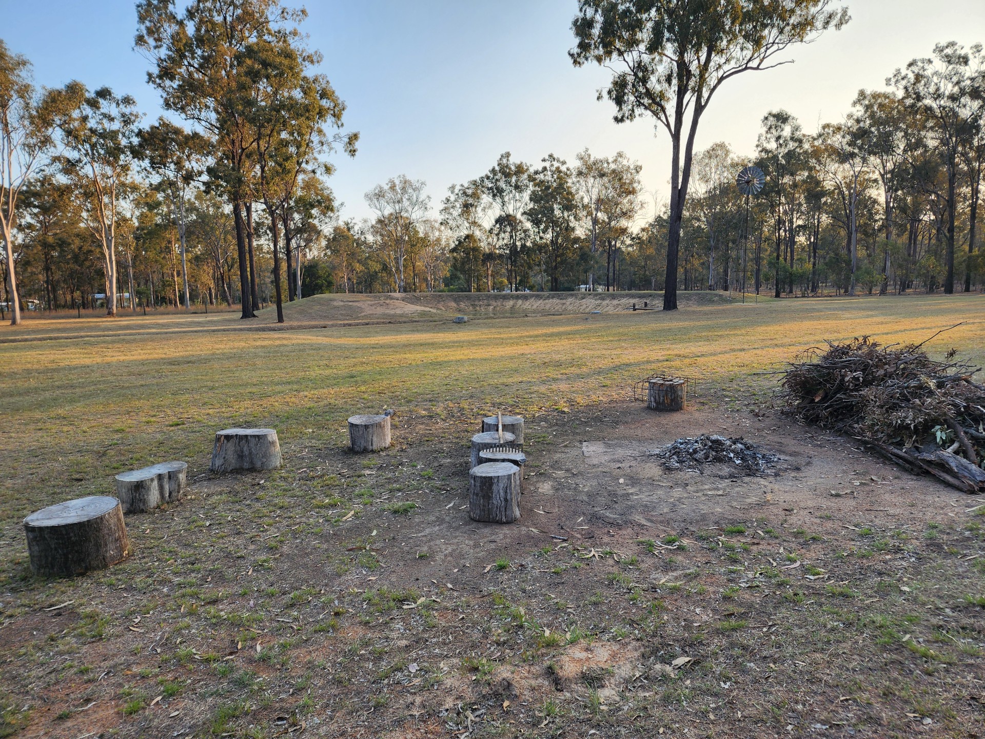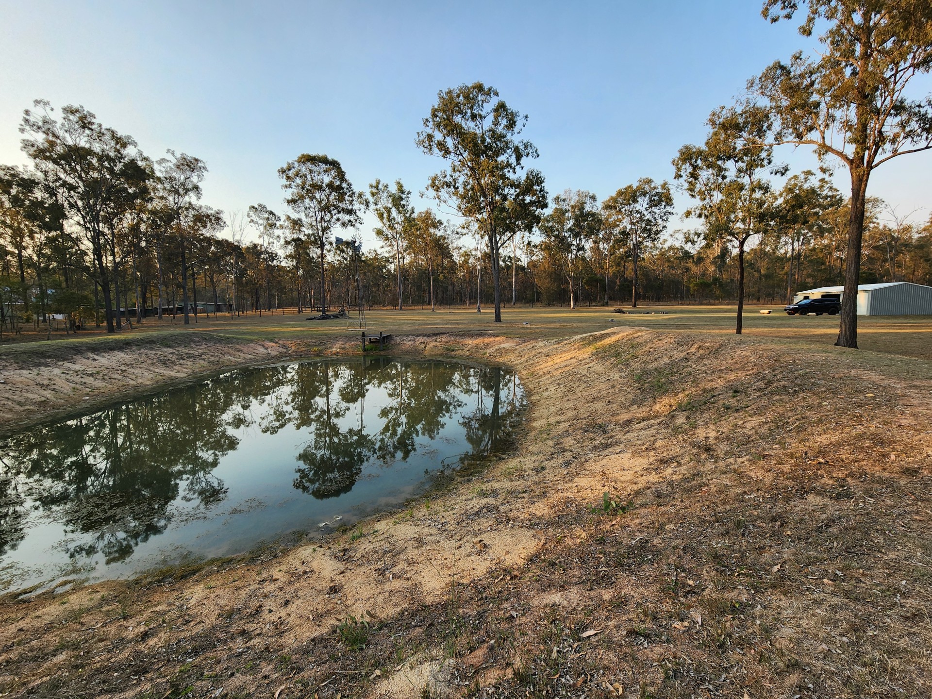 Large dam suitable for irrigating fruit trees or a garden. It is sealed naturally by the clay in the soil and does not leak. The operator who pushed the dam estimated its volume at around 2 megs.