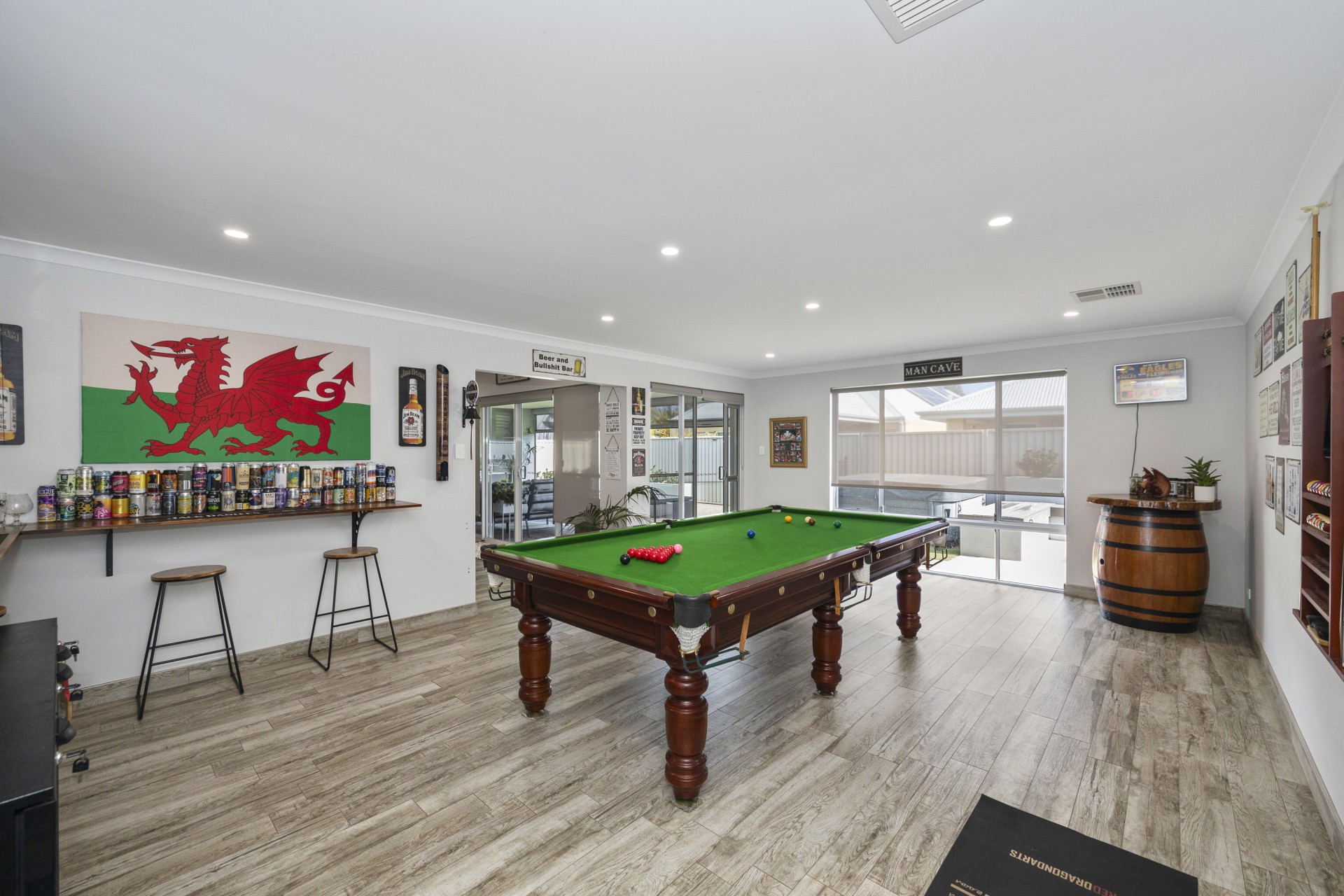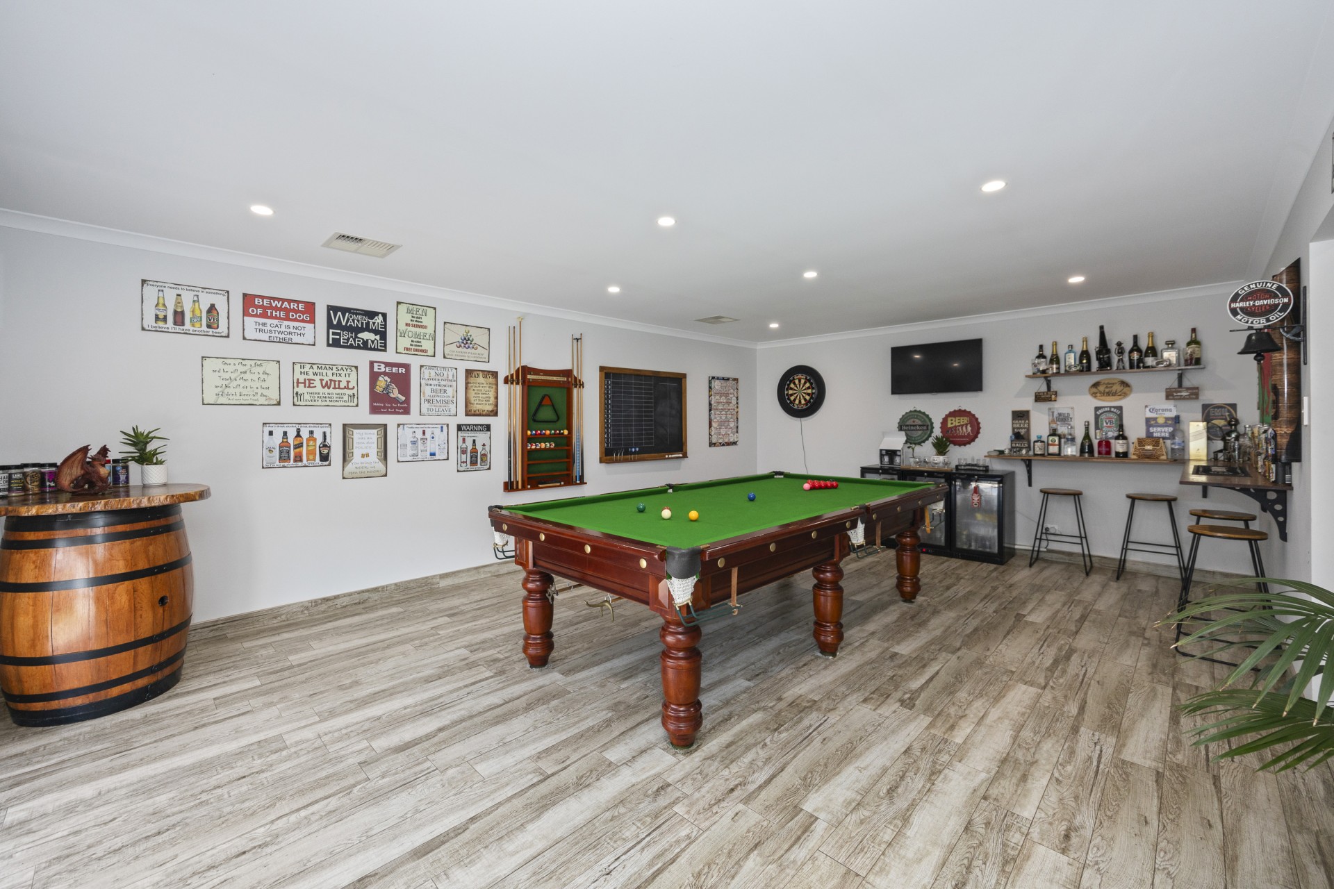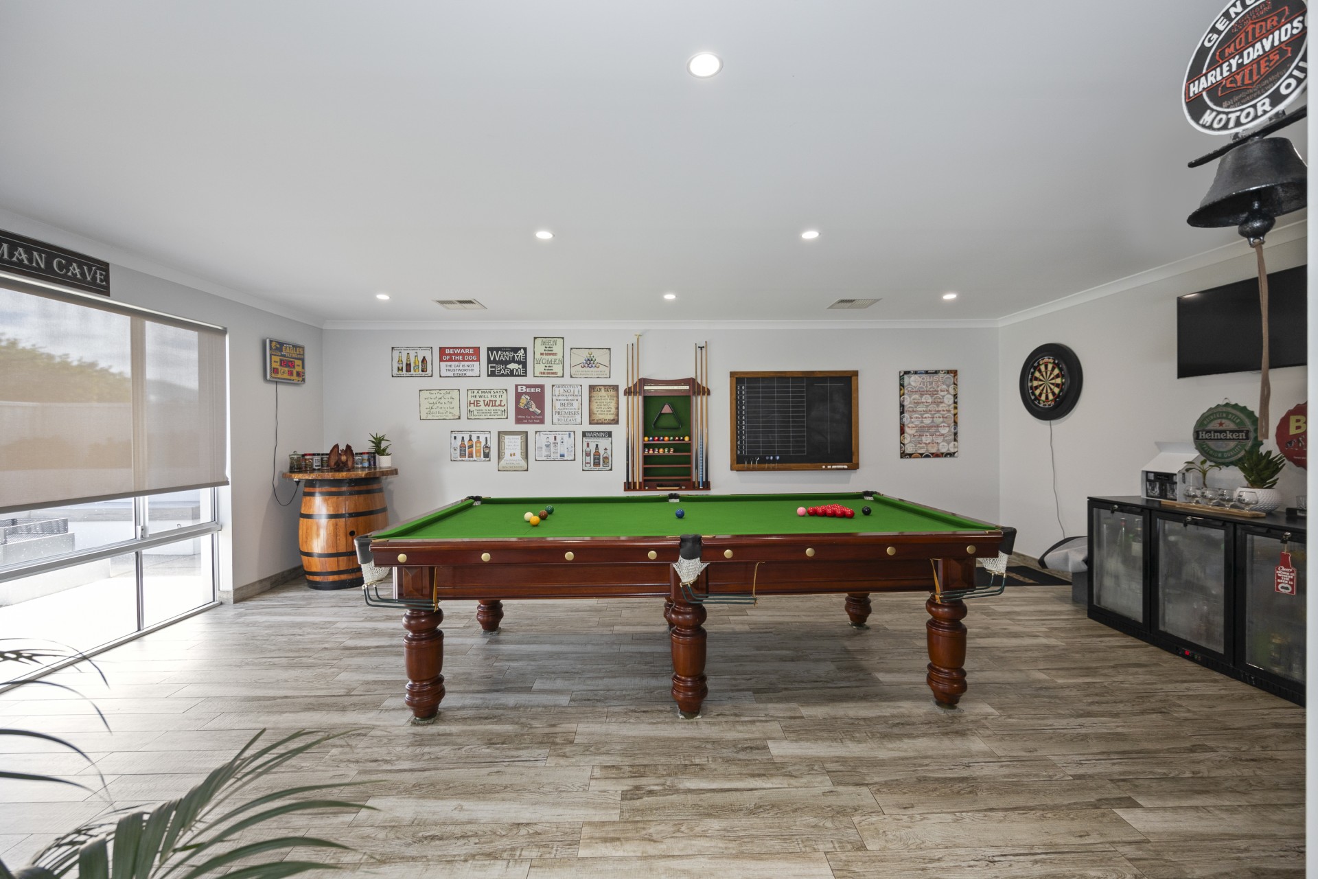 - Just off the main living area is a commodious and impressive games room, currently utilised as a man cave. With an abundance of space the room is crafted to provide the ultimate entertainment. Equipped with a snooker table, dart board and bar area, makes it the ideal place to entertain and wow guests. The spacious area allows for bountiful possibilities, a room where the list of opportunities are endless! Whatever you choose the vast space allows for plentiful ideas.