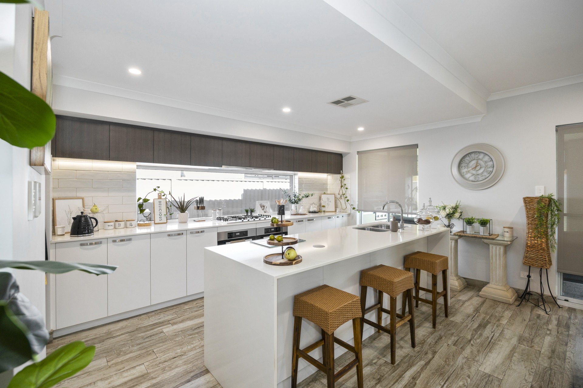 - The kitchen is equipped for a chef, with a stunning waterfall kitchen island, providing the ideal space for cooking and seating. An extended tinted window runs along the kitchen bench above the stove to create an open space and make use of the natural light, equipped with ample storage and Miele appliances! Not one but two ovens it's the perfect addition to a spacious kitchen.