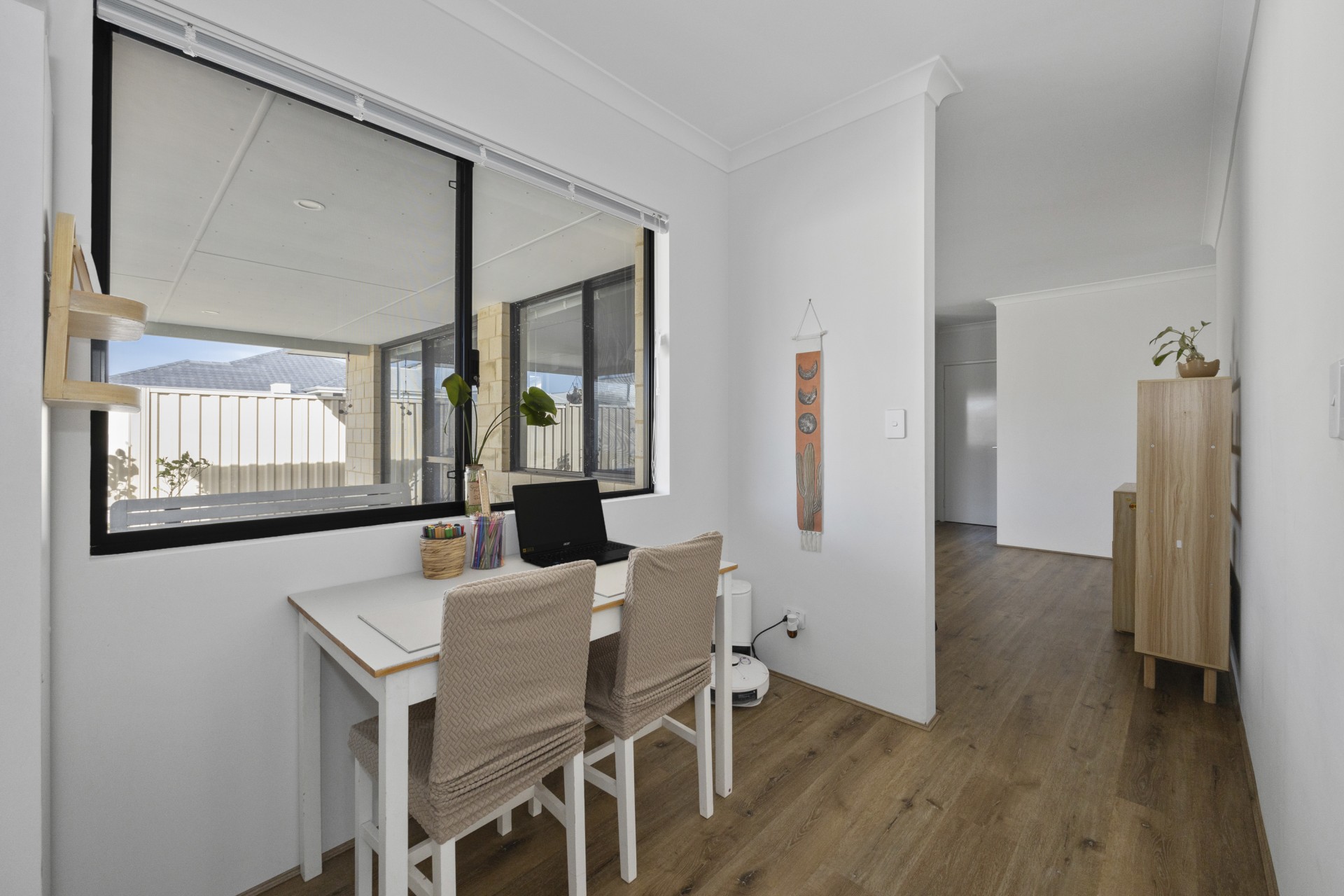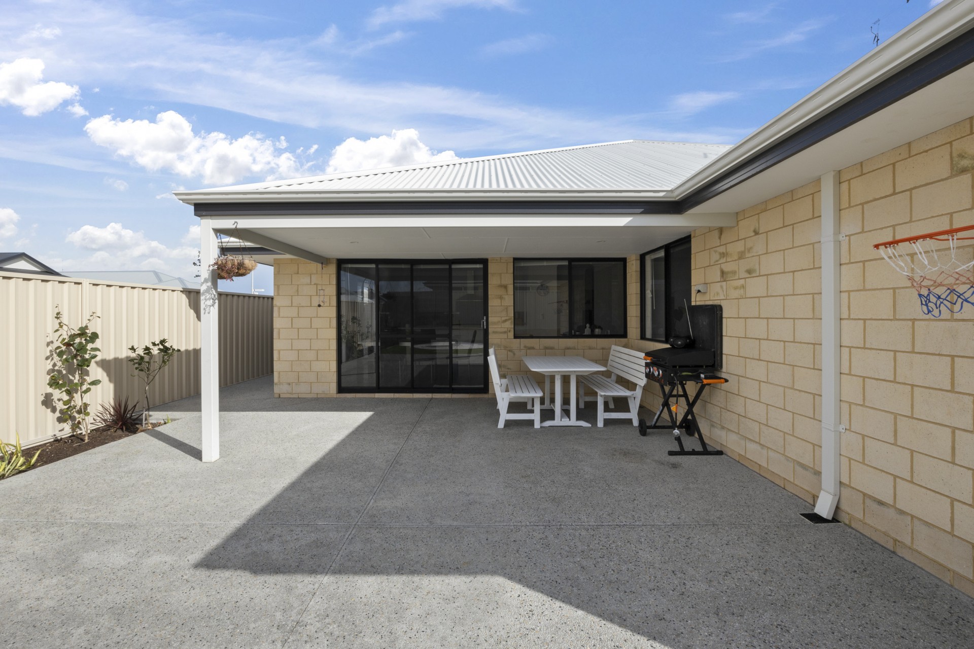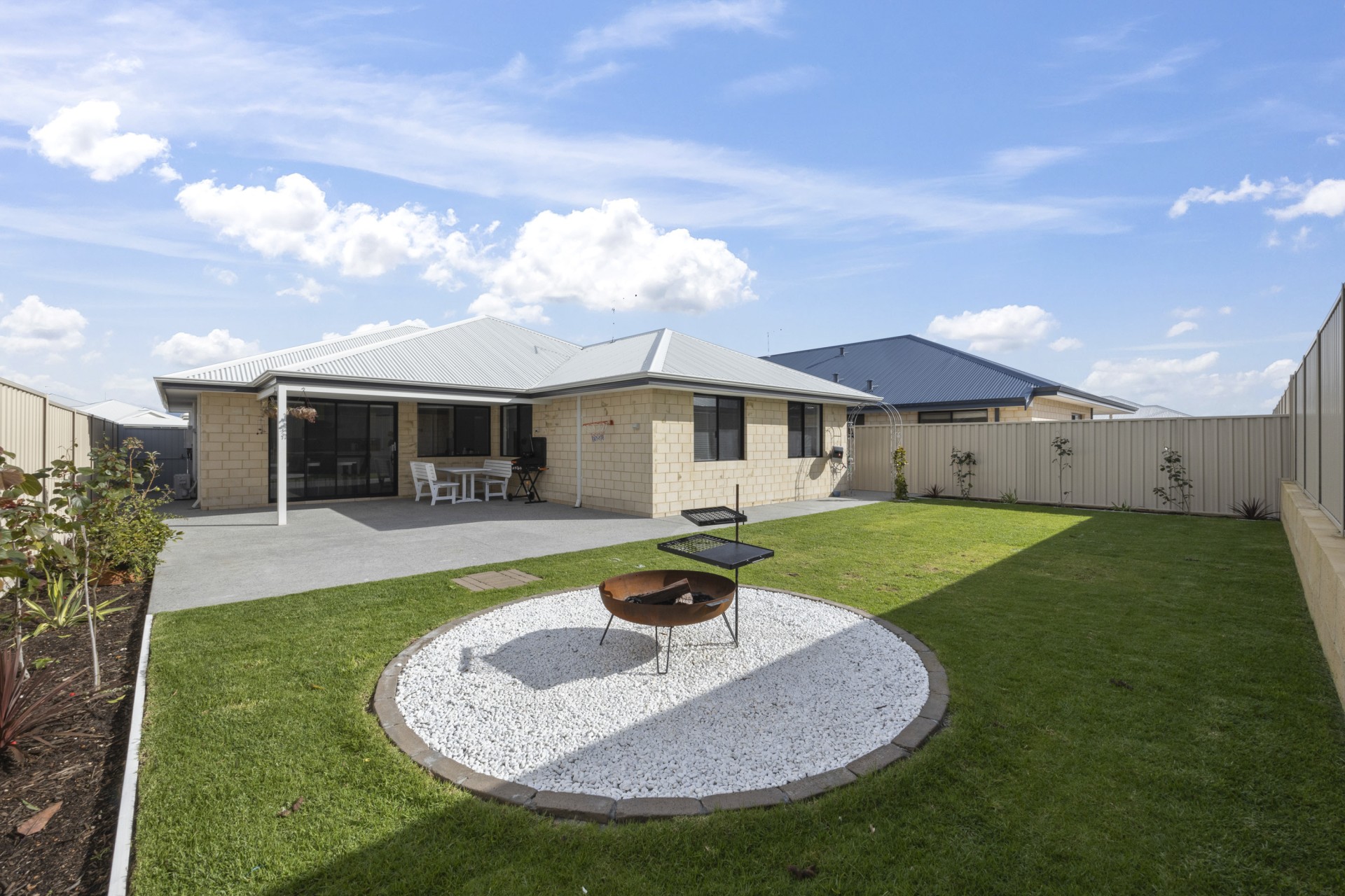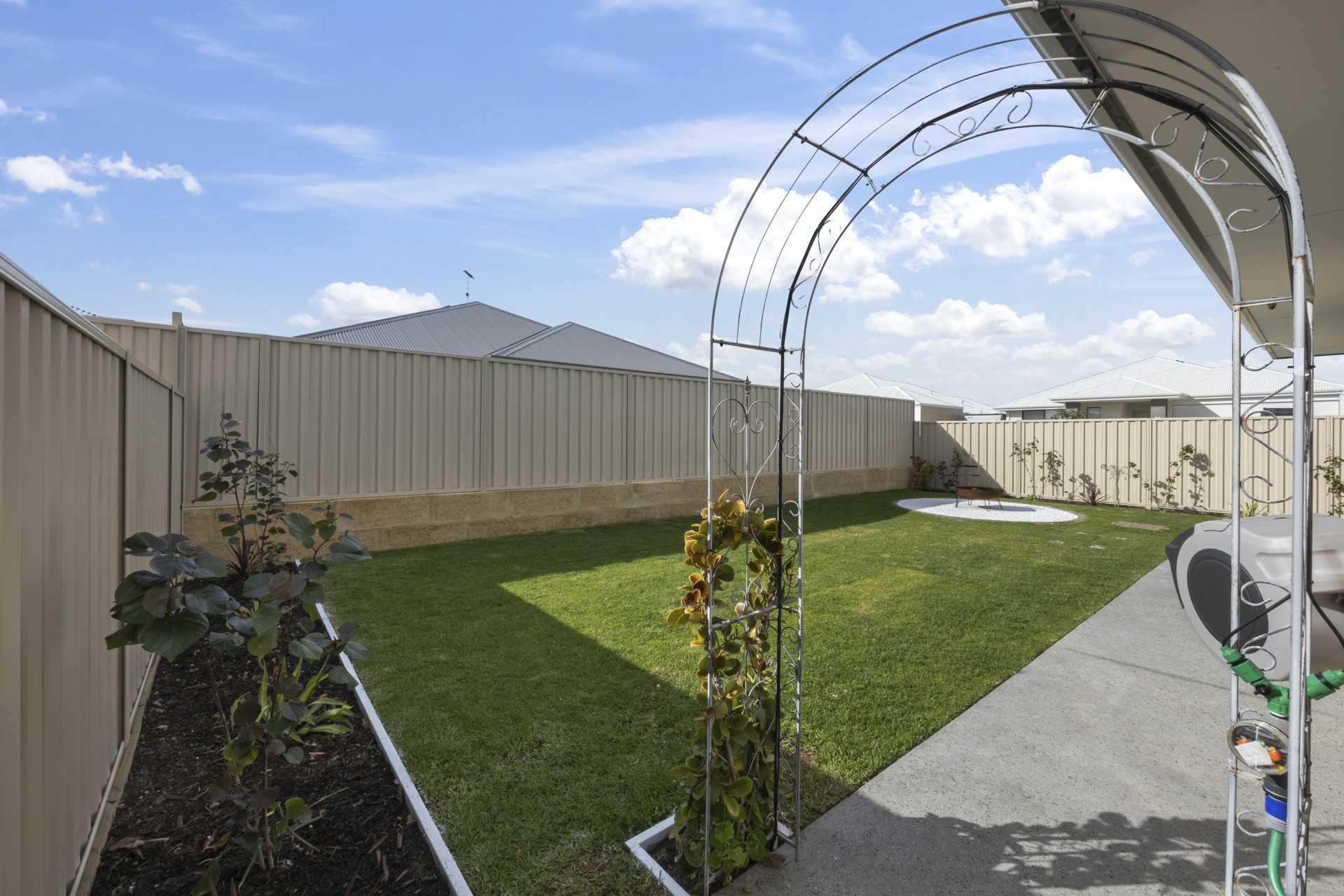 Backyard has timed irrigation, plus the added bonus of an apple, dragon fruit, orange, avocado & mandarin trees & a blueberry bush!