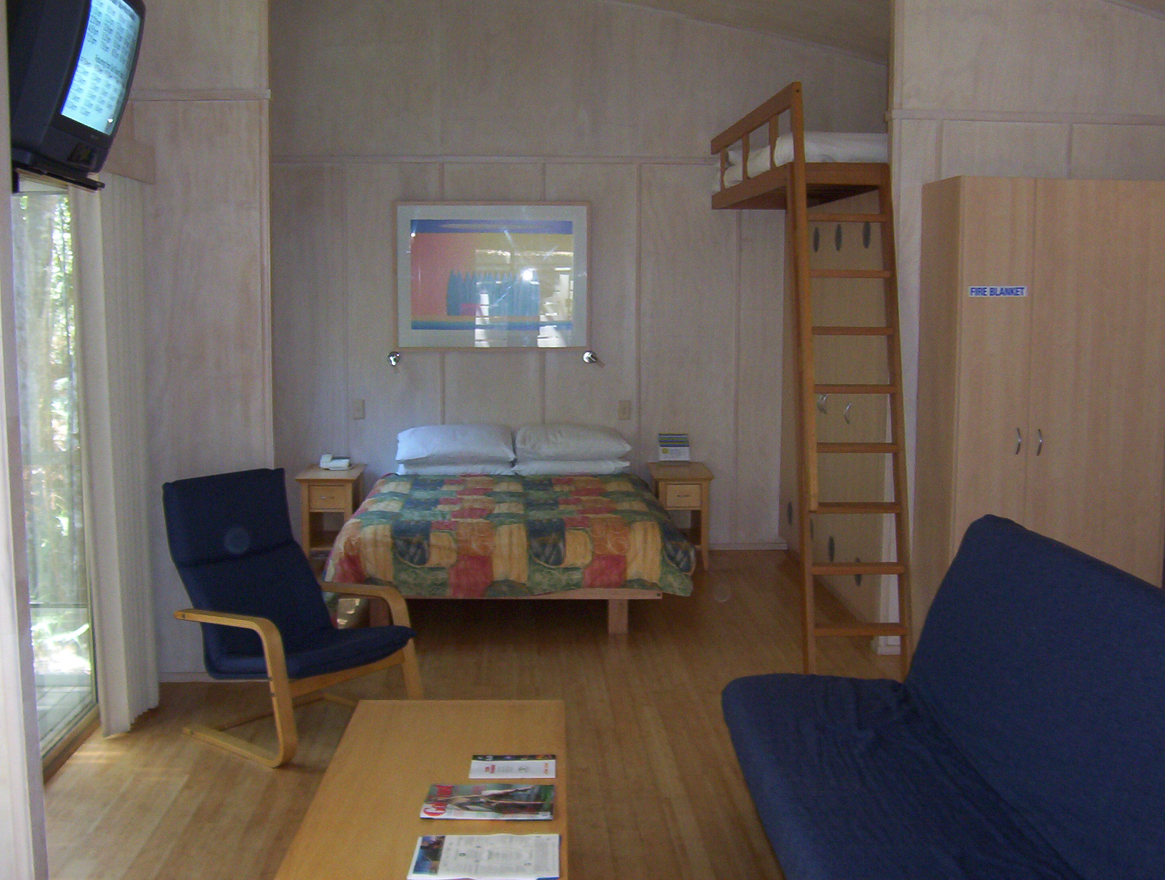 This is a studio cabin with open plan design and sleeps 6 people, queen bed, double loft bed also a Divan that folds out to a double so room for the whole family.