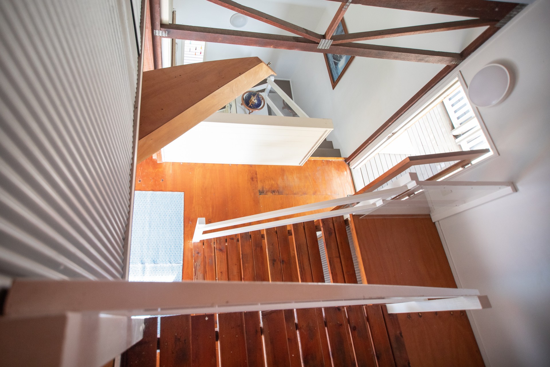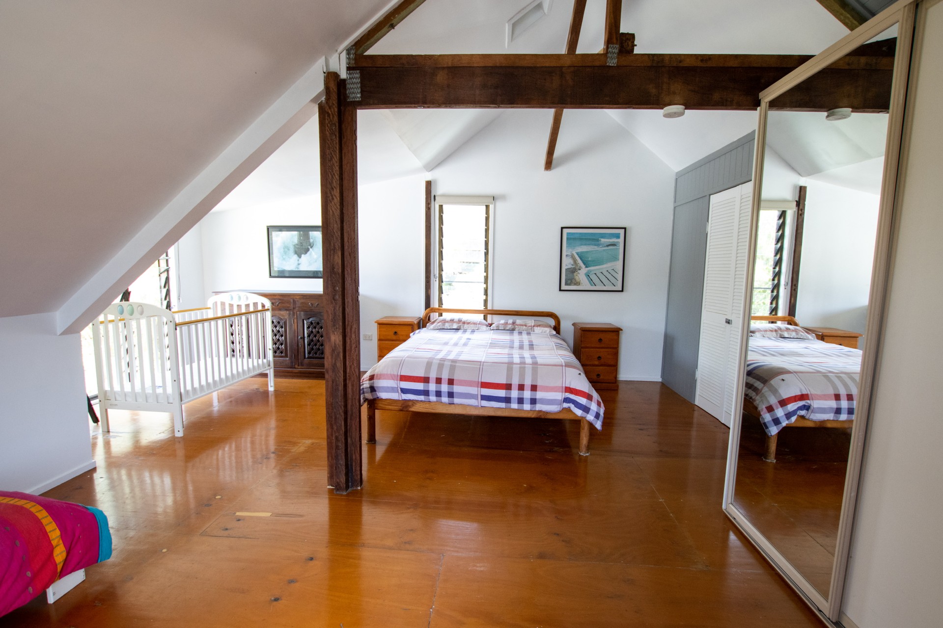 Don't miss this one!! A three storied open plan home with double decks on three sides. Creative styling, with a beach house flair. Definitely not one of those small traditional 3-bedroom homes. Open internal stairs wind up to the huge top floor main bedroom. This level has high ceilings, exposed beams lockable walk-in wardrobe, a queen-sized bed, toddler bed and cot. Excellent airflow and views from floor to ceiling louvres. The middle floor has two private bedrooms and a large family room with double bunk beds for the kids. The ground floor consists of - a full kitchen, (white two pack, stainless steel benches, 5 burner gas cooktop on island bench), indoor and outdoor dining areas, red leather lounges in the living area, opening to stairwell, laundry and bathroom. One full bathroom, an additional toilet on the back deck of the middle floor and a quirky surfboard outdoor shower in the backyard.