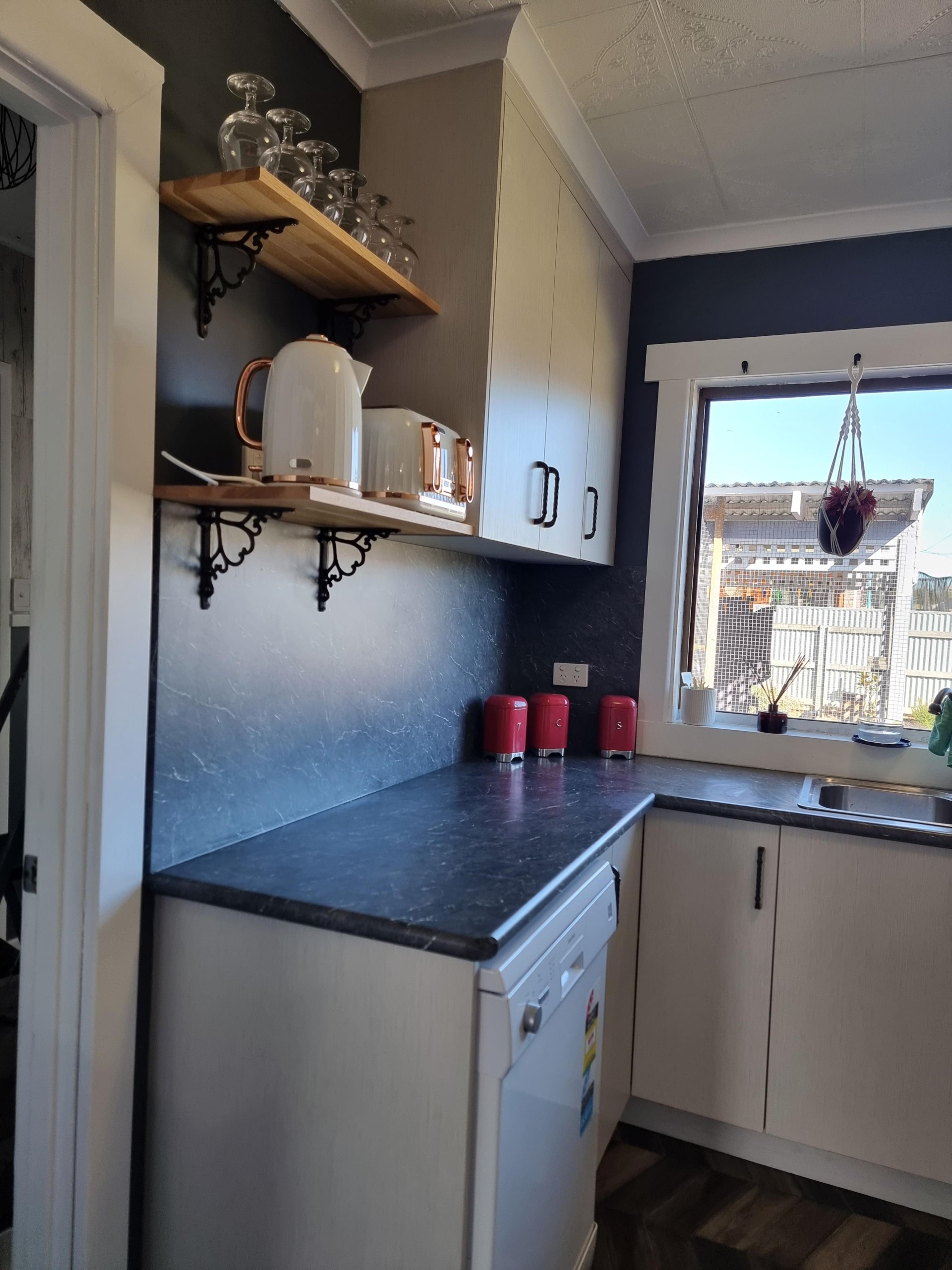 The new kitchen, boasts loads of storage and endless bench space. Also a large pantry just off the kitchen. Dishwasher, free standing oven with electric cooktop and a recessed exhaust.