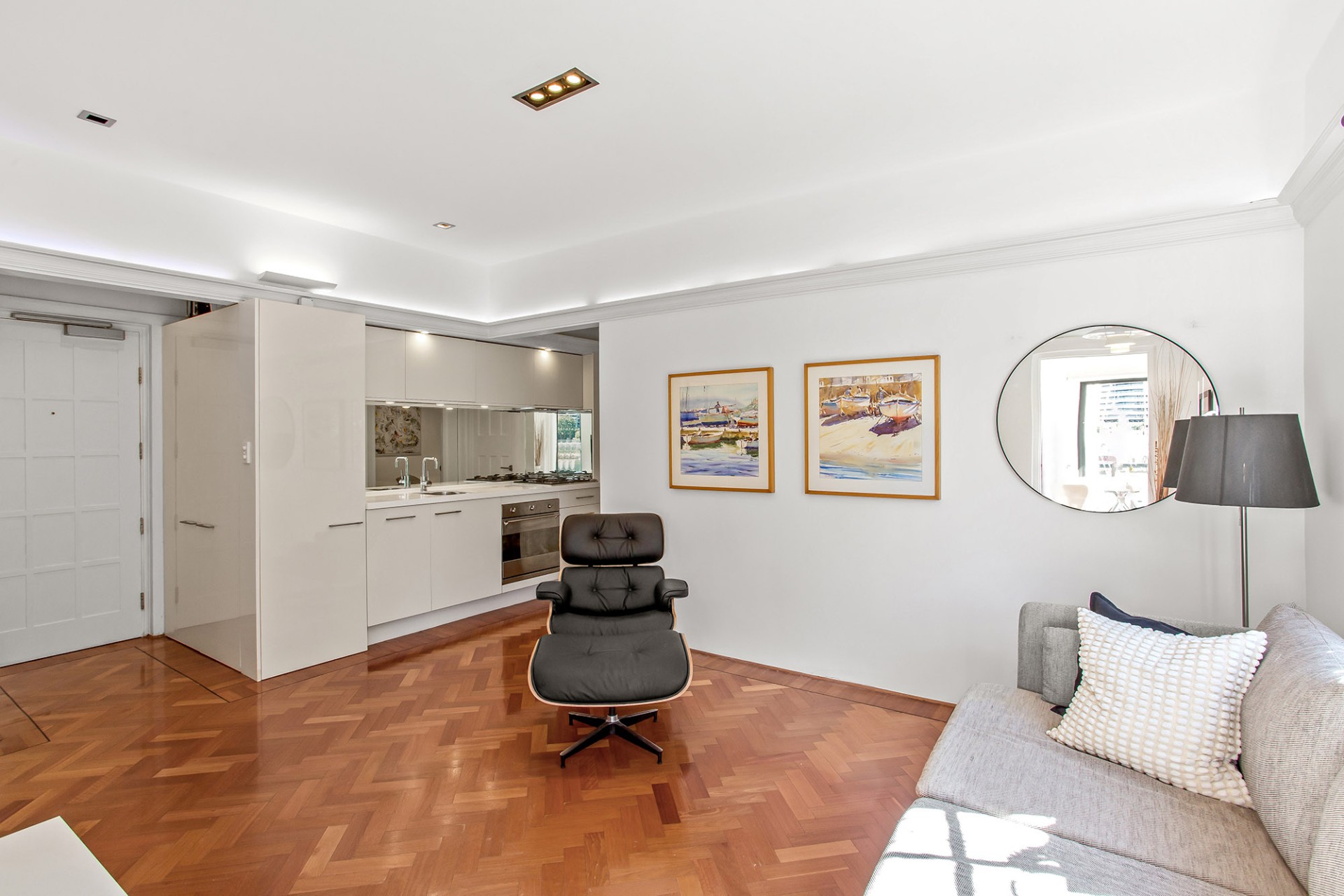 * Galley-style kitchen with stone benchtops and integrated appliances