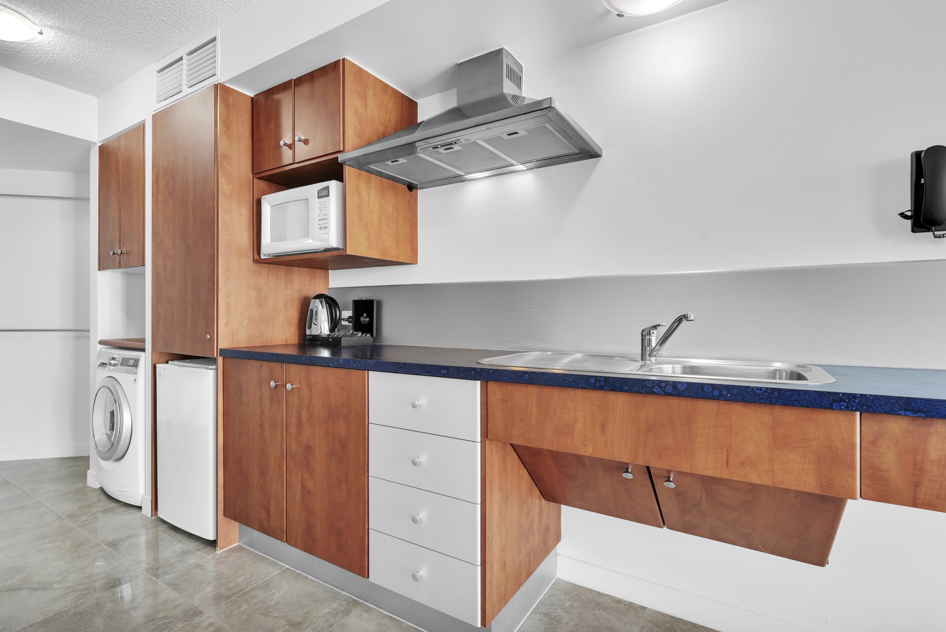 Layout: Spacious living/dining area, kitchenette with washer/dryer space, and a large bathroom.