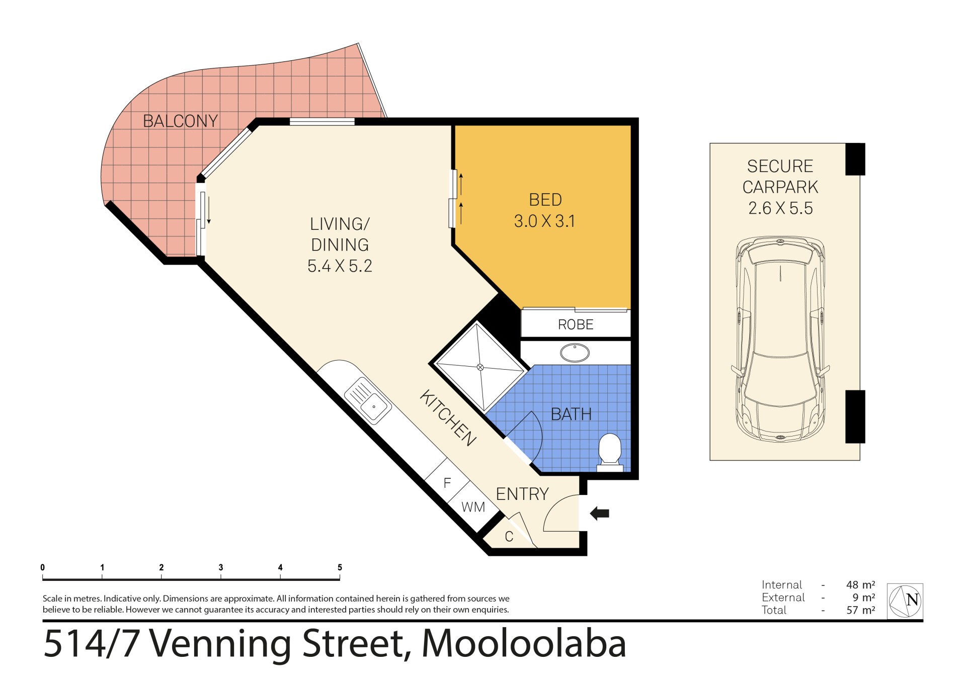 Configuration: 1 bedroom, 1 bathroom, and 1 car space.