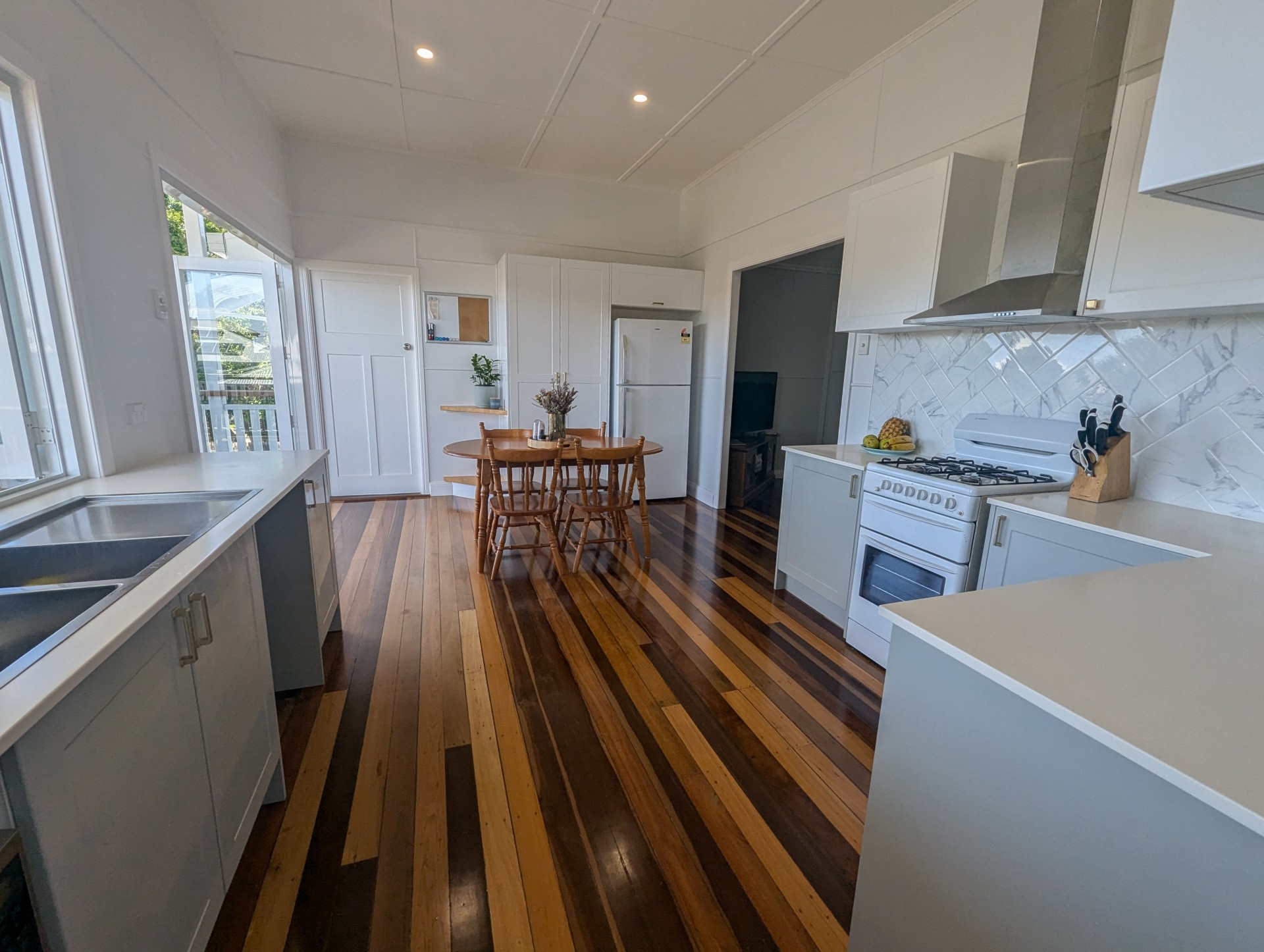 • Open-Plan Living Area: The lounge and dining area, featuring polished timber floors, is bathed in natural light flooding in from the rear deck, creating a bright and airy atmosphere. This generous space offers ample room for both relaxation and entertaining.