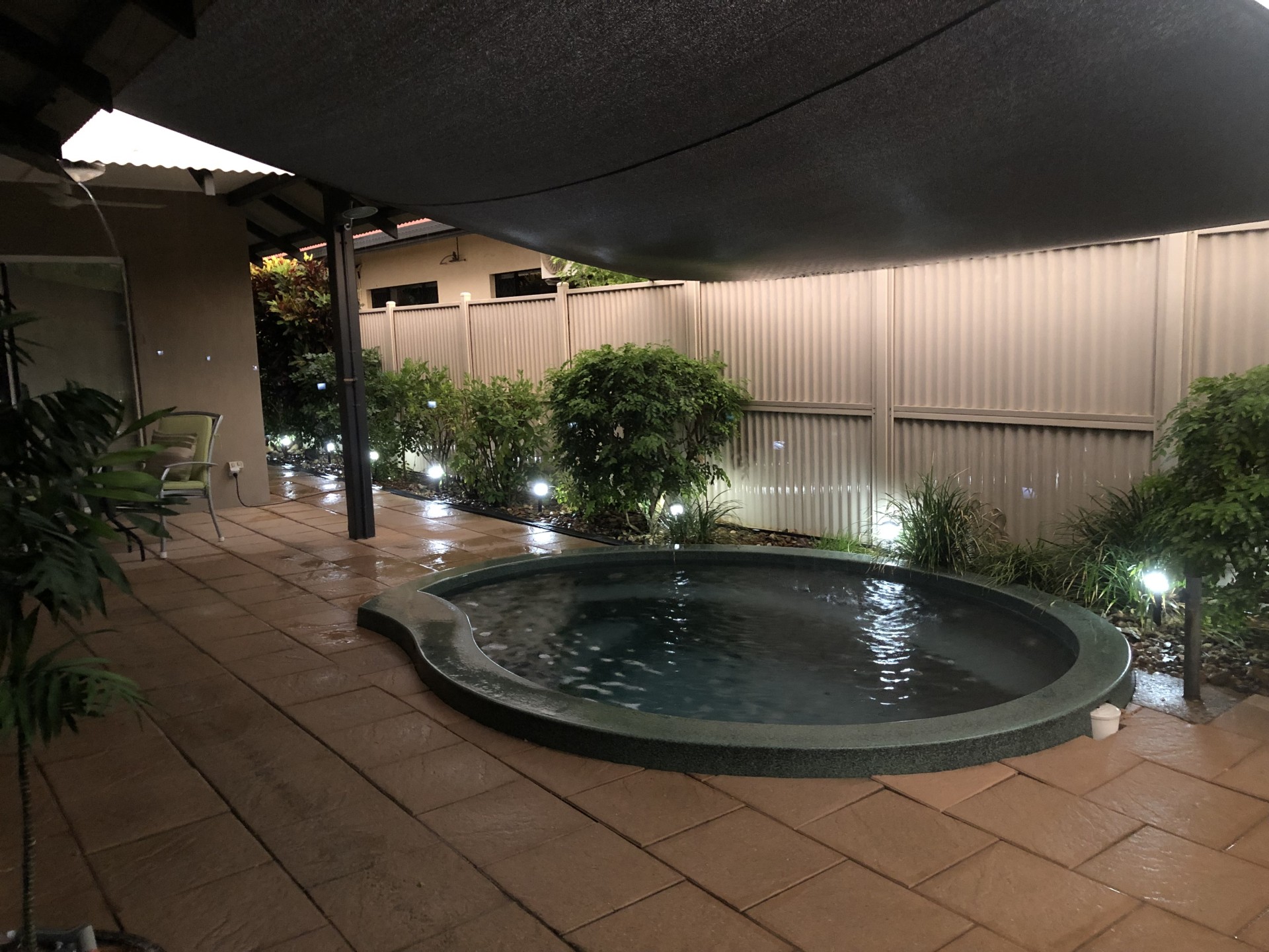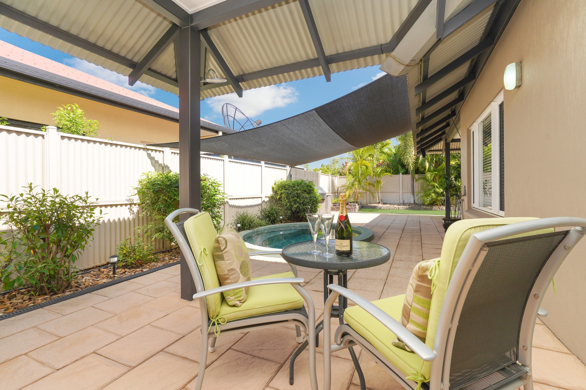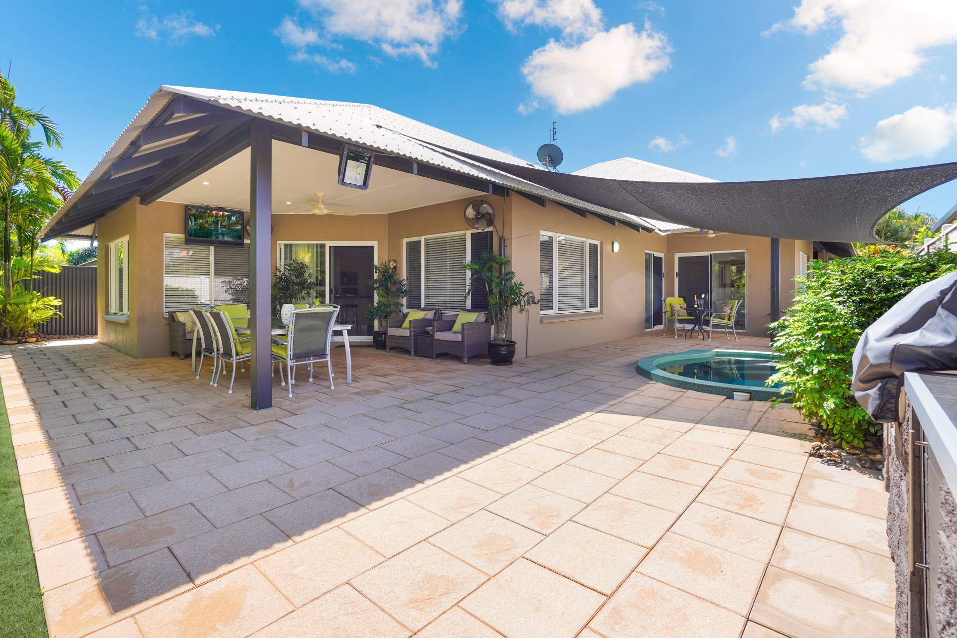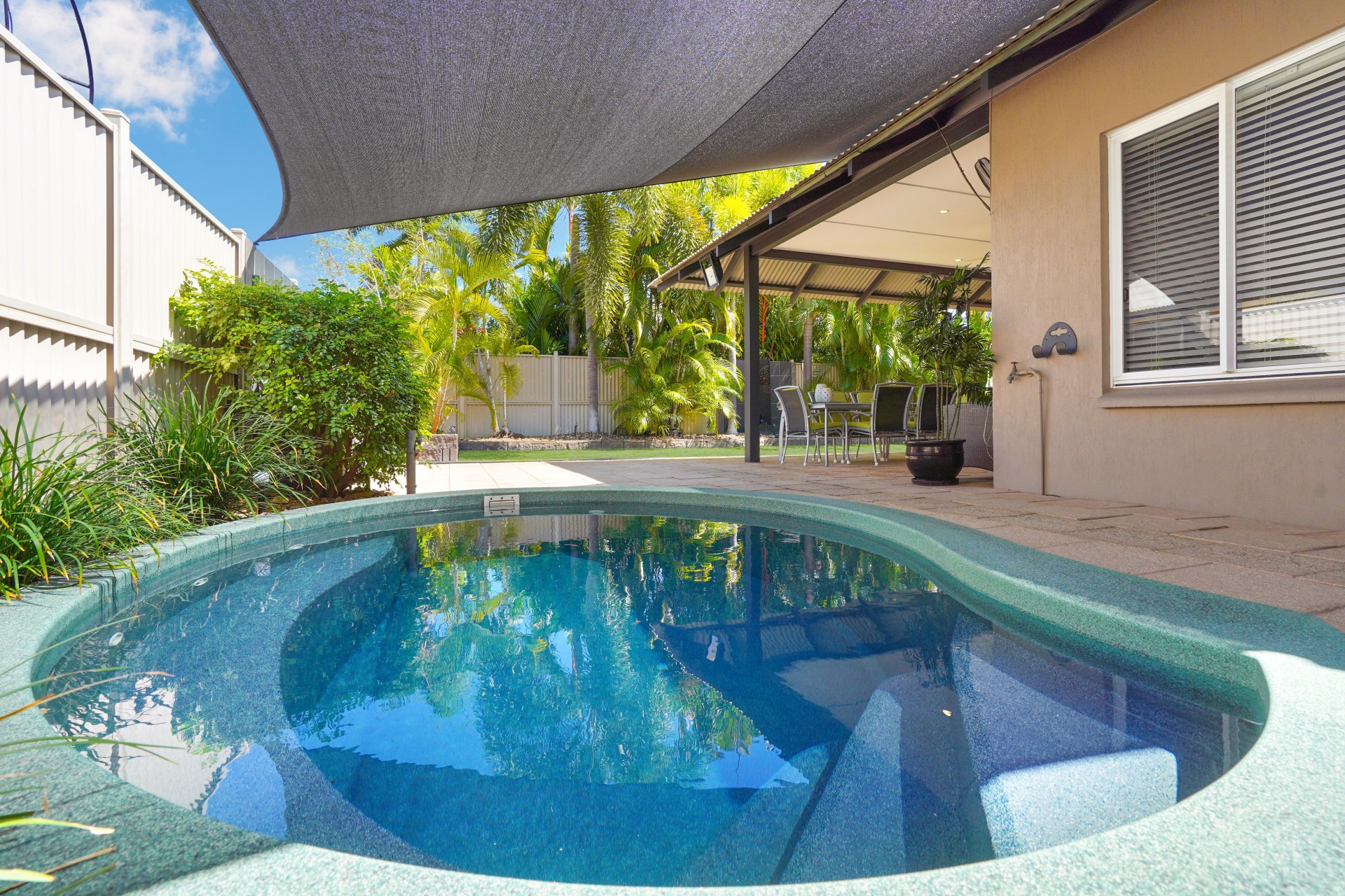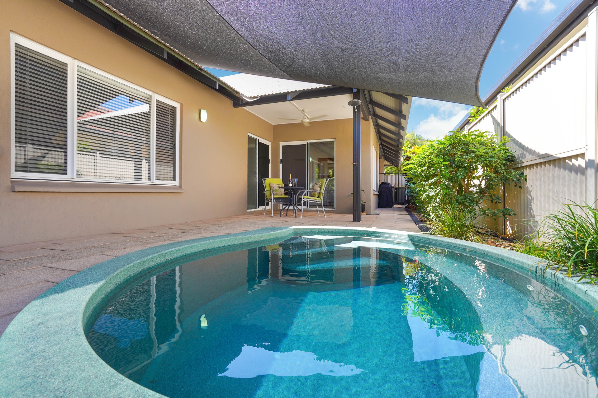 Spacious rear patio with in-ground plunge pool, ideal for entertaining