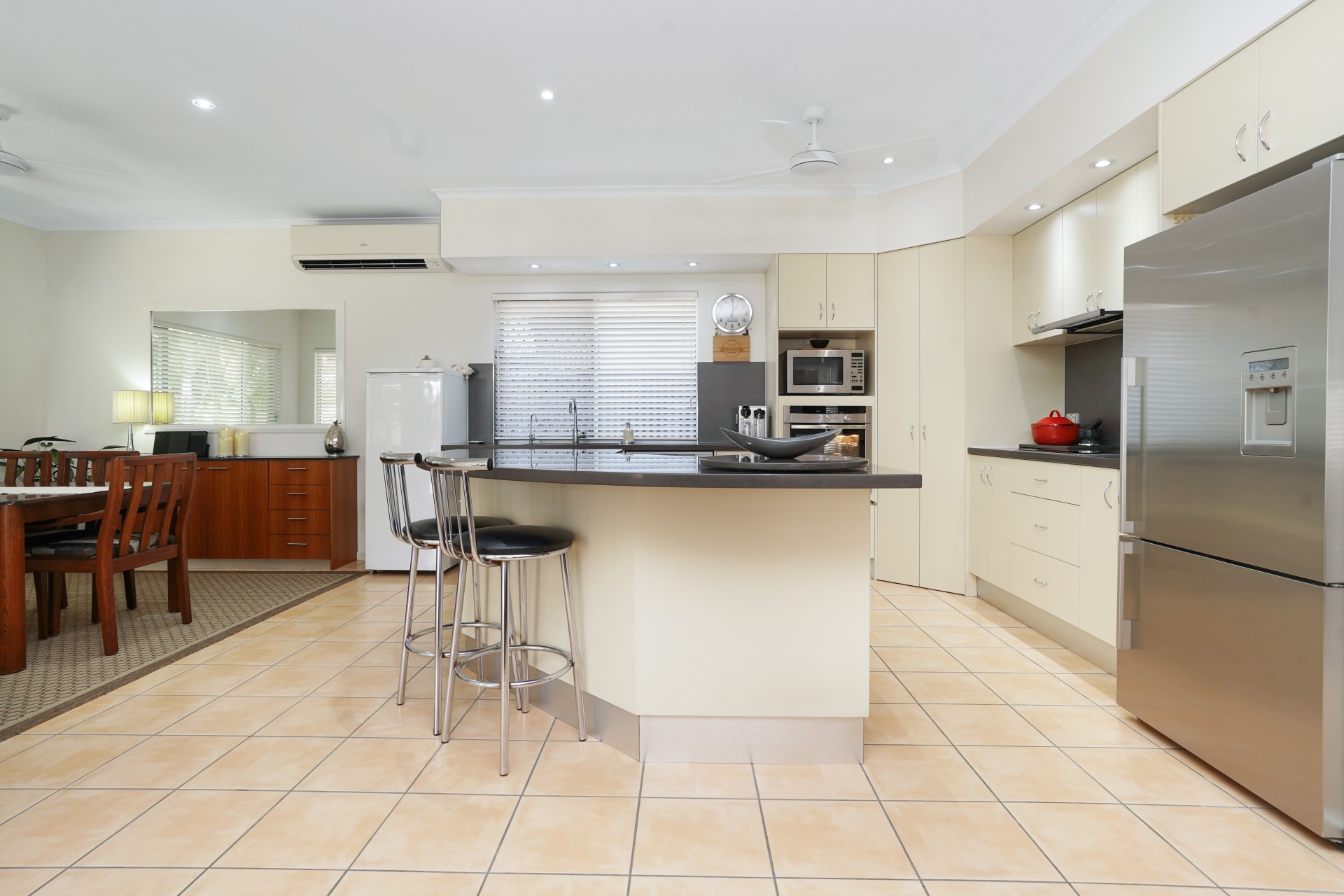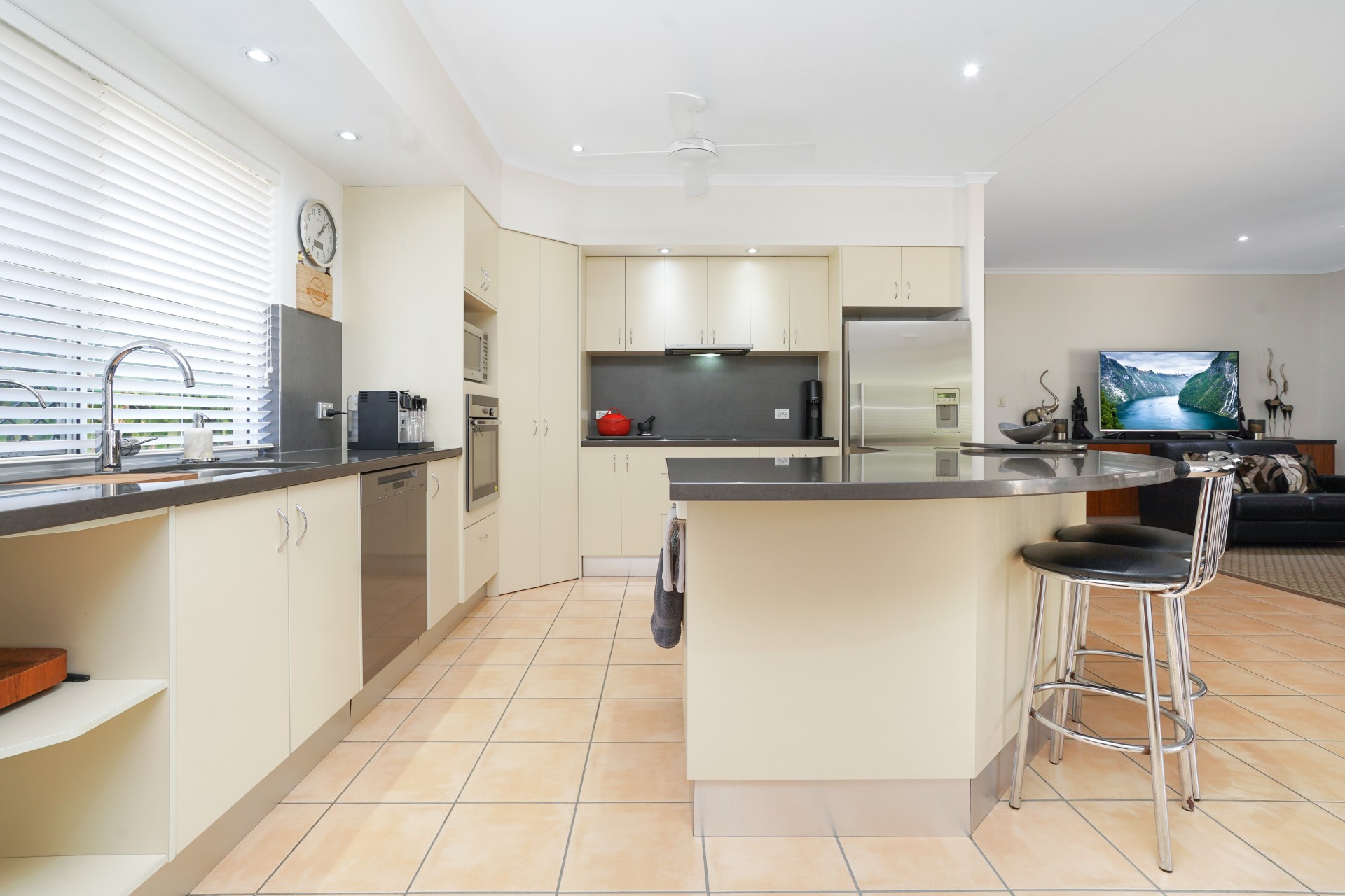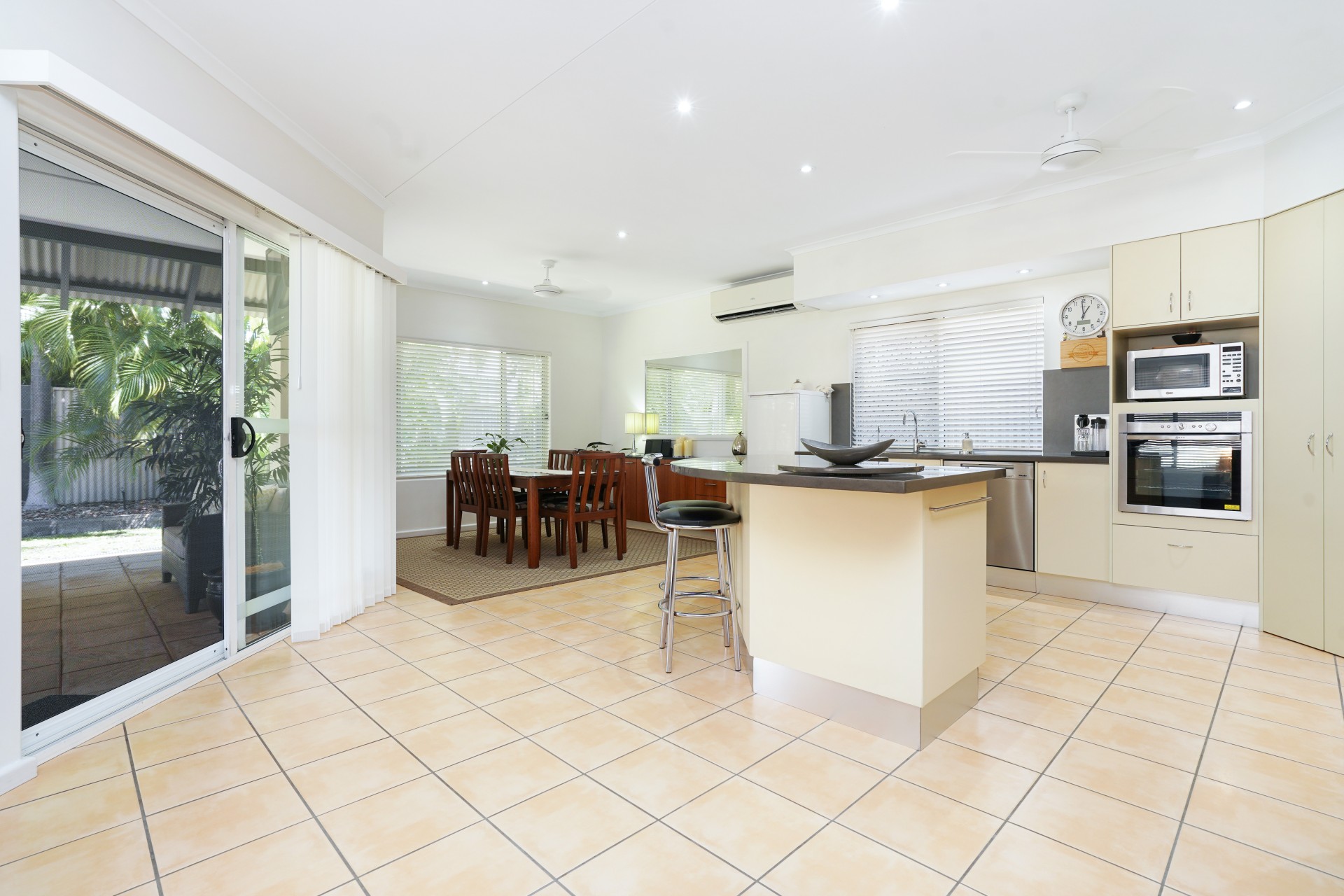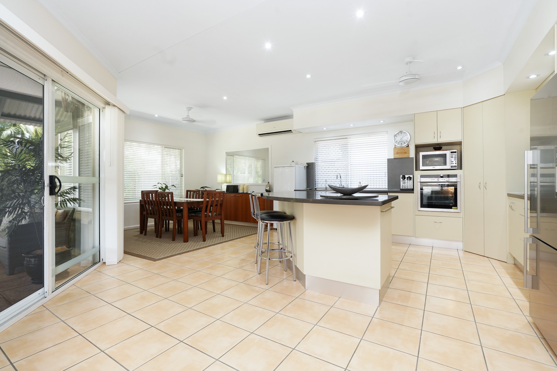 # Family size kitchen, stone benchtops wlth wrap around breakfast bar, European appliances with large pantry. Adjoining dining room has a tropical leafy outlook