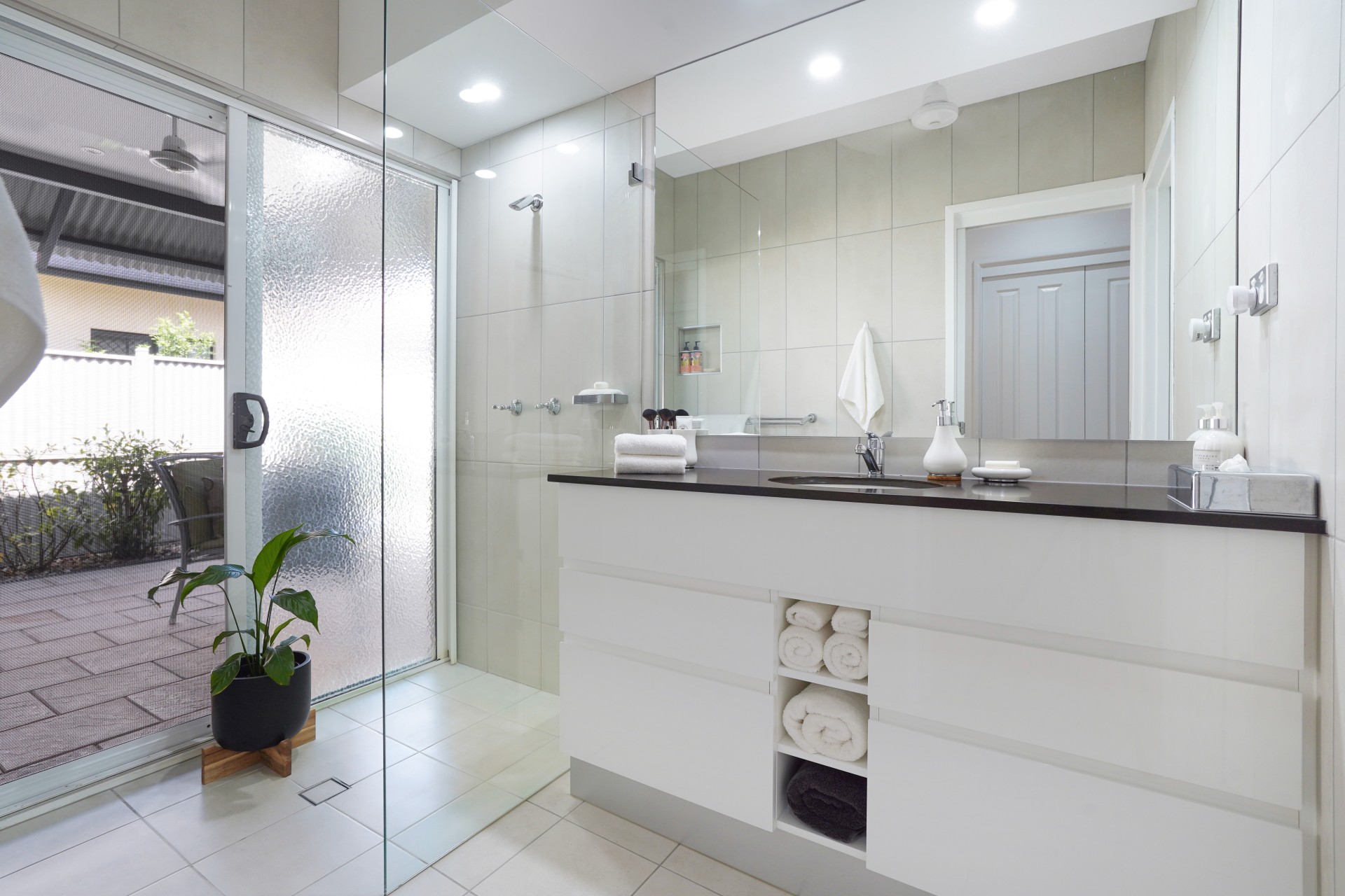 Striking ensuite shower opens onto second private outdoor courtyard