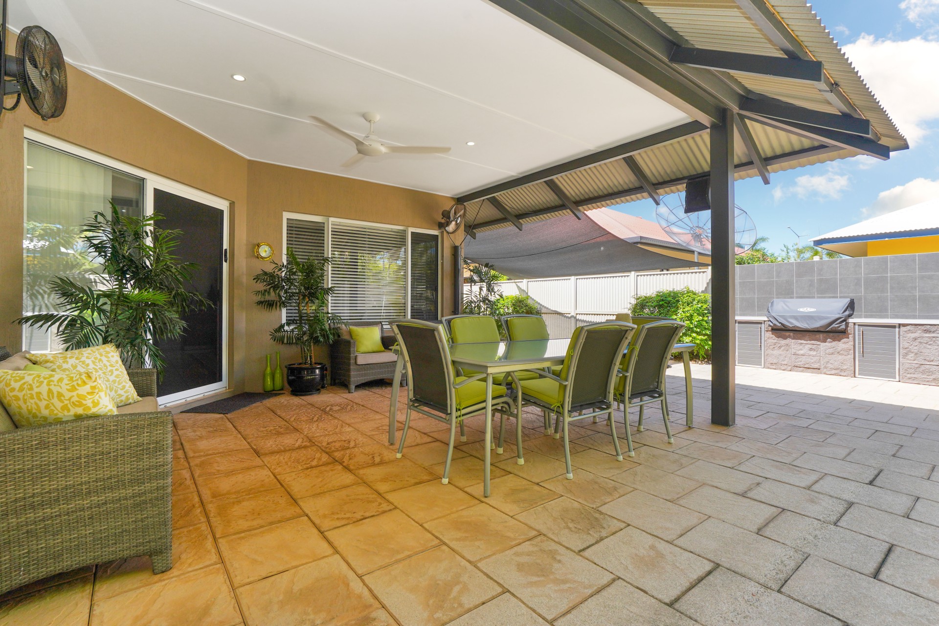 # ln-built BeefEater BBQ adjoins lawn and low maintenance garden