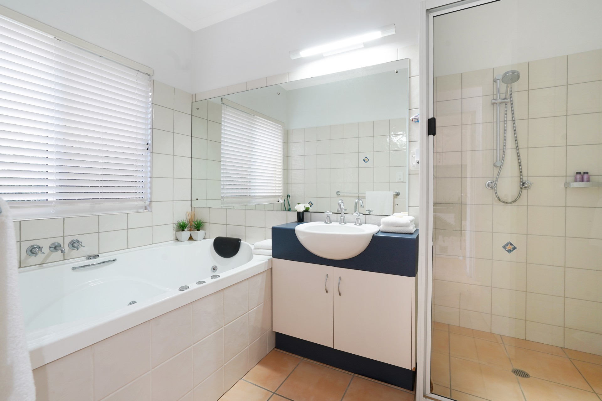 # Generous main bathroom with spa bath, walk-in shower and separate toilet