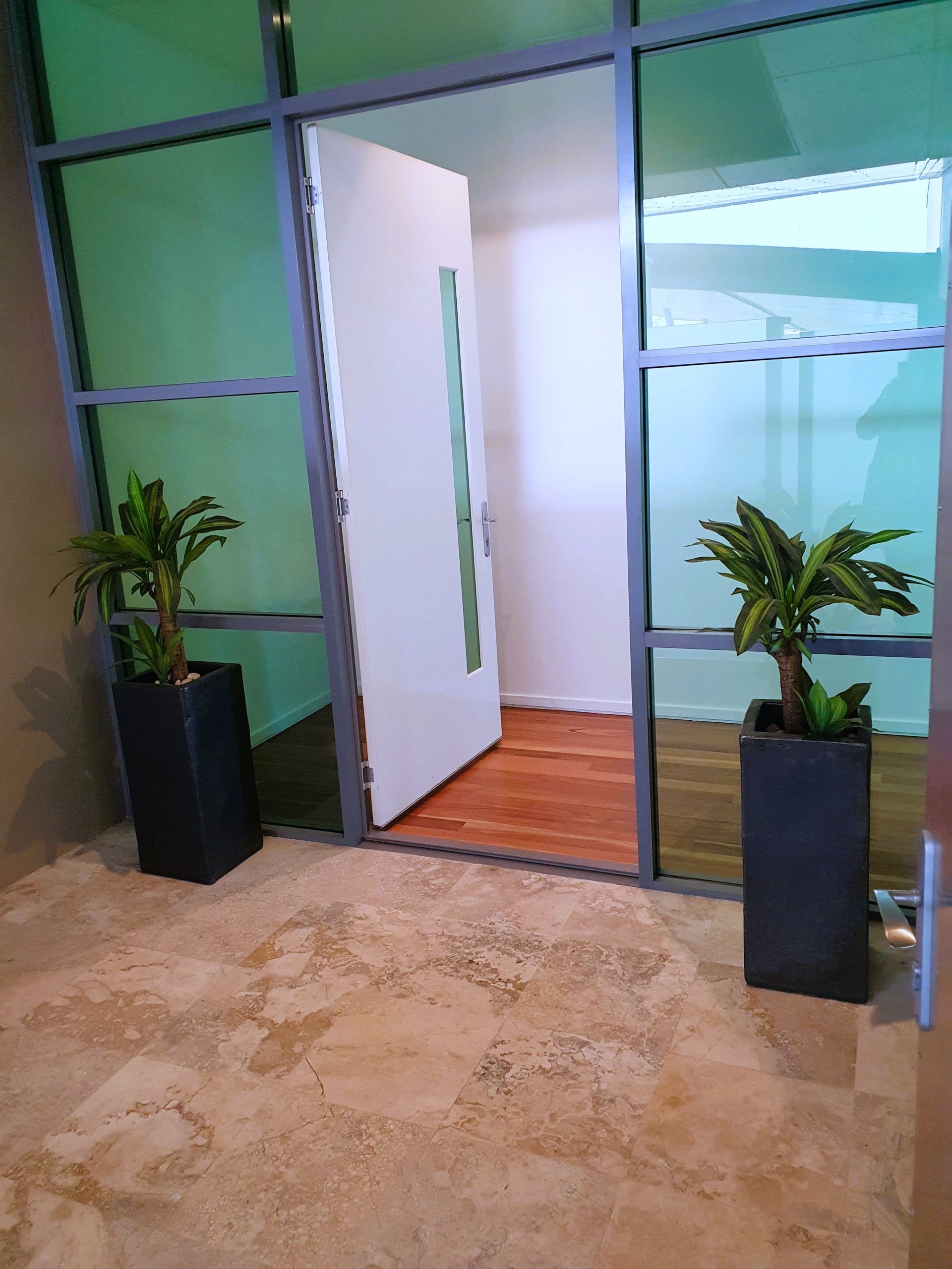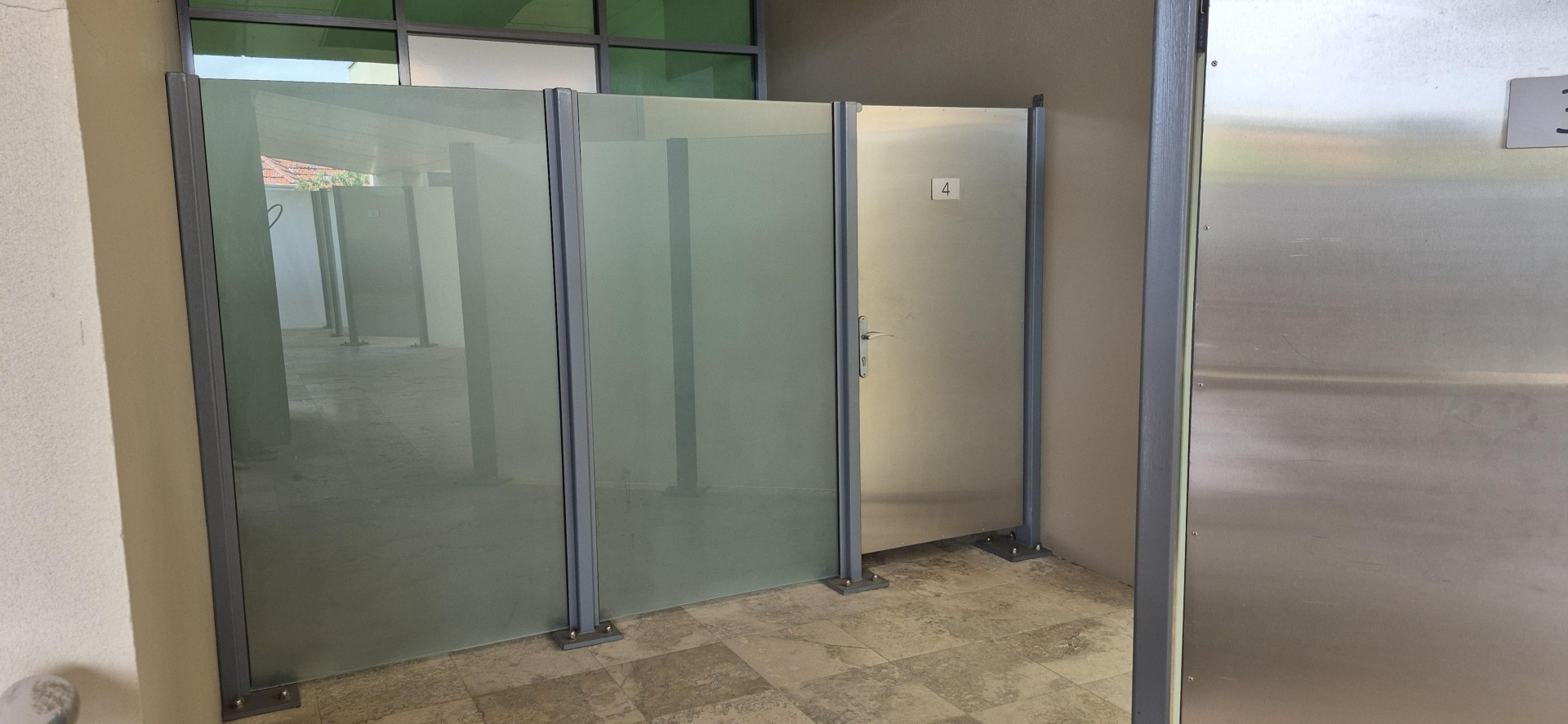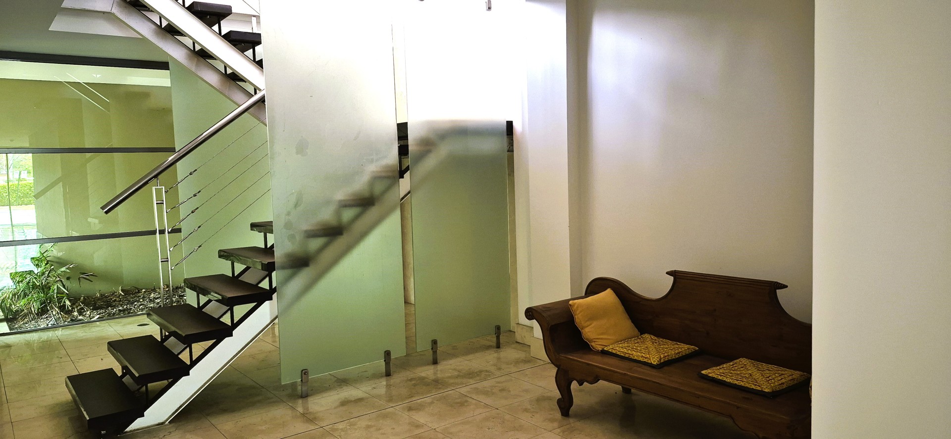 - Secure private internal courtyard with frosted glass walls and stainless steel security entrance gate.