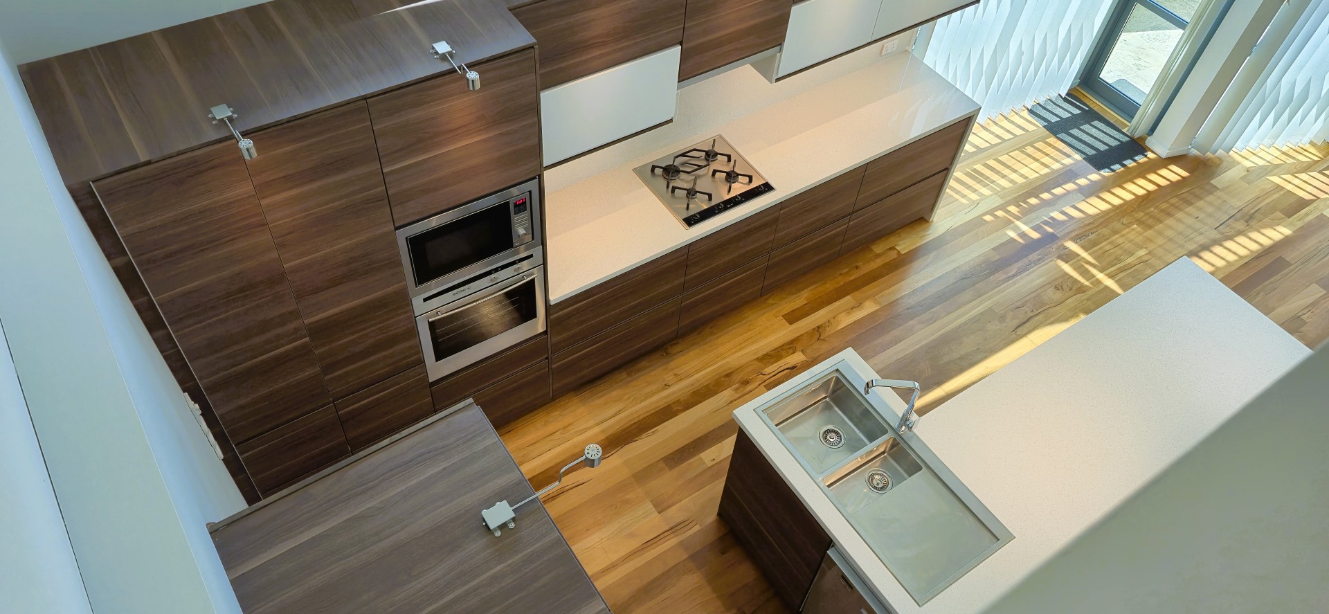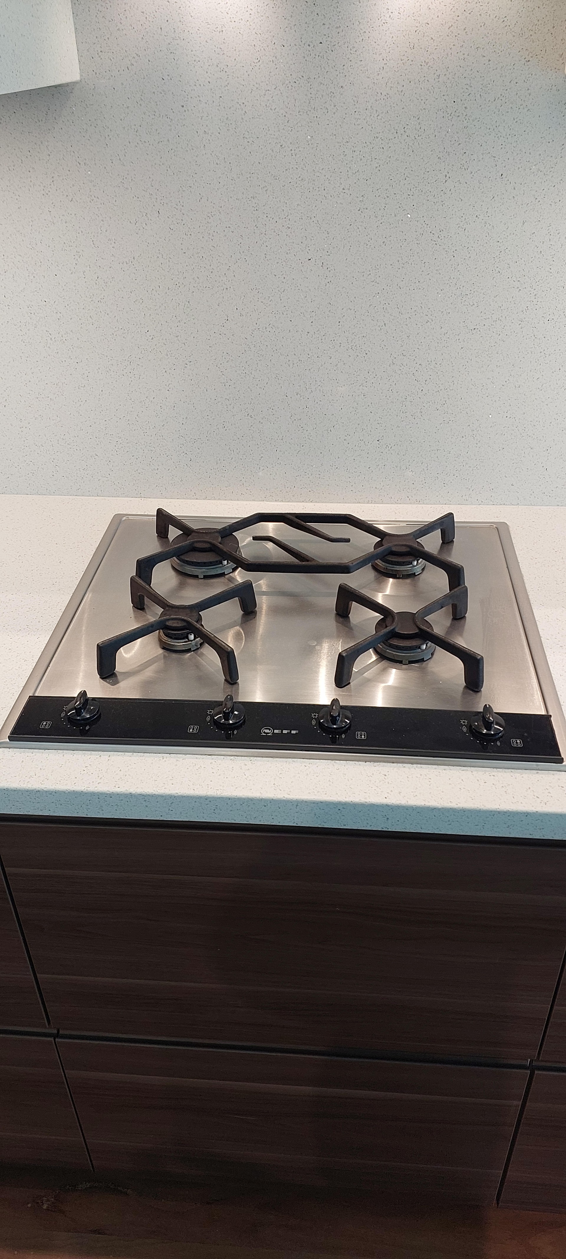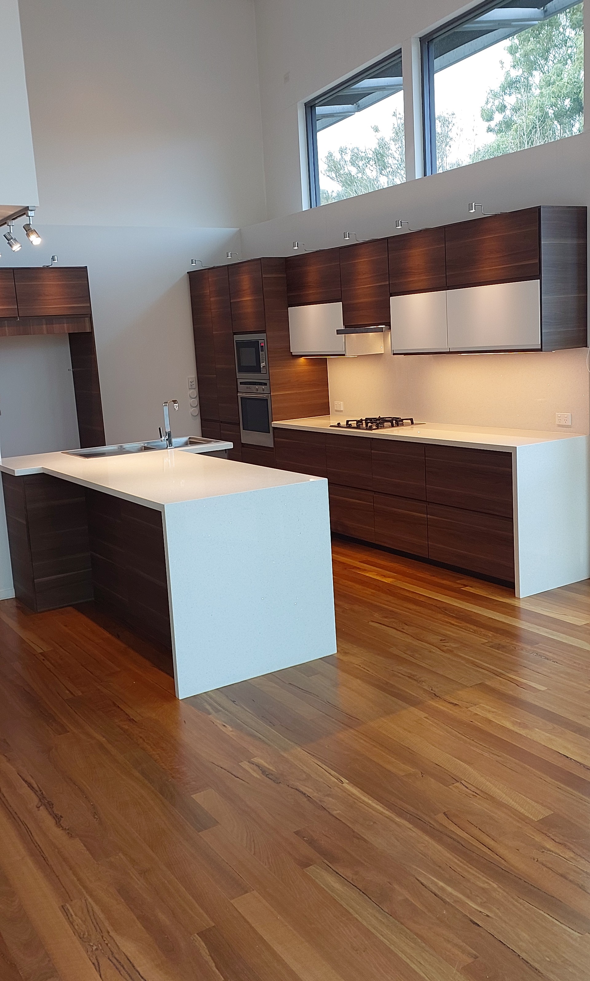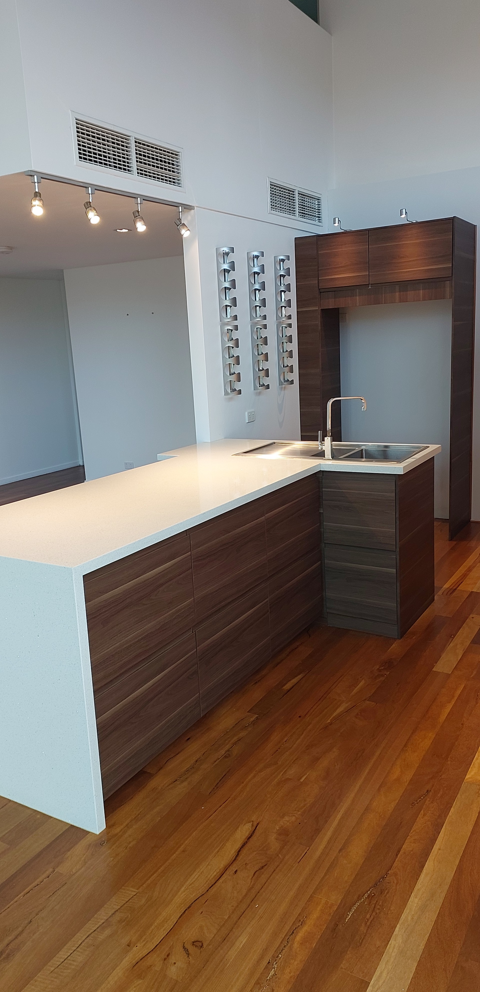 There is display lighting above and below the overhead cupboards which lights up the work surface and cooking area. There are wine bottle holders in stainless steel fitted to the wall and quartz stone splash back to the wall.