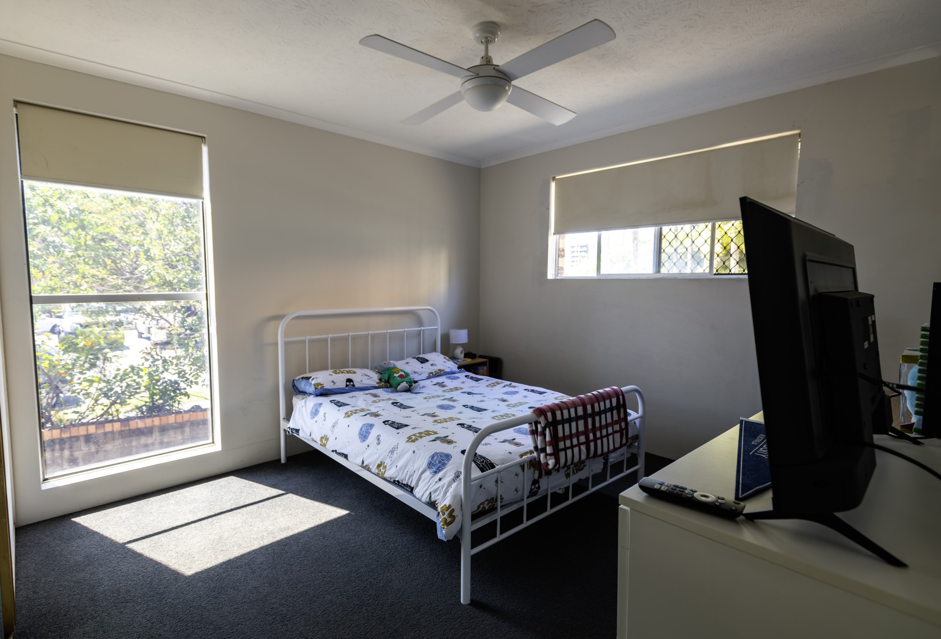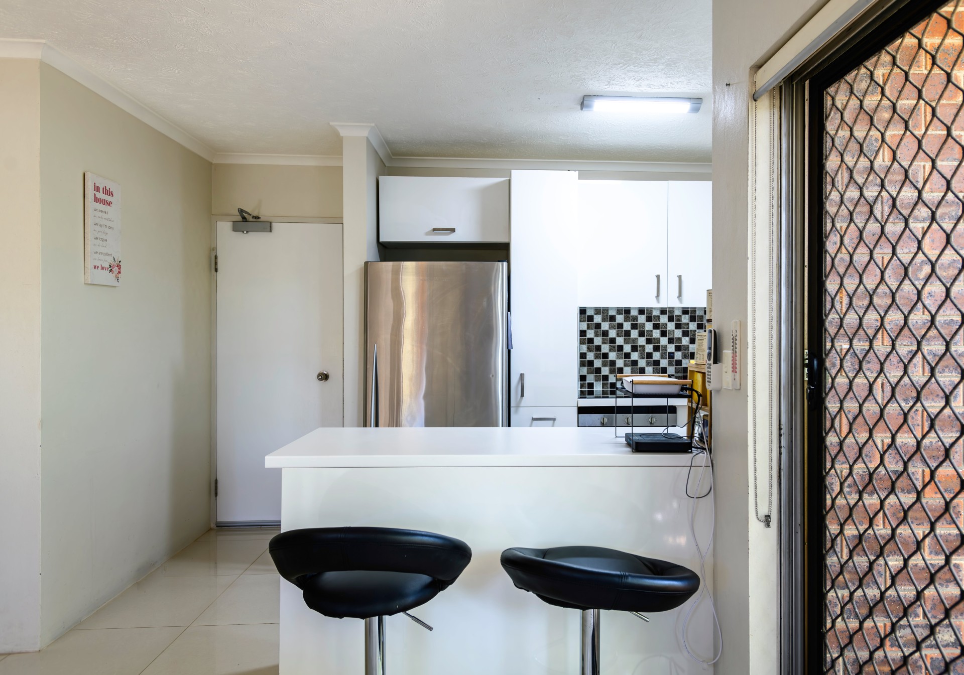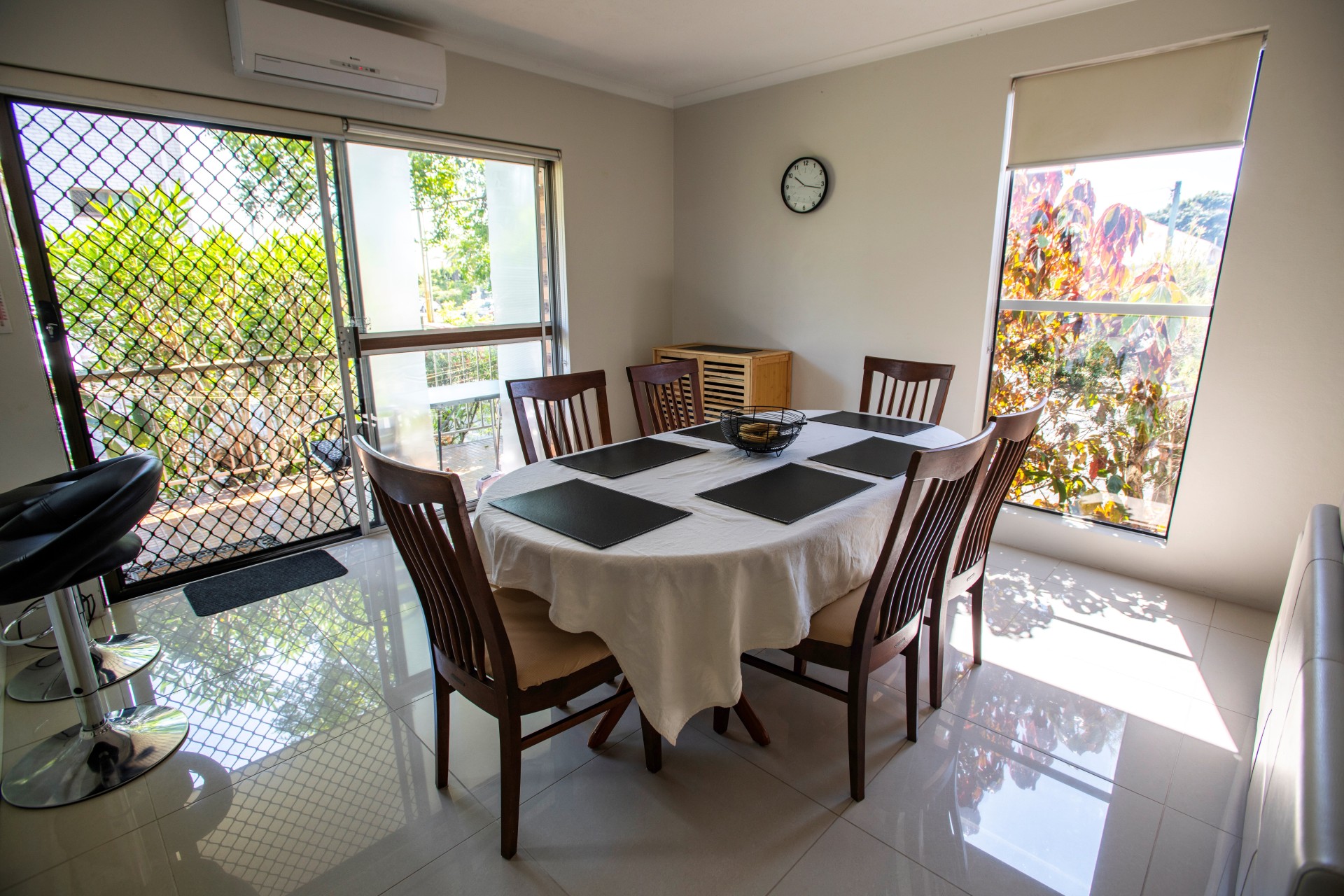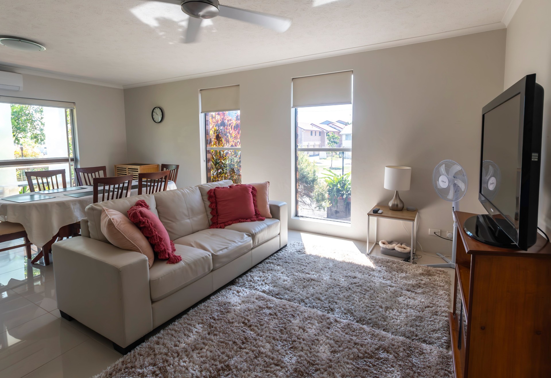 There are porcelain tiles throughout the living areas, and 2 spacious bedrooms which are carpeted. Some windows are tinted for comfort and privacy. Fans keep all living areas cool during the warm months as well as the lovely through breeze, and there's an aircon in the open plan area for additional comfort if you prefer to stay cool inside.