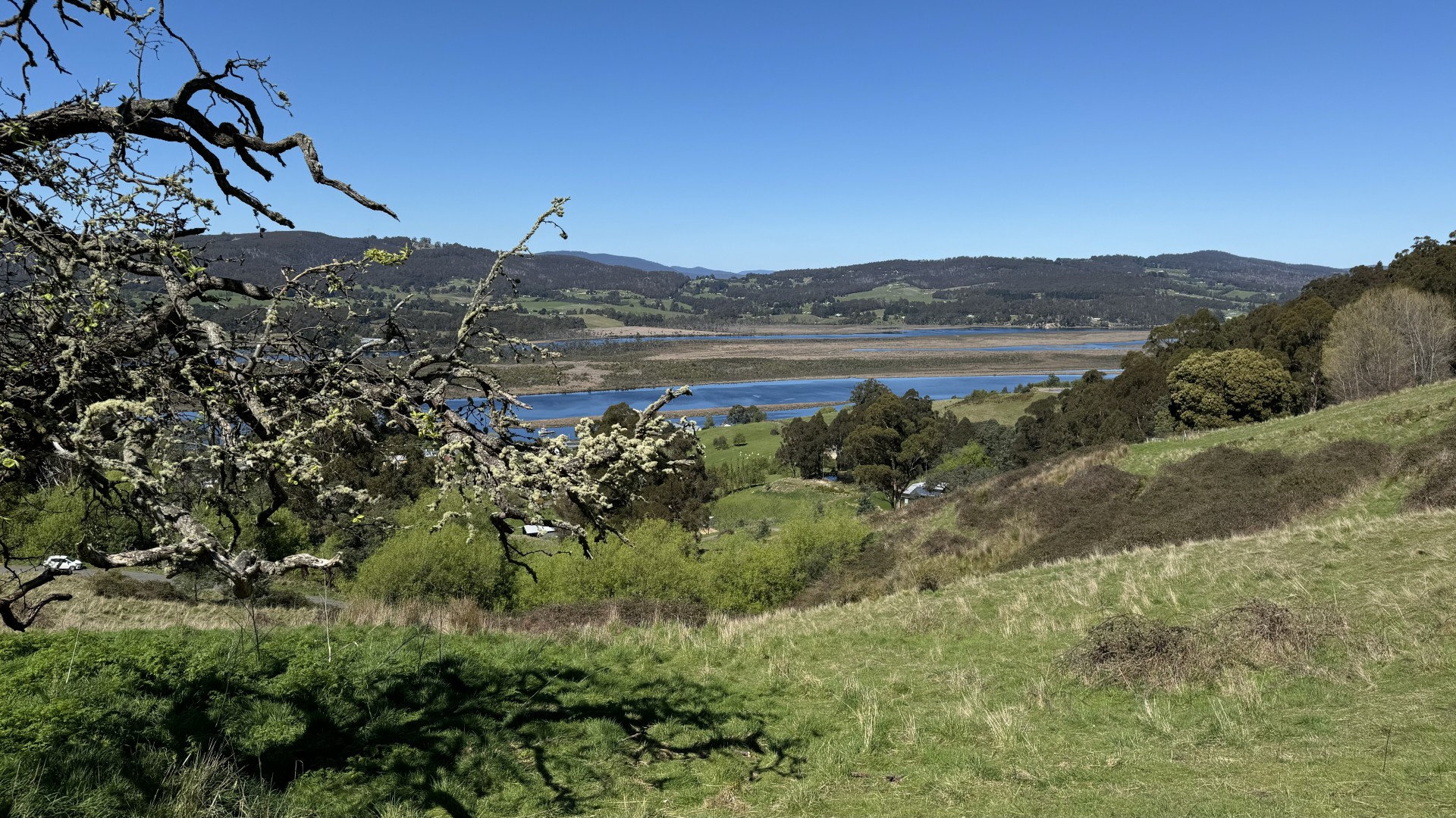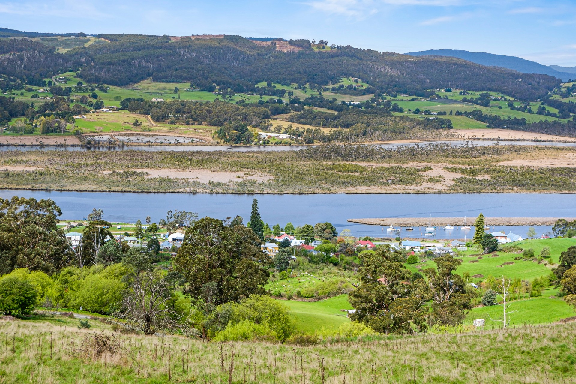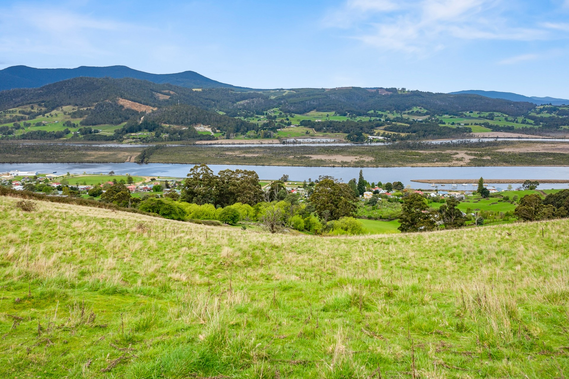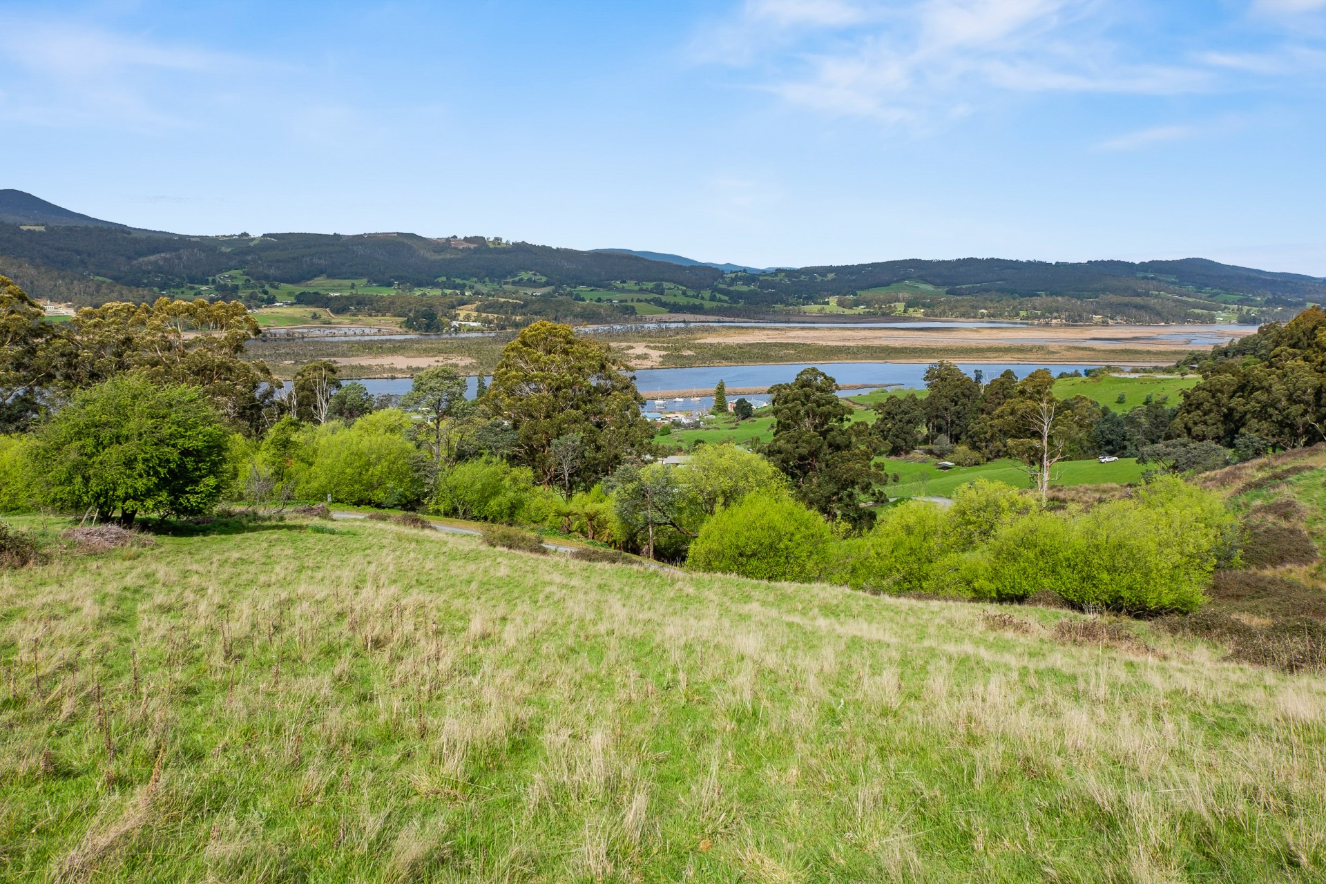 Spectacular expansive views are the defining feature of this 9.3 acre parcel of land that is situated on a sunny hillside above the historic village of Franklin. Nestled at the end of a quiet country lane, this elevated vantage point offers panoramic views of the Huon River and the Egg Islands. The land also affords views of kunanyi/Mount Wellington.