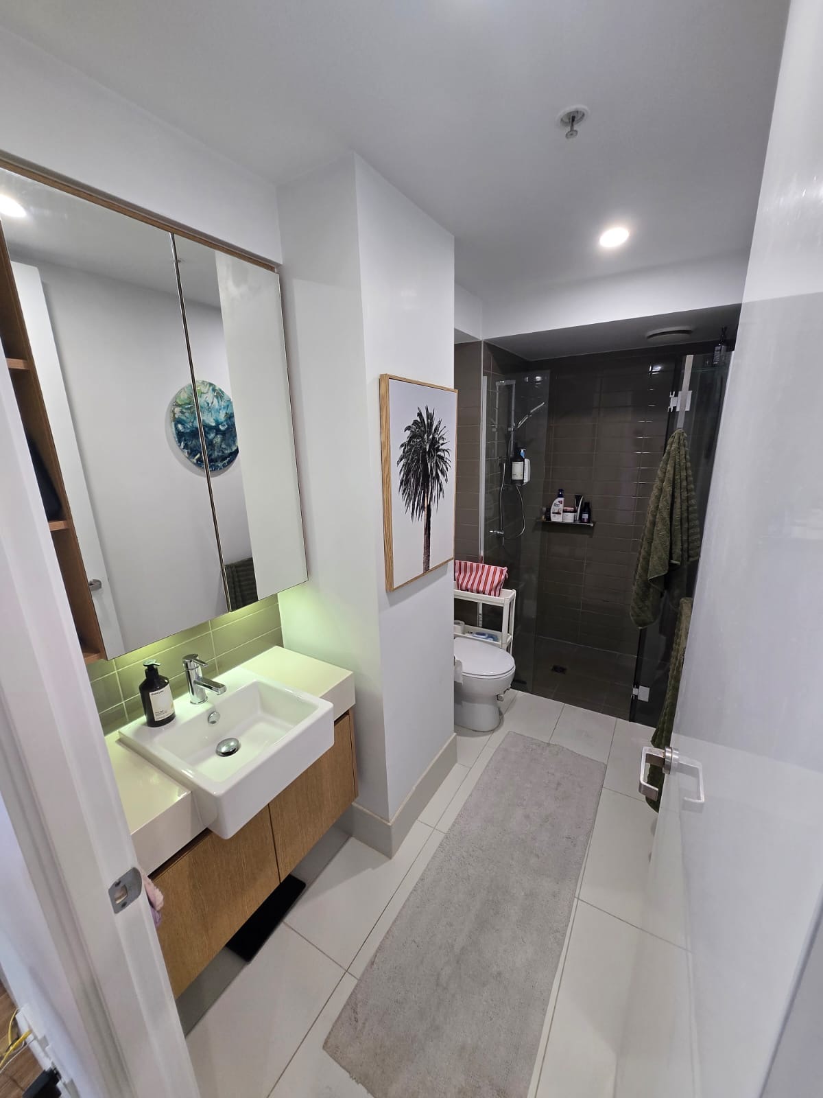 This apartment boasts the largest 1 bedroom split level floor plan in the building, offering an open plan kitchen with abundant storage, stone benchtops, Miele appliances, and an integrated dishwasher. The spacious dining area seamlessly transitions into the living room, where the split level design floods the space with natural light. Sliding doors open to a generous private double balcony on Bay Street, perfect for entertaining, with views of Bay Street, the City and Port Phillip Bay.