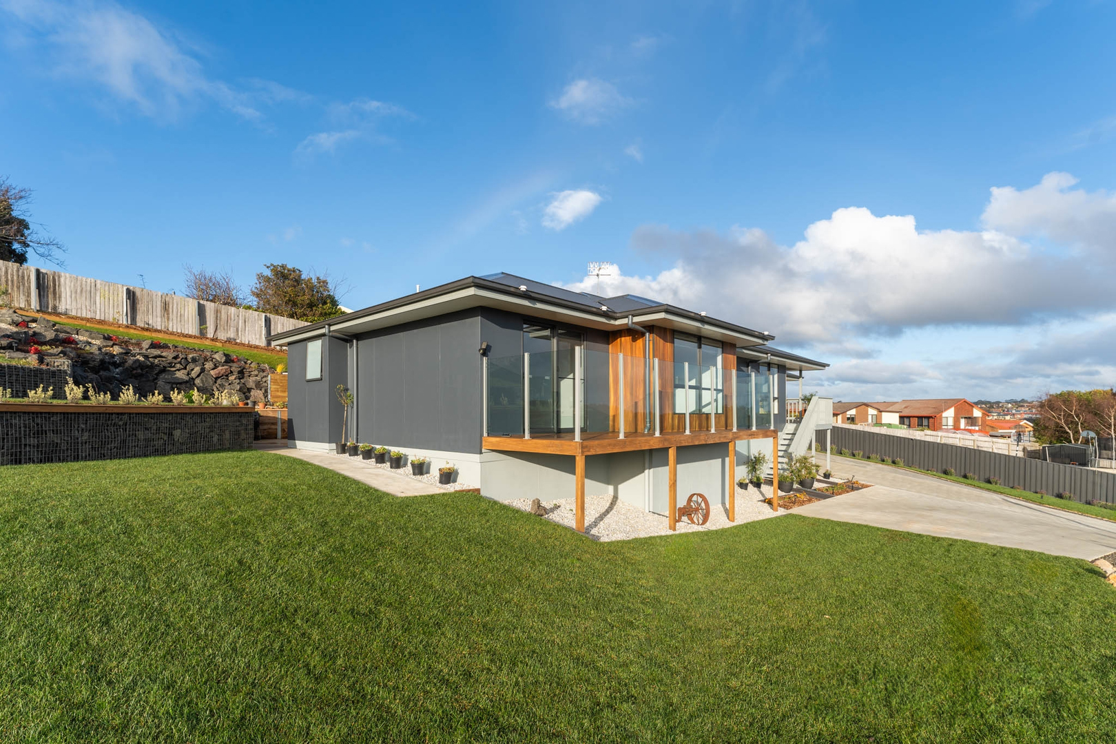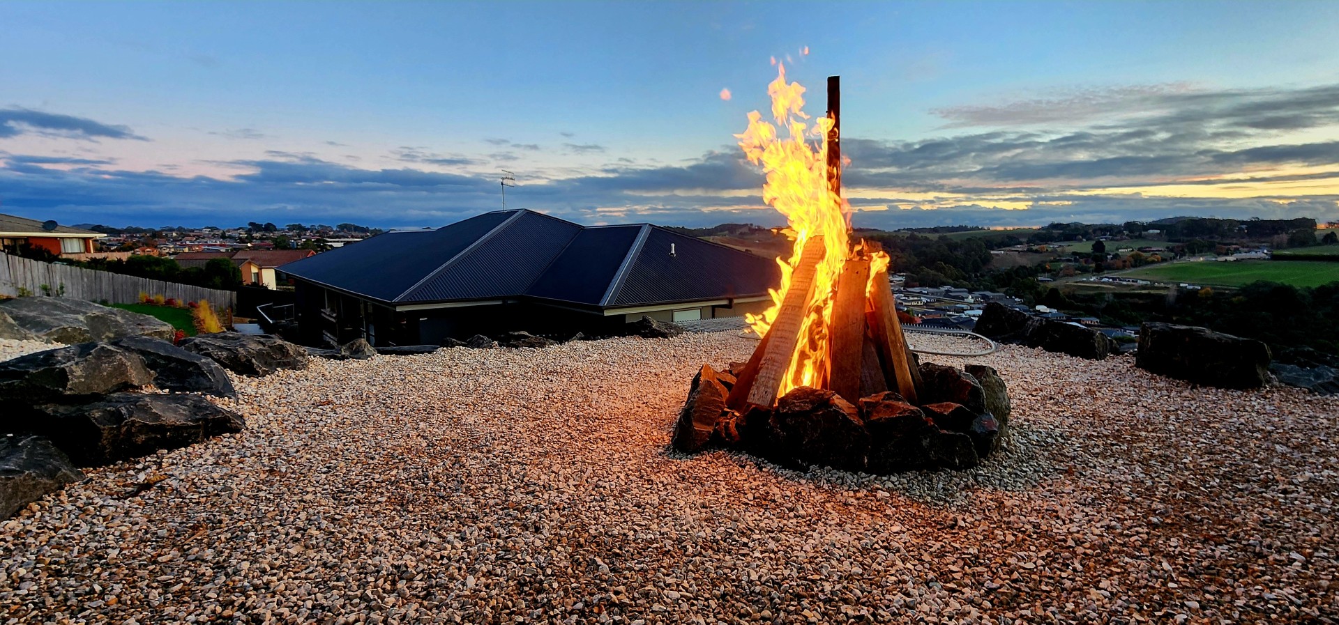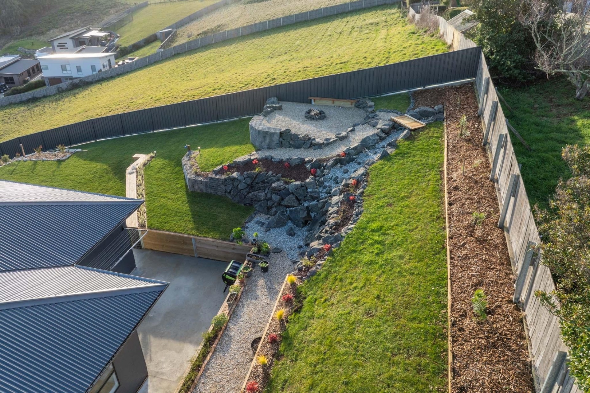 Landscaping includes white rocks & gabion walls, wooden bench, dry creek, fire pit with seating area, concrete paths around the house and flower beds. Very potential to be converted to a luxury holiday home.