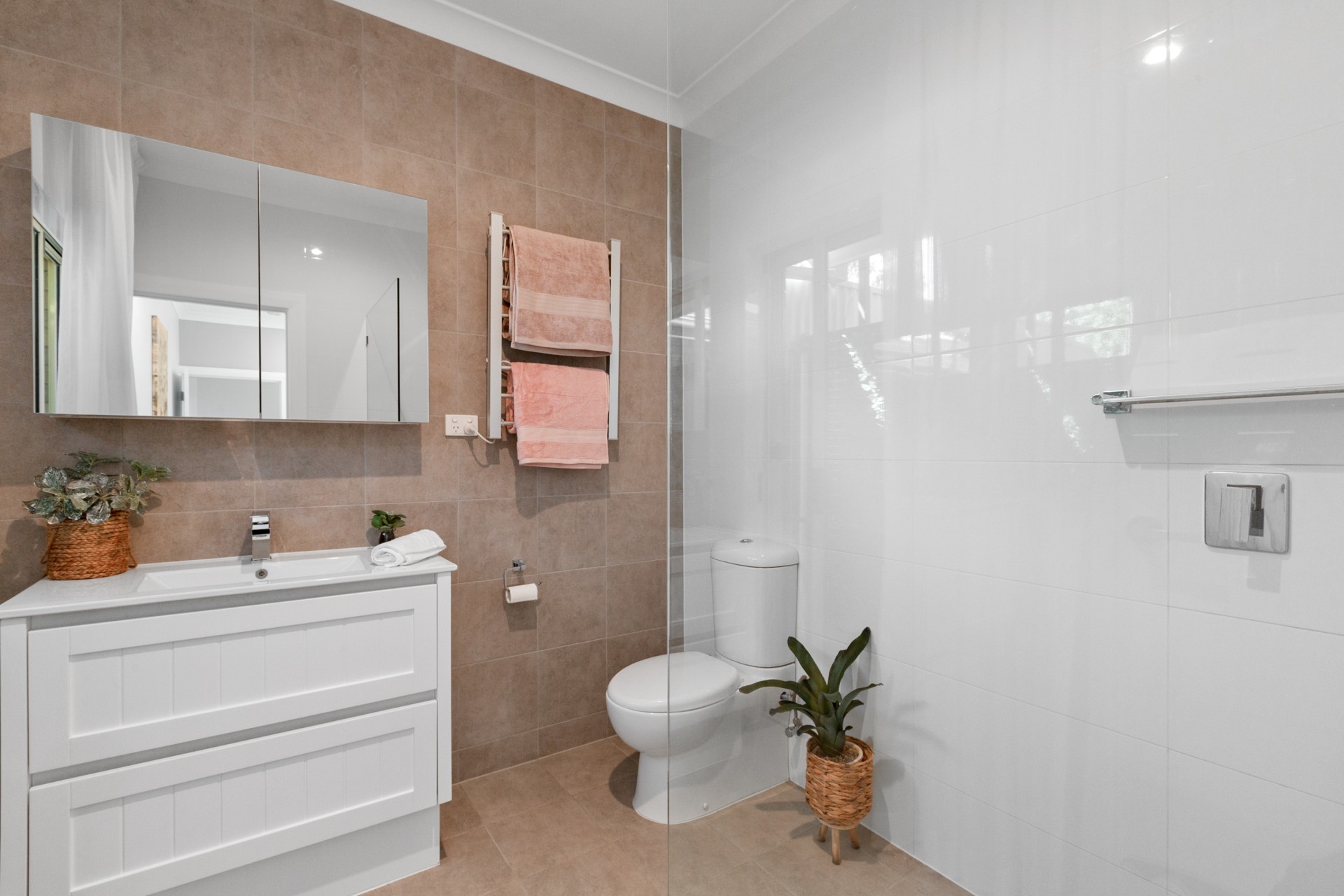 Three of the bedrooms are zoned away from the main bedroom, with access to an updated bathroom with floor to ceiling tiles, toilet, and laundry.