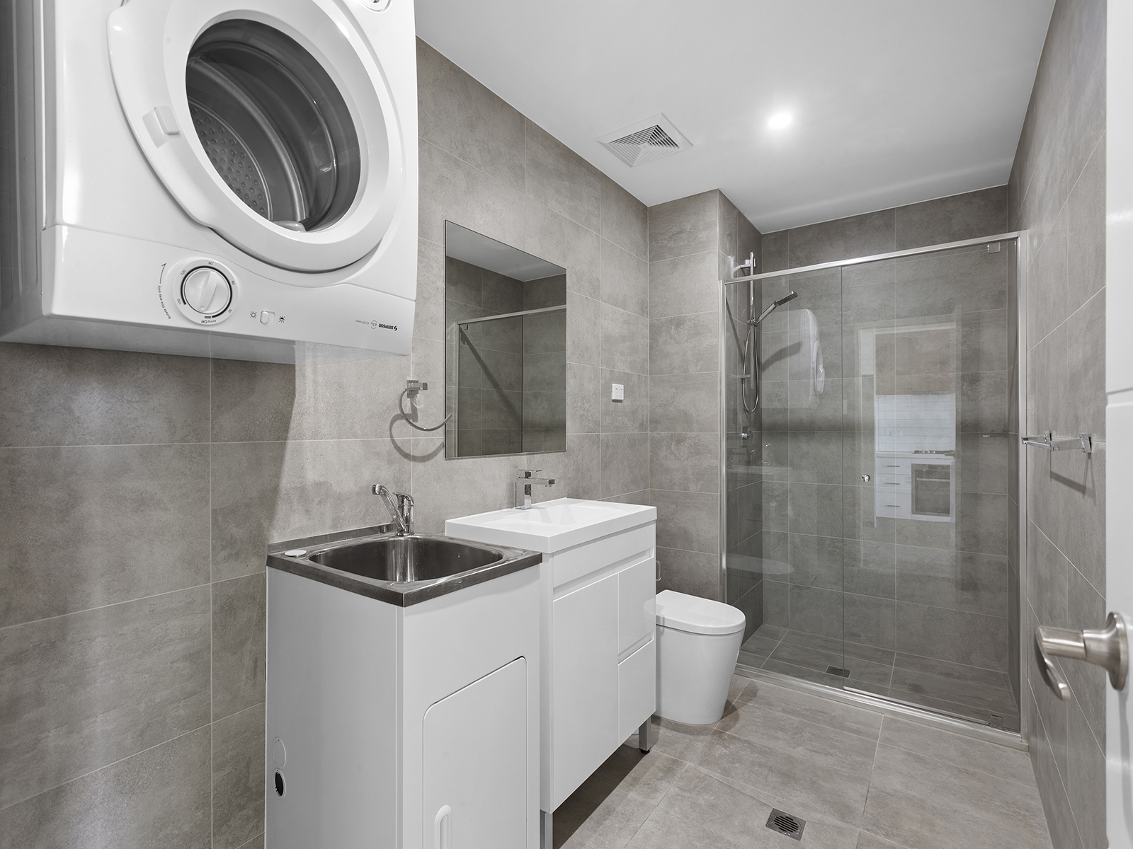 Efficient combined bathroom laundry, frameless glass shower