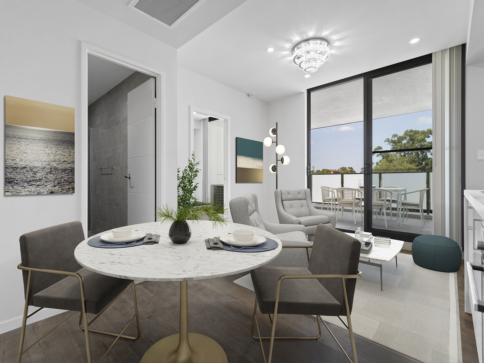 Open plan living and dining with pin spot down lighting