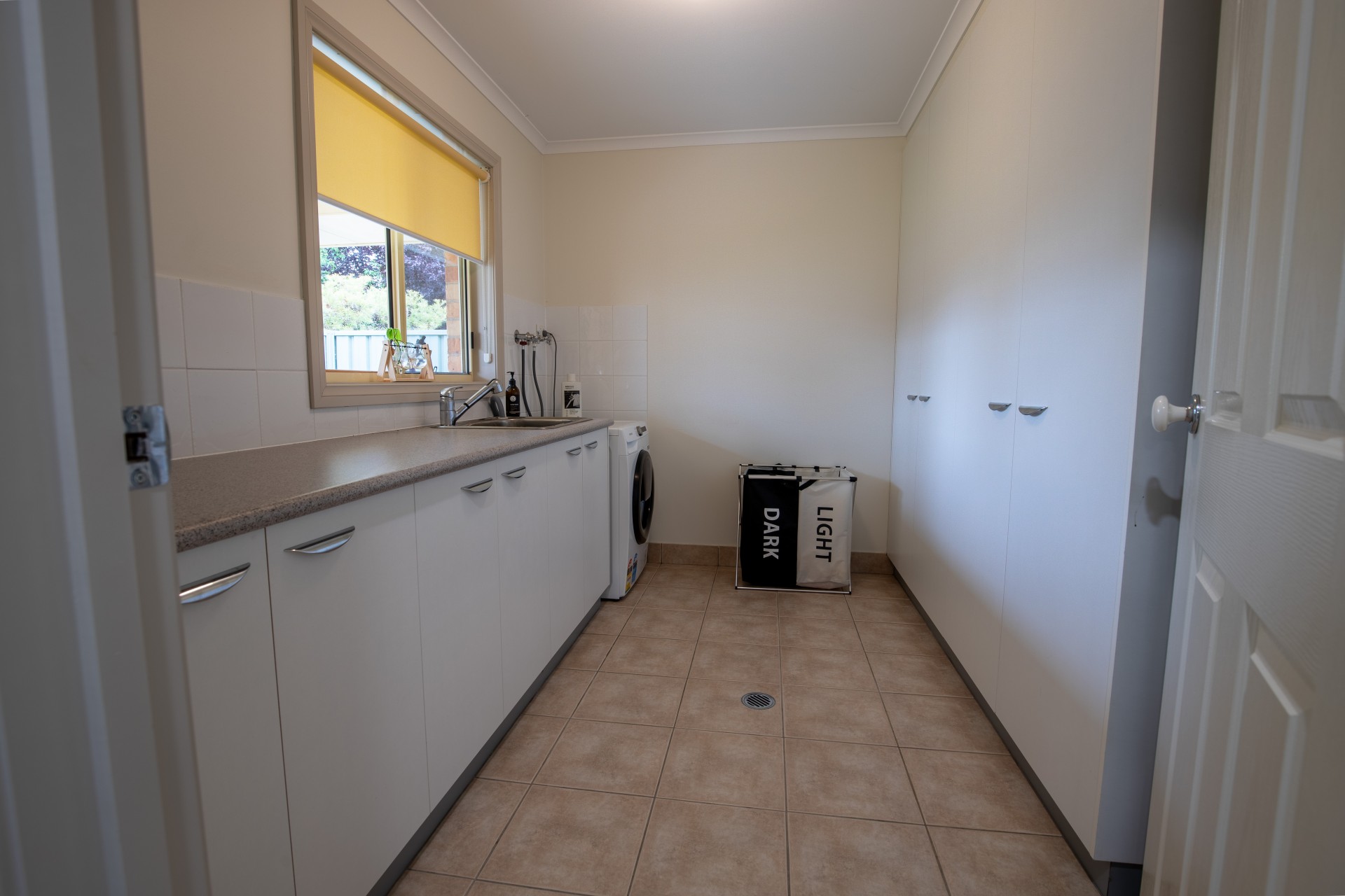 The laundry offers plenty of storage with floor to ceiling cupboards for more storage and wall to wall under bench storage.