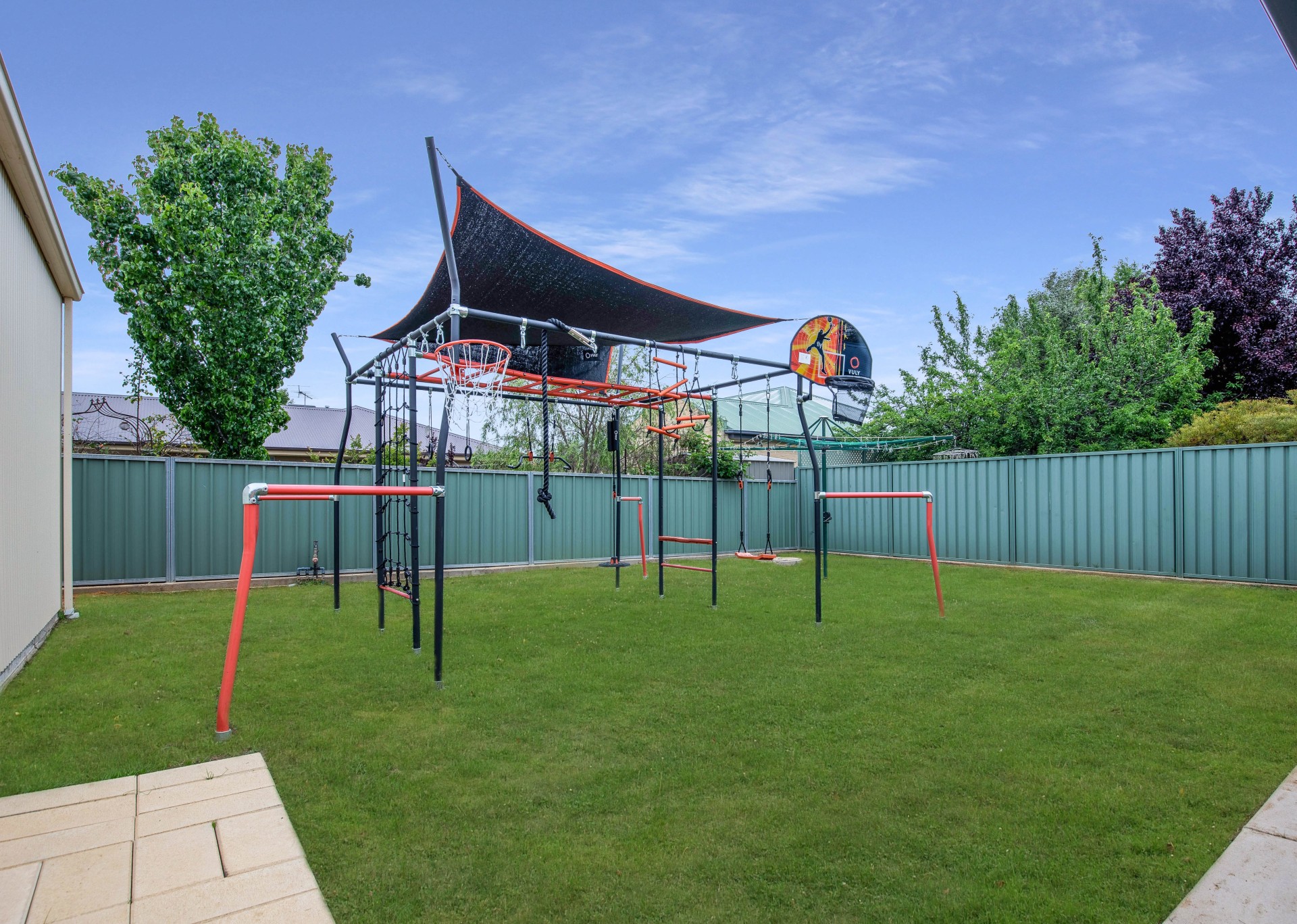 Fully fenced yard, low maintenance gardens which has a sprinkler system both front and back.