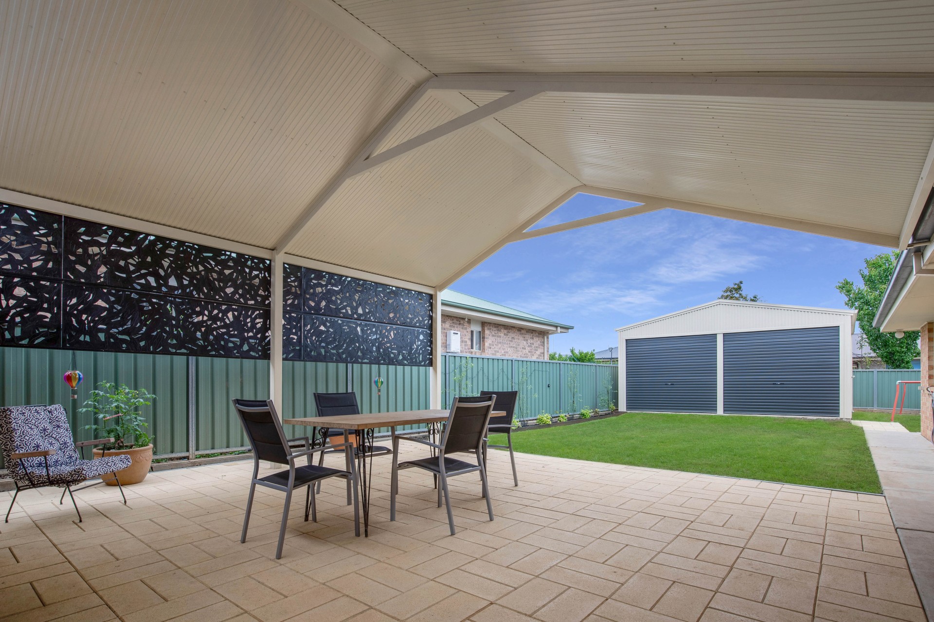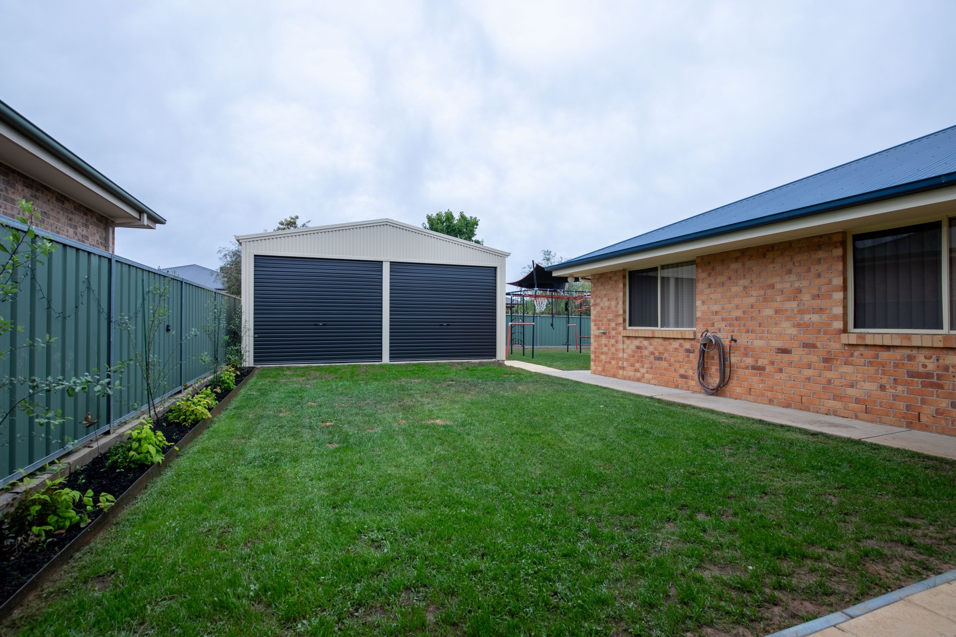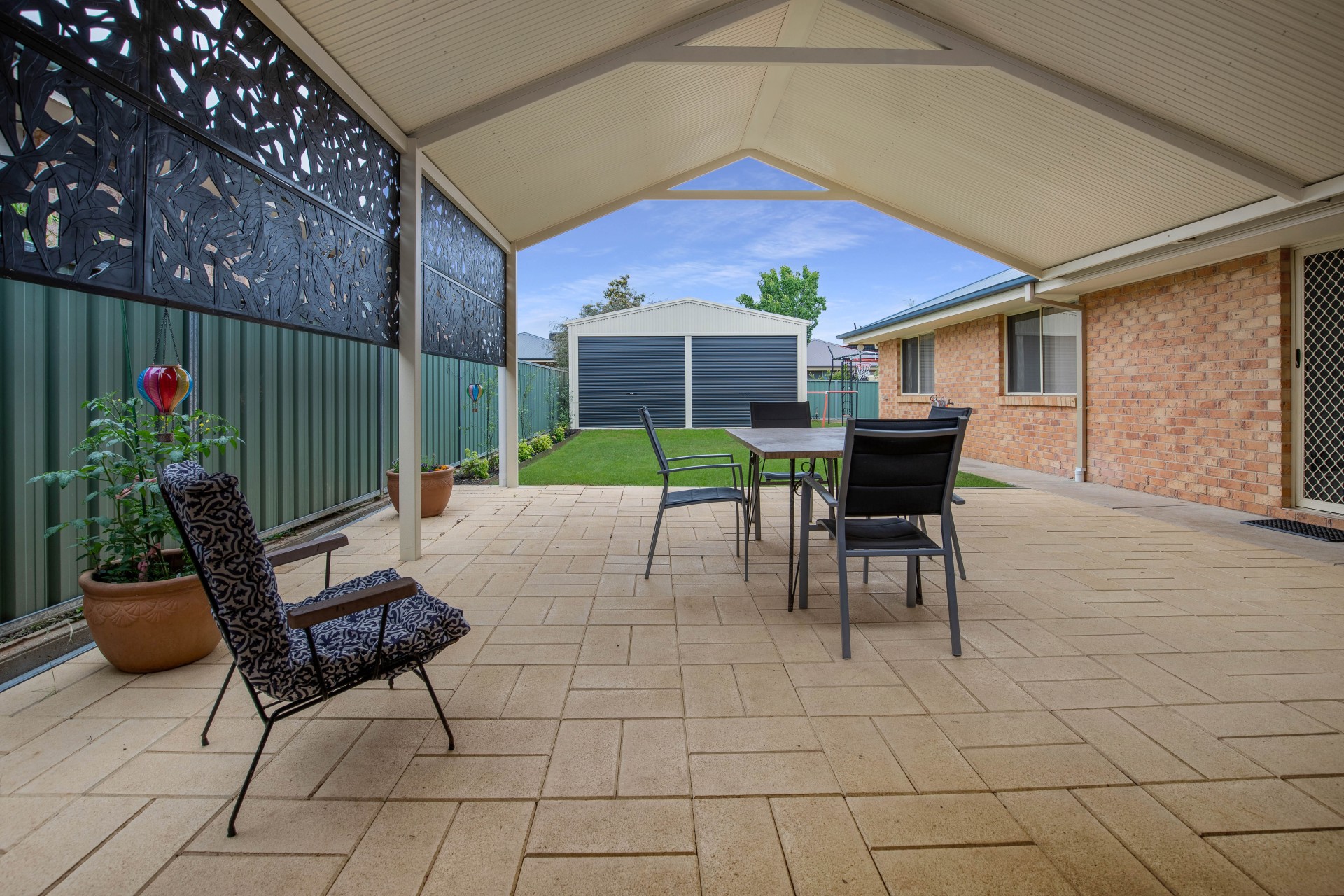 Stepping outside you enter onto an undercover Alfresco area overlooking the established gardens and down the yard is a brand new powered 6m x 6m double roller door color bond shed with drive through access from double car garage.