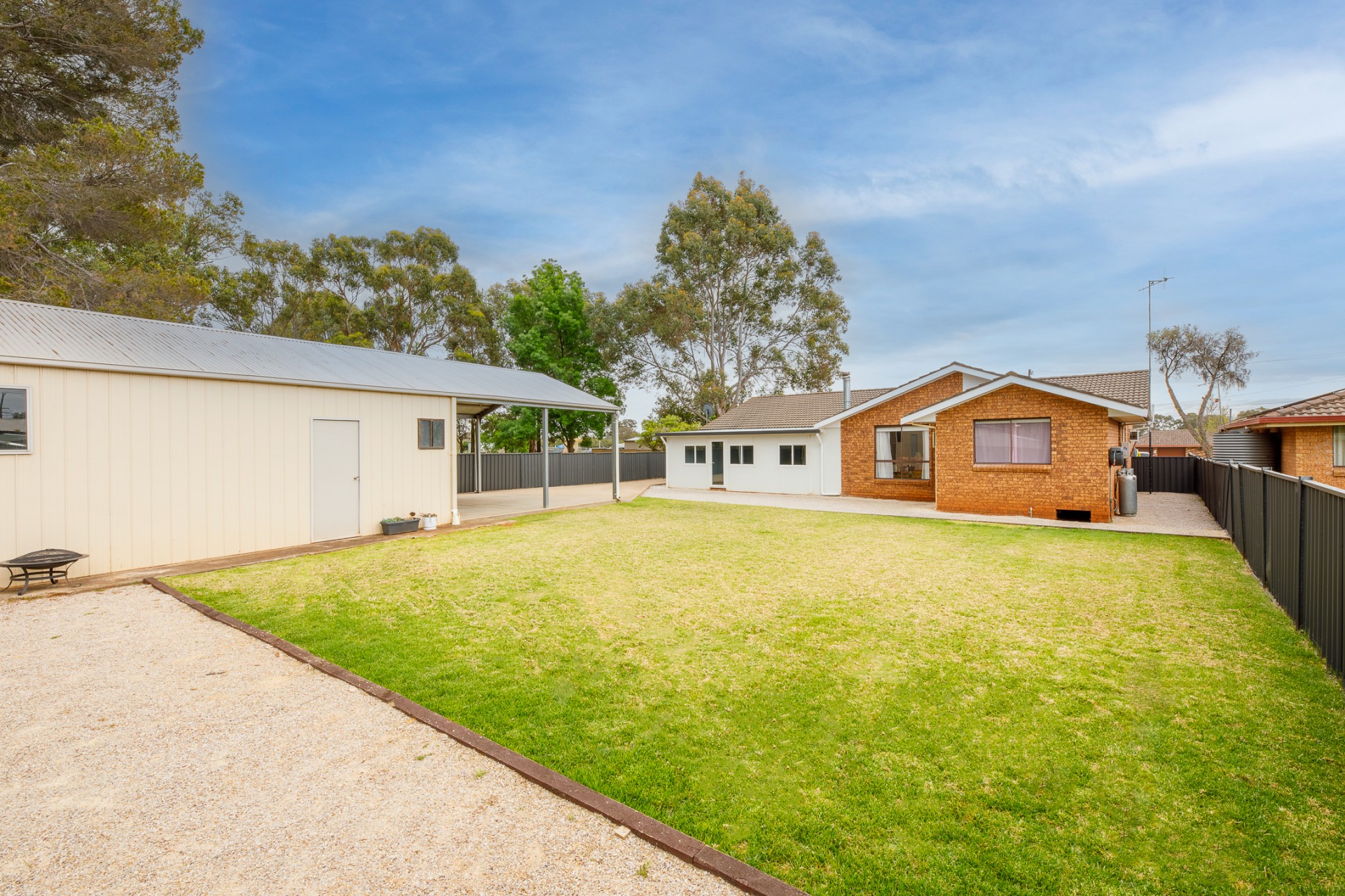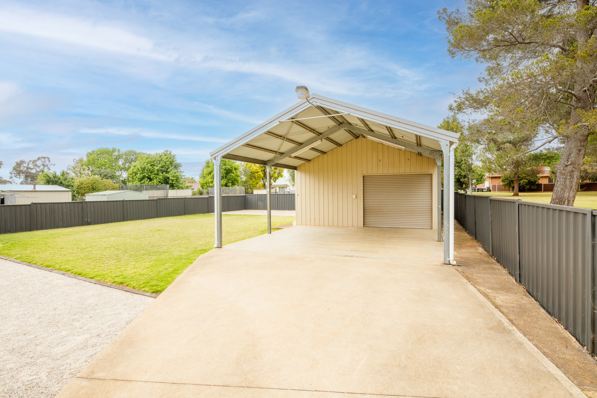 Large side access block leading to a 14m x 6m shed and carport perfect for the caravan. boat and bikes.