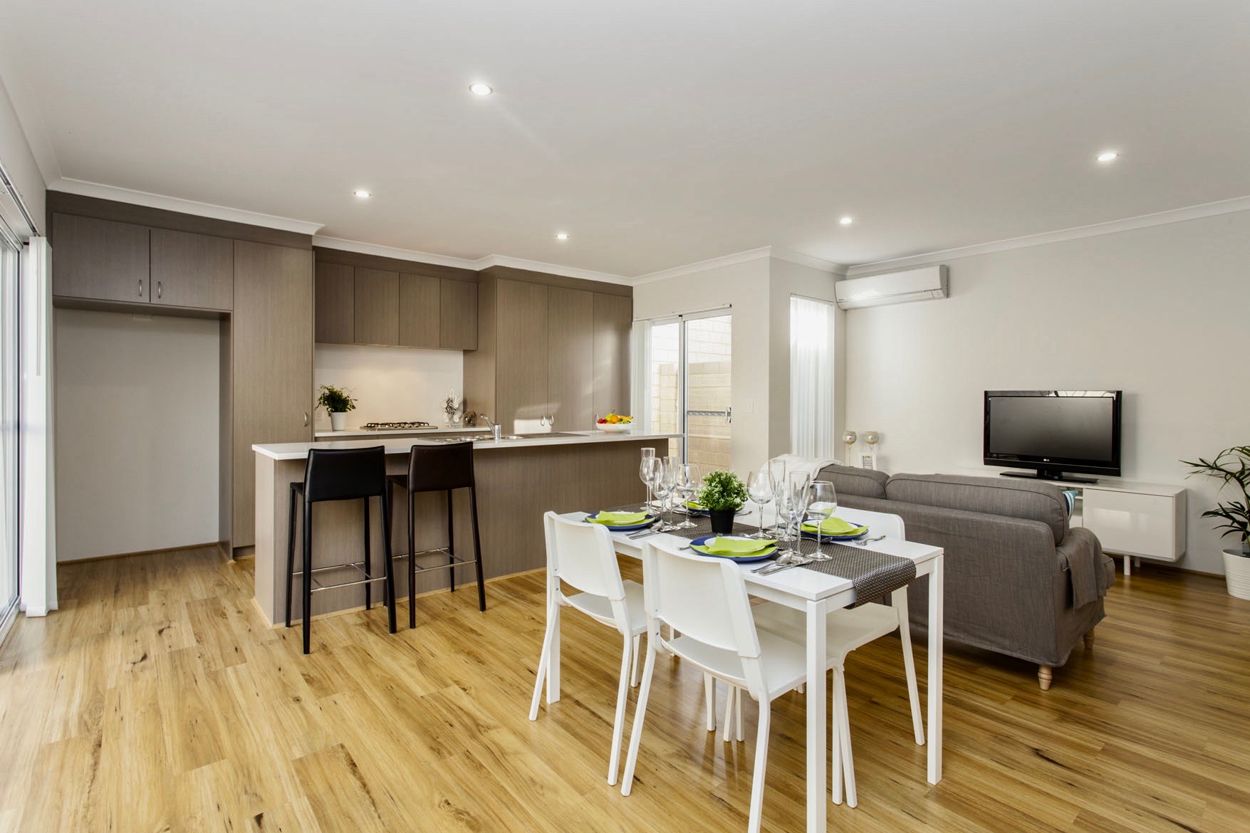 The home boasts a spacious open-plan kitchen and living area, enhanced by high ceilings and plenty of natural light, creating an airy atmosphere. Reverse cycle air conditioning in both the main living area and master bedroom ensures comfort throughout the year.