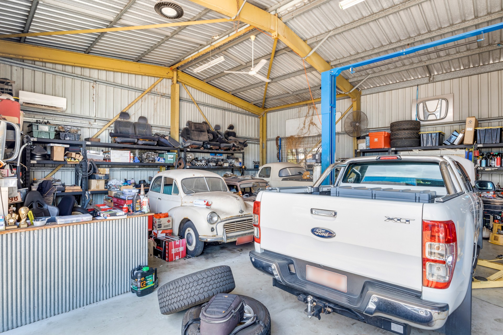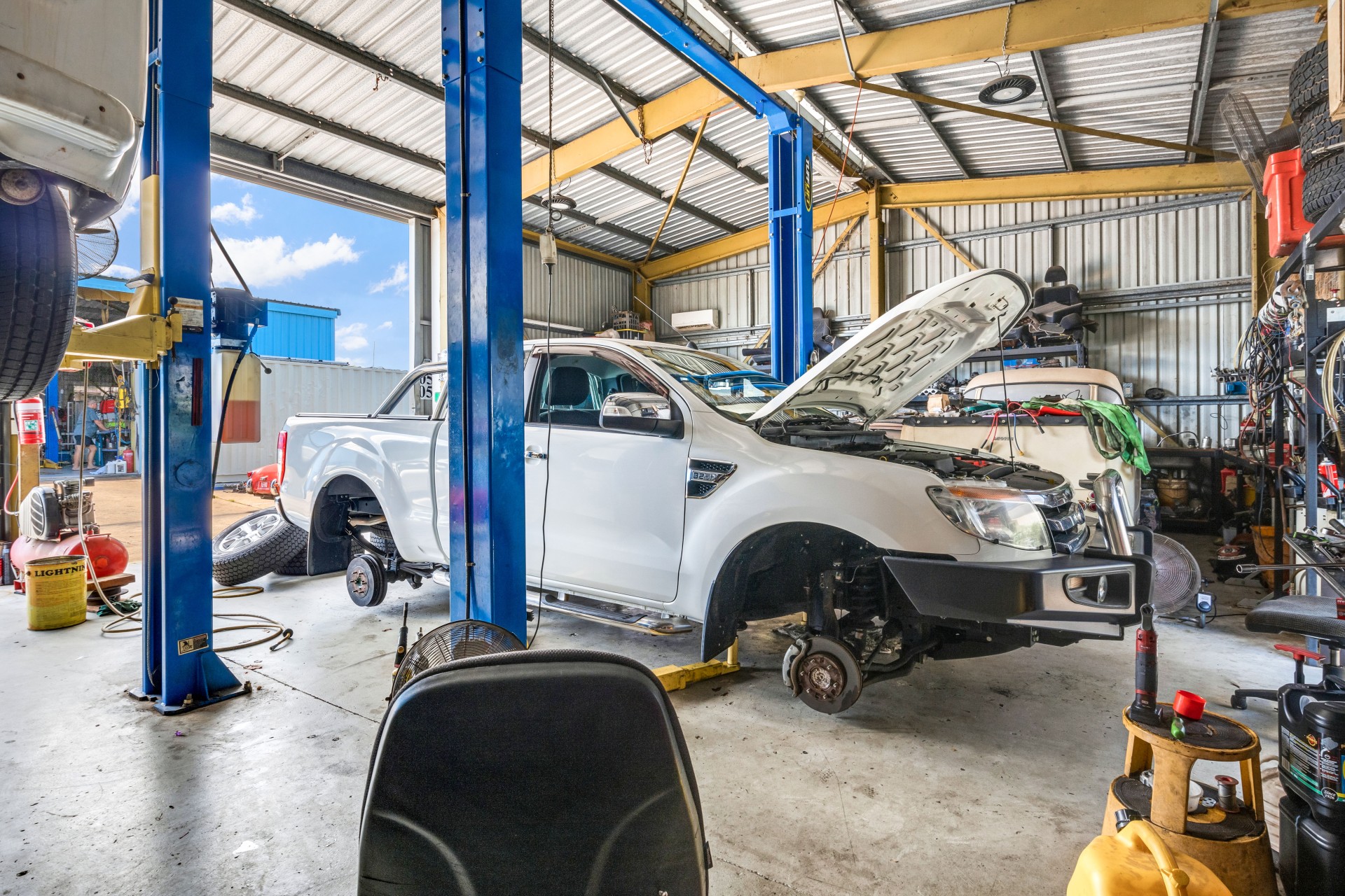The rear area is a long standing mechanical repair workshop, incorporating a warehouse and staff facilities.
