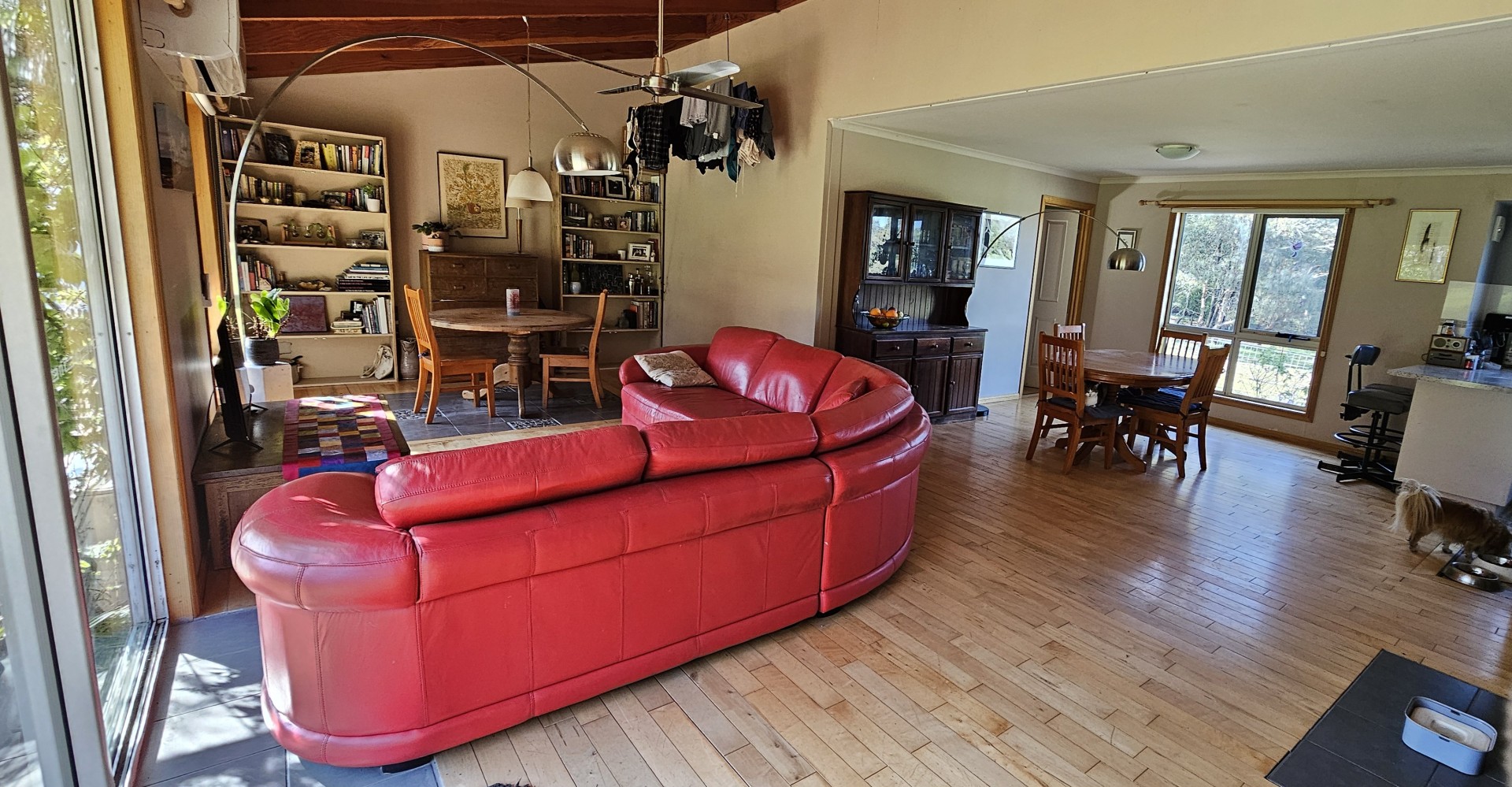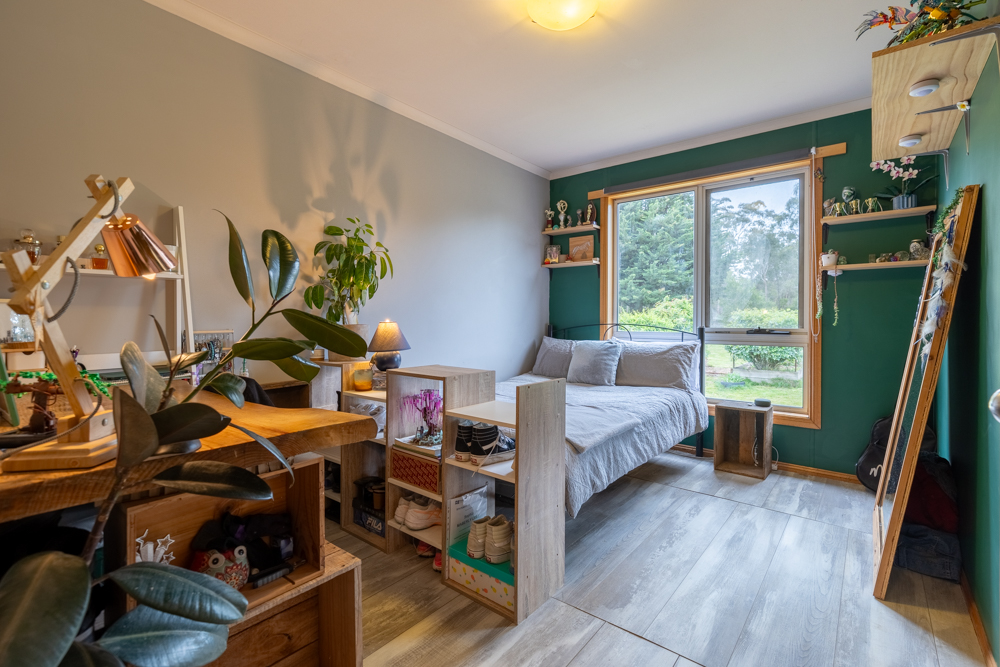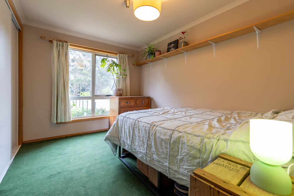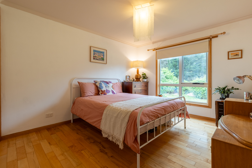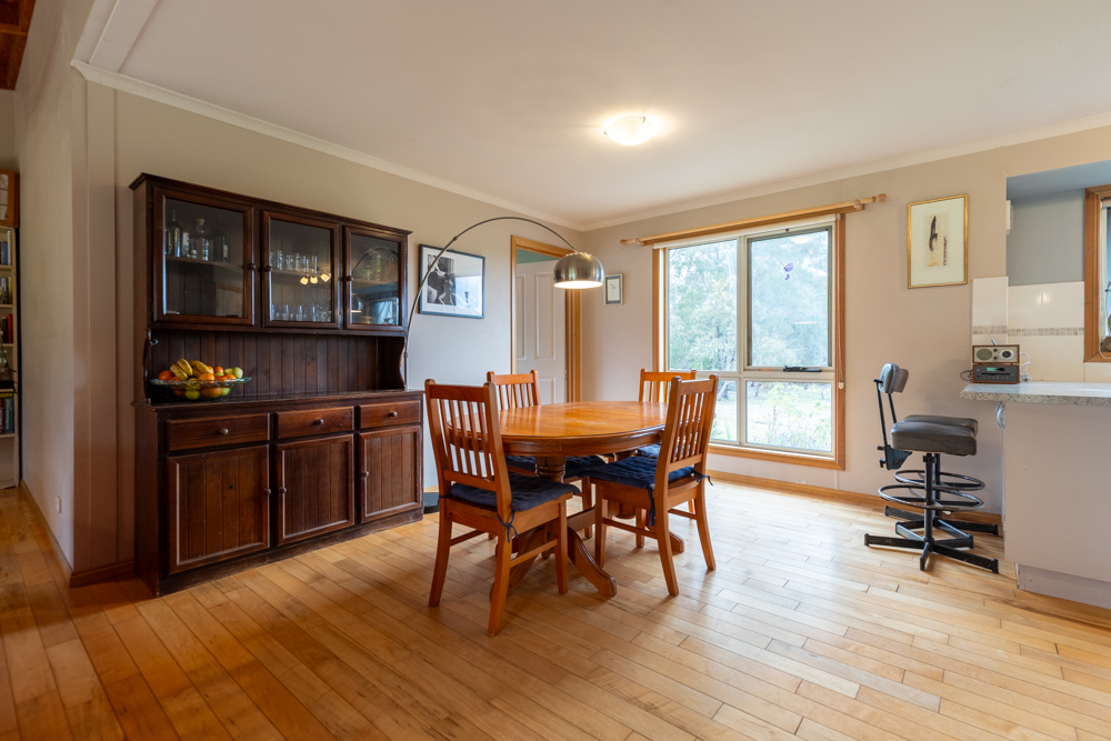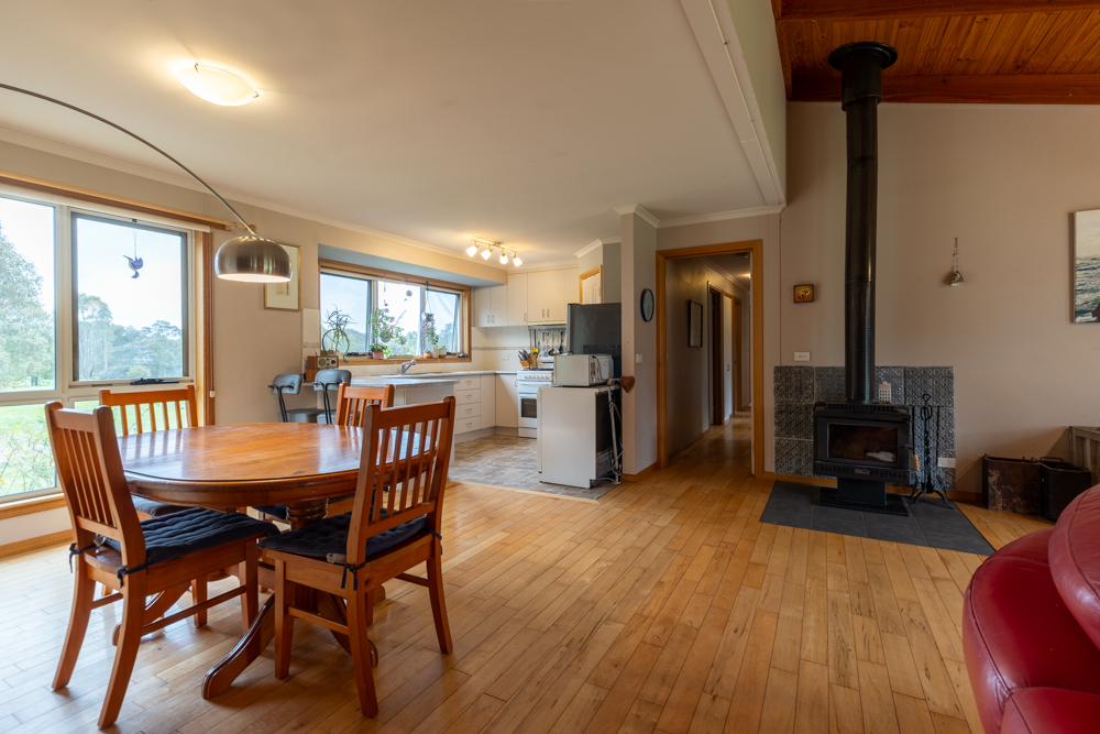 Built 11 years ago with passive solar principles, this house is aligned north, double glazed throughout, has a 2.5kw solar system, and additional wall, roof and floor insulation. Inside there are four light filled double bedrooms, 3 with built in robes, and an office or fifth bedroom. There is one full bathroom, with toilet, and an additional toilet from the laundry. The inviting living space with cedar cathedral ceiling, offers a wood-burning stove and heat pump heating/cooling split system for year-round comfort. Summer Electricity bills are often less than $10/month. Solid maple flooring, recently sanded and resealed, provides comfort under foot, cool in summer, warm in winter. The instant gas hot water system provides unlimited hot water.