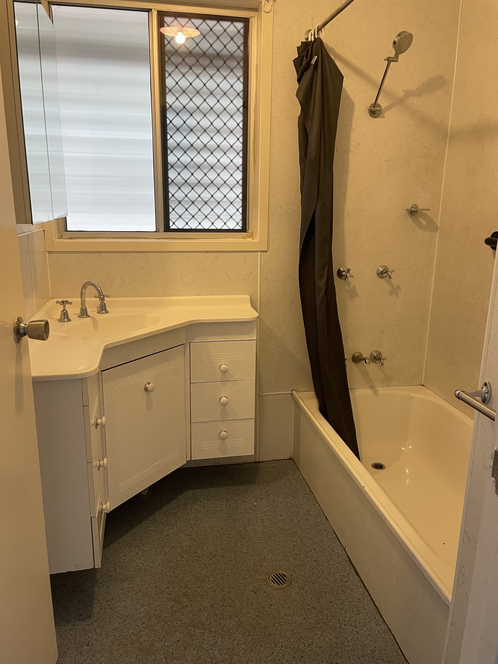 Bath/shower combo inc. corner vanity basin.
