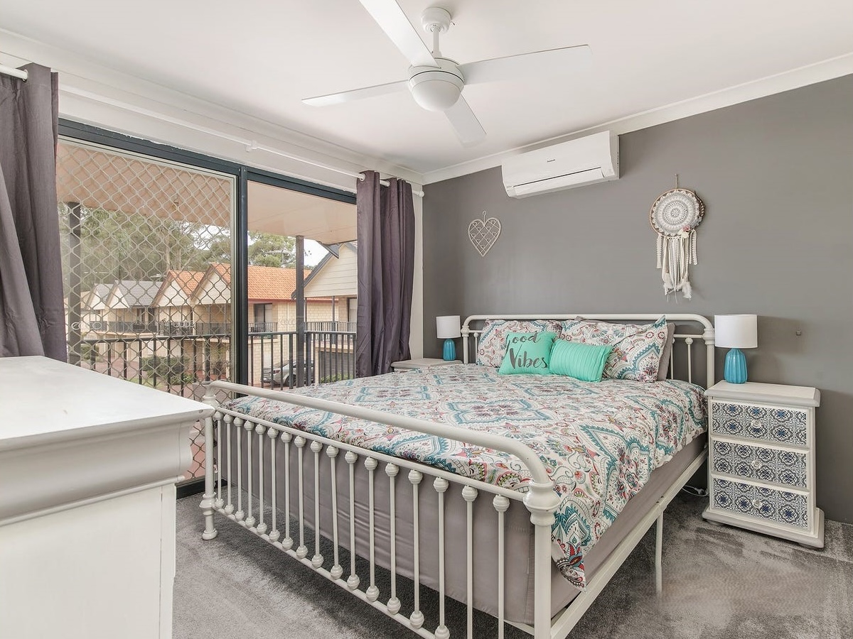 Upstairs you have a living area and king-size master bedroom with walk-in robe and semi en-suite bathroom with shower, single vanity and bath. Both living and master bedroom have air conditioning and are situated at the front of the property. They are connected to the balcony with sliding and security doors. Further you will find 2 single bedrooms with built-in robes, a toilet and separate vanity area.