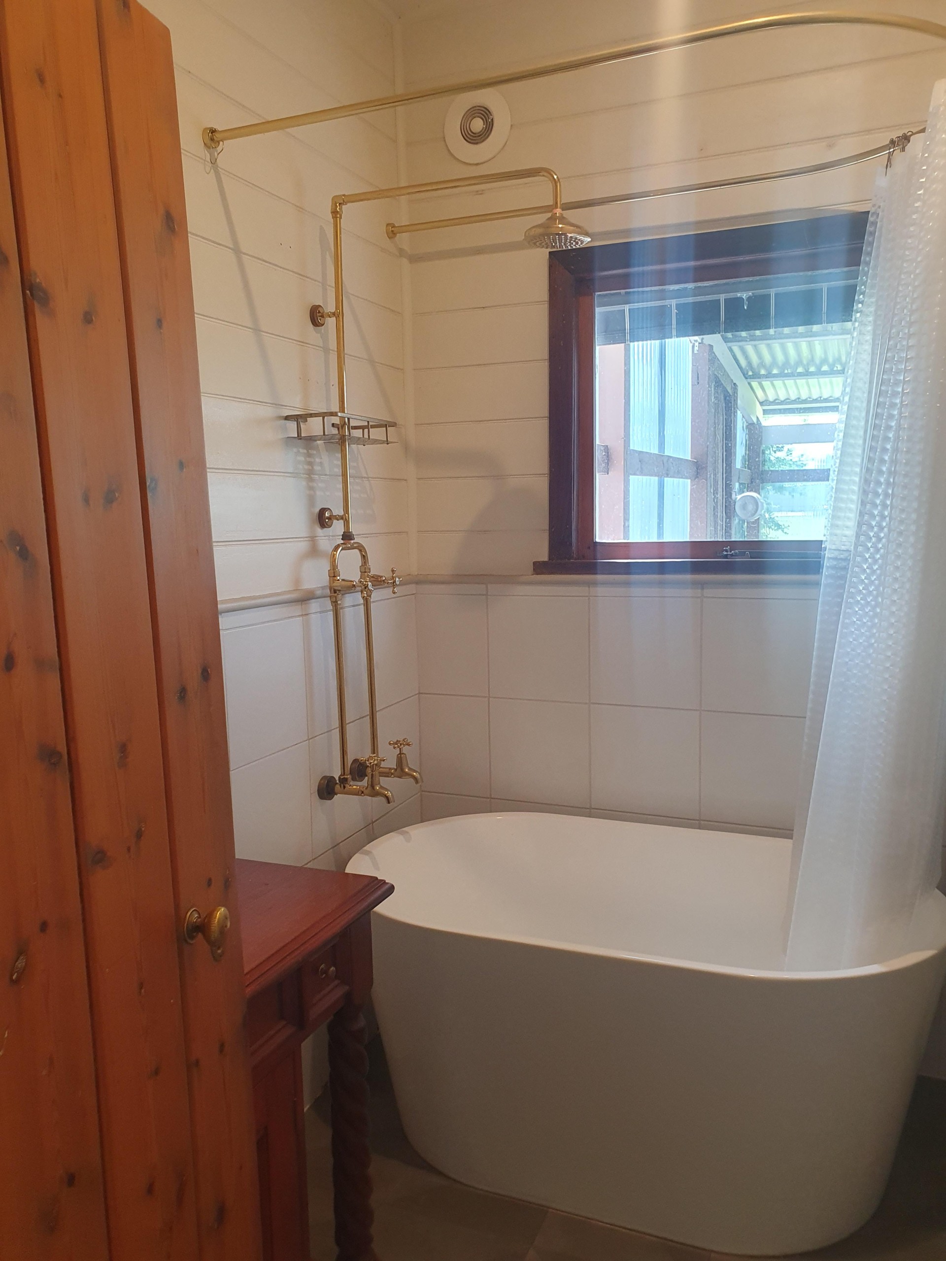 newly renovated, vinyl flooring, freestanding bath, overhead shower