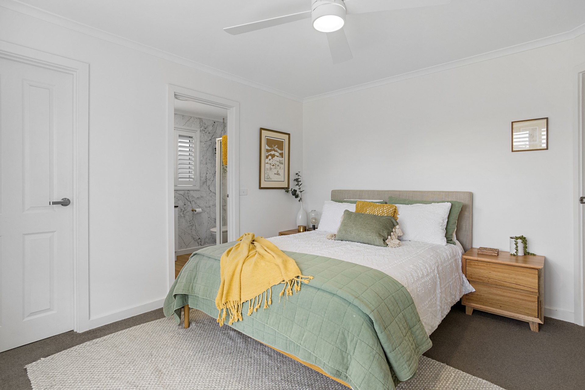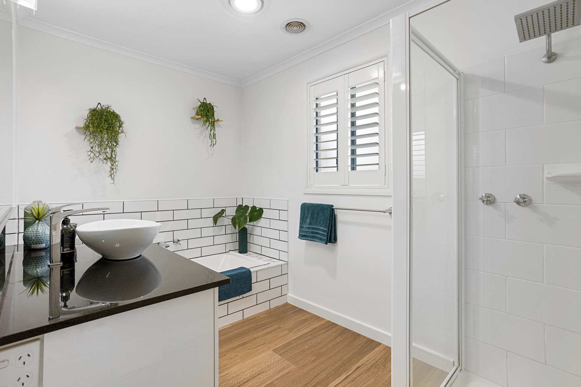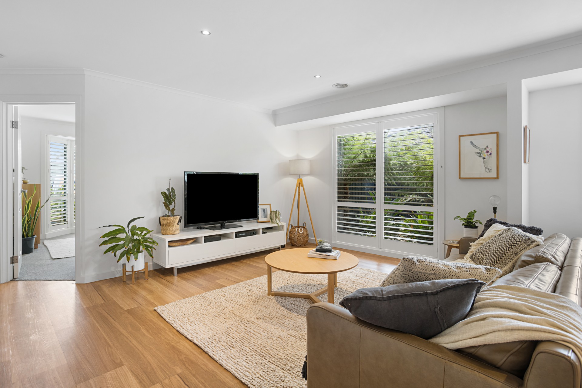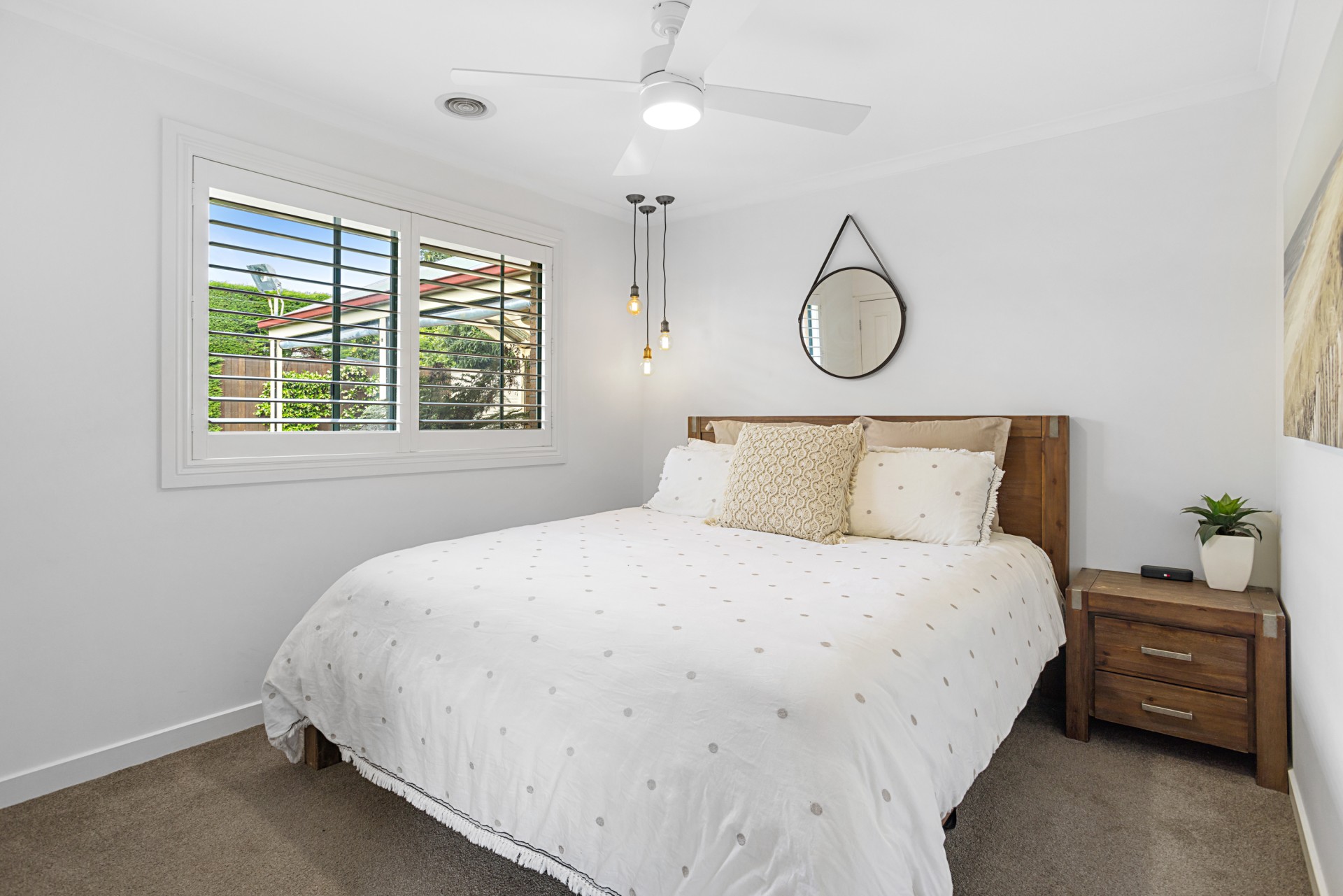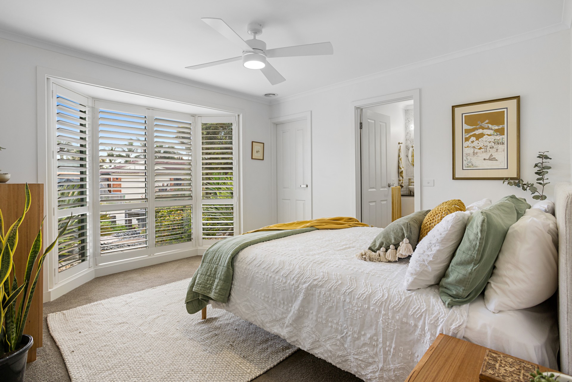 • Crisp, white plantation shutters for a timeless aesthetic