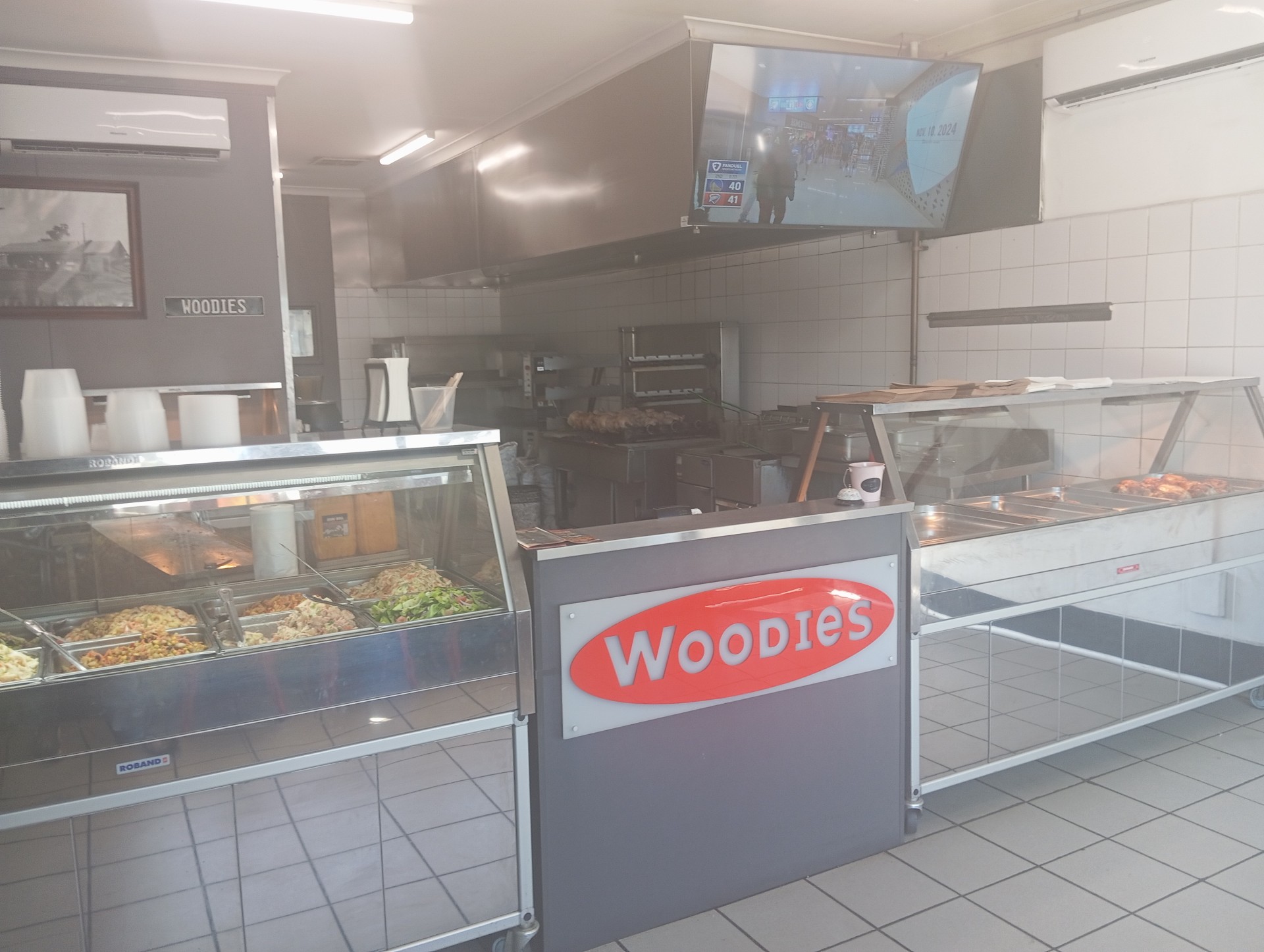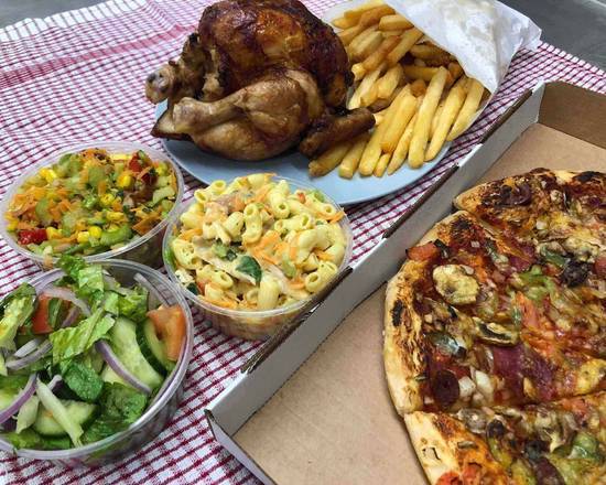 Charcoal Chicken, Pizza , Chips and 10 Fresh Home Made Salads made daily