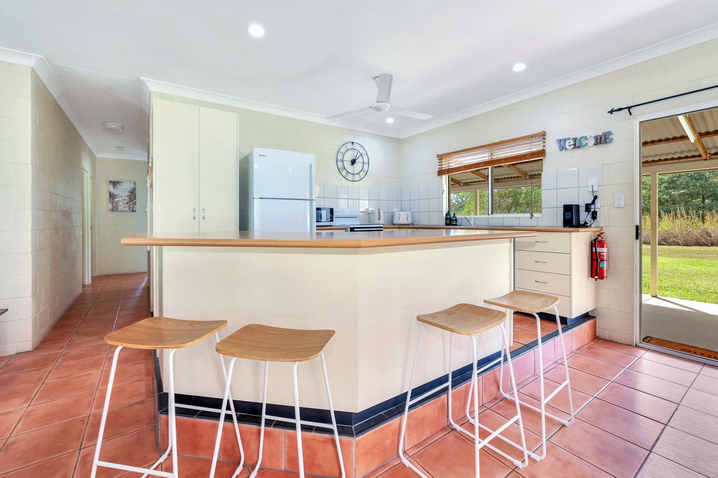 Sliding doors lead through to the outdoor areas making the flow from indoors to out almost seamless. Step up into the kitchen with wrap around counters and banks of built in storage space and prep counters with breakfast bar seating.