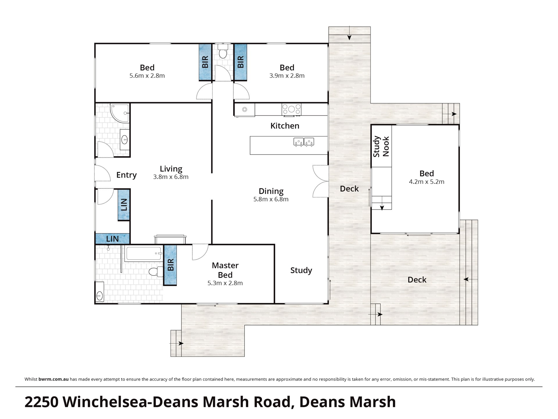 Comfort is not a problem with brand new ducted heating and cooling throughout the house and the studio, plus a large wood fire in the lounge area. The outdoor deck is enormous and the timber pathways around the house are wide and beautiful. The garden is lush and well established, and the orchard is full of fruit. Two large water storage tanks provide water throughout the year, with substantial catchment from the new galvanised steel roof. The property is complete with a brand new shed and off-street parking for multiple vehicles and trailers, with two private entrances from the Winchelsea-Deans Marsh Road.