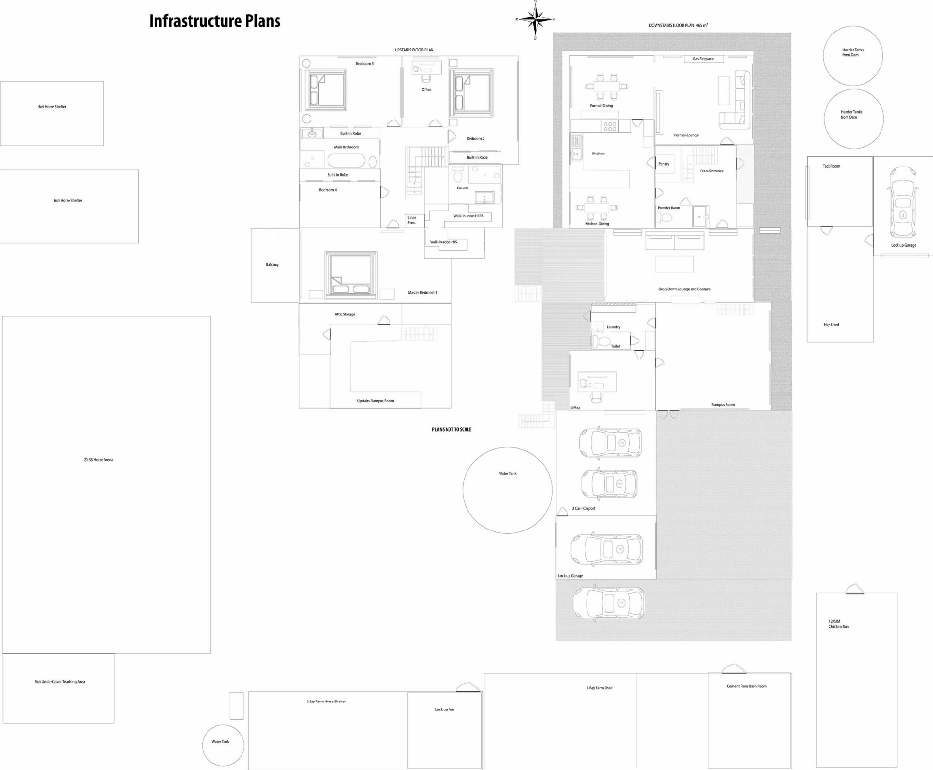 Outside you have a 2 car under cover carport, 2 lock up garages, 2 tack rooms, hay shed, large 3 bay barn and multiple animal shelters. There are 2 x 25,000 litre header tanks that are connected to the Dam for ample garden watering and a 25,000 gallon fresh water tank for the home.
